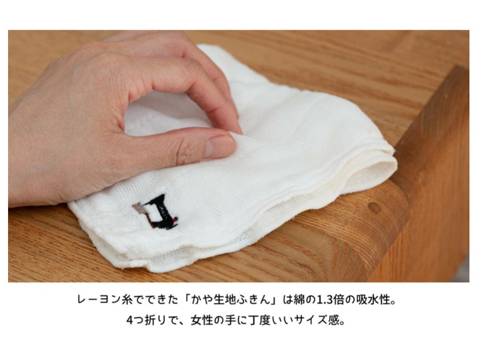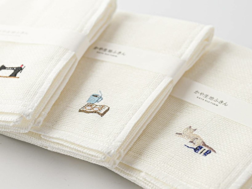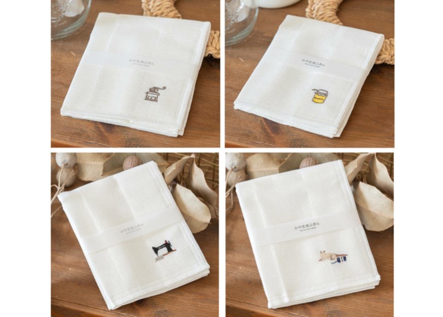 日本で唯一残っている蚊帳(かや)産地奈良県で時間をかけて丁寧に織られた蚊帳生地の布巾に、和歌山県で刺繍やプリントを施した「かや生地ふきん」。