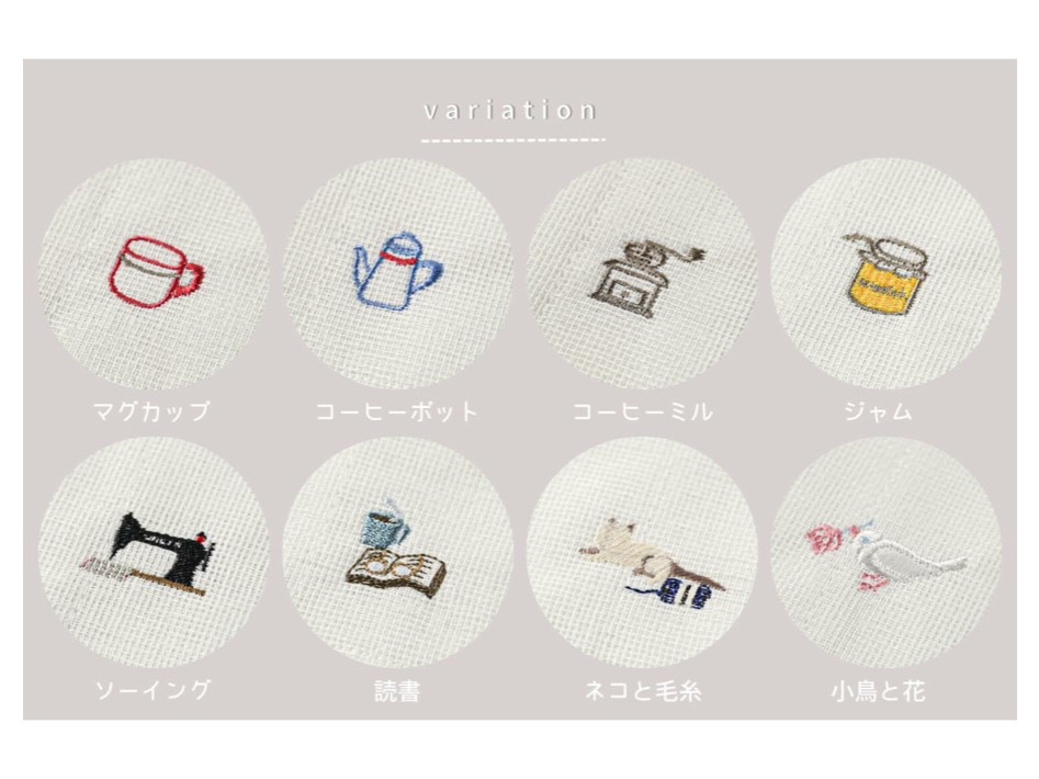 カフェタイムを思わせる、可愛いらしいワンポイント刺繍が毎日にほほ笑みを。