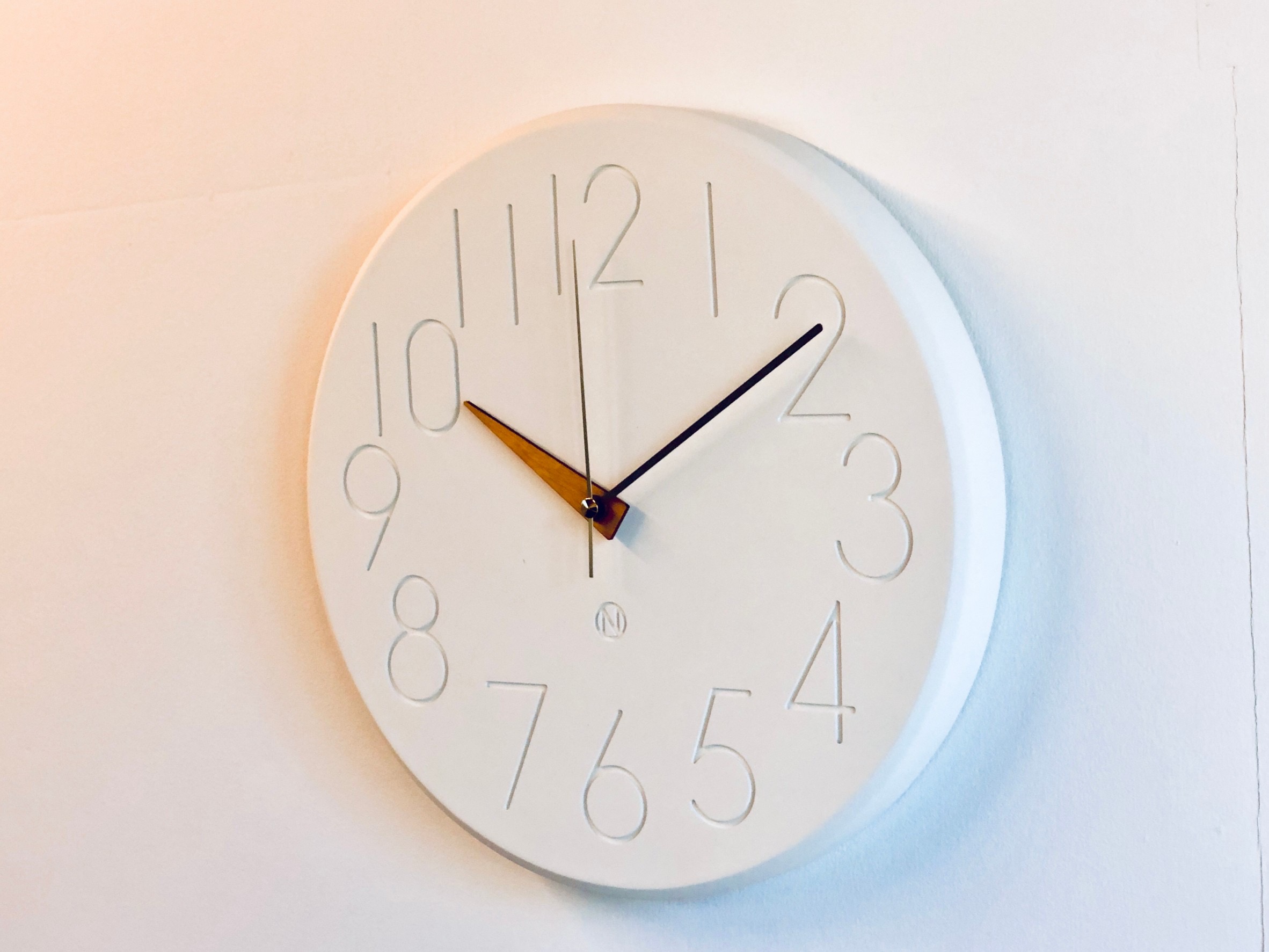 ポリレジンのサラリとした質感の文字盤に、ウッドの針を合わせたあたたかみのあるウォールクロック。