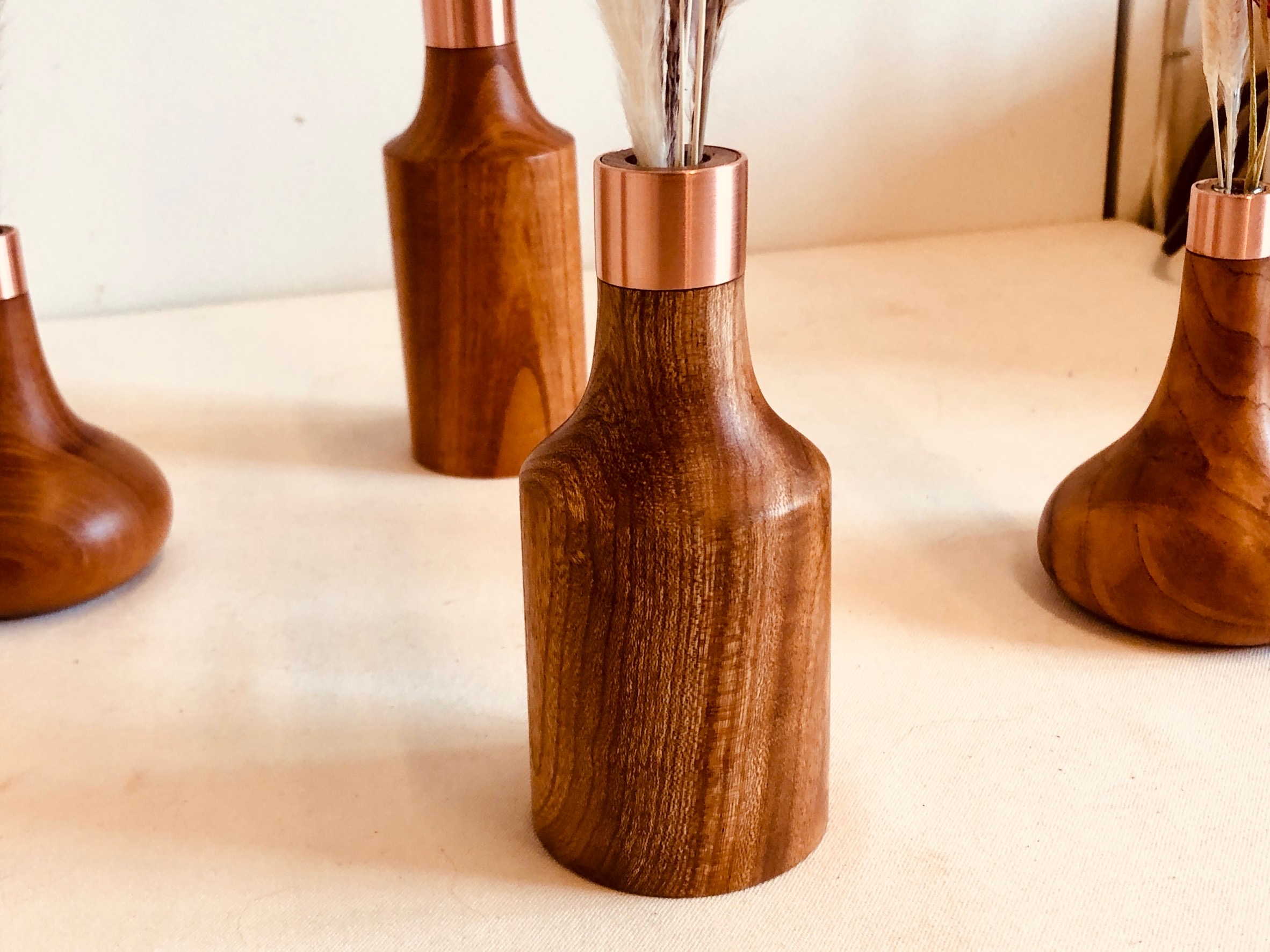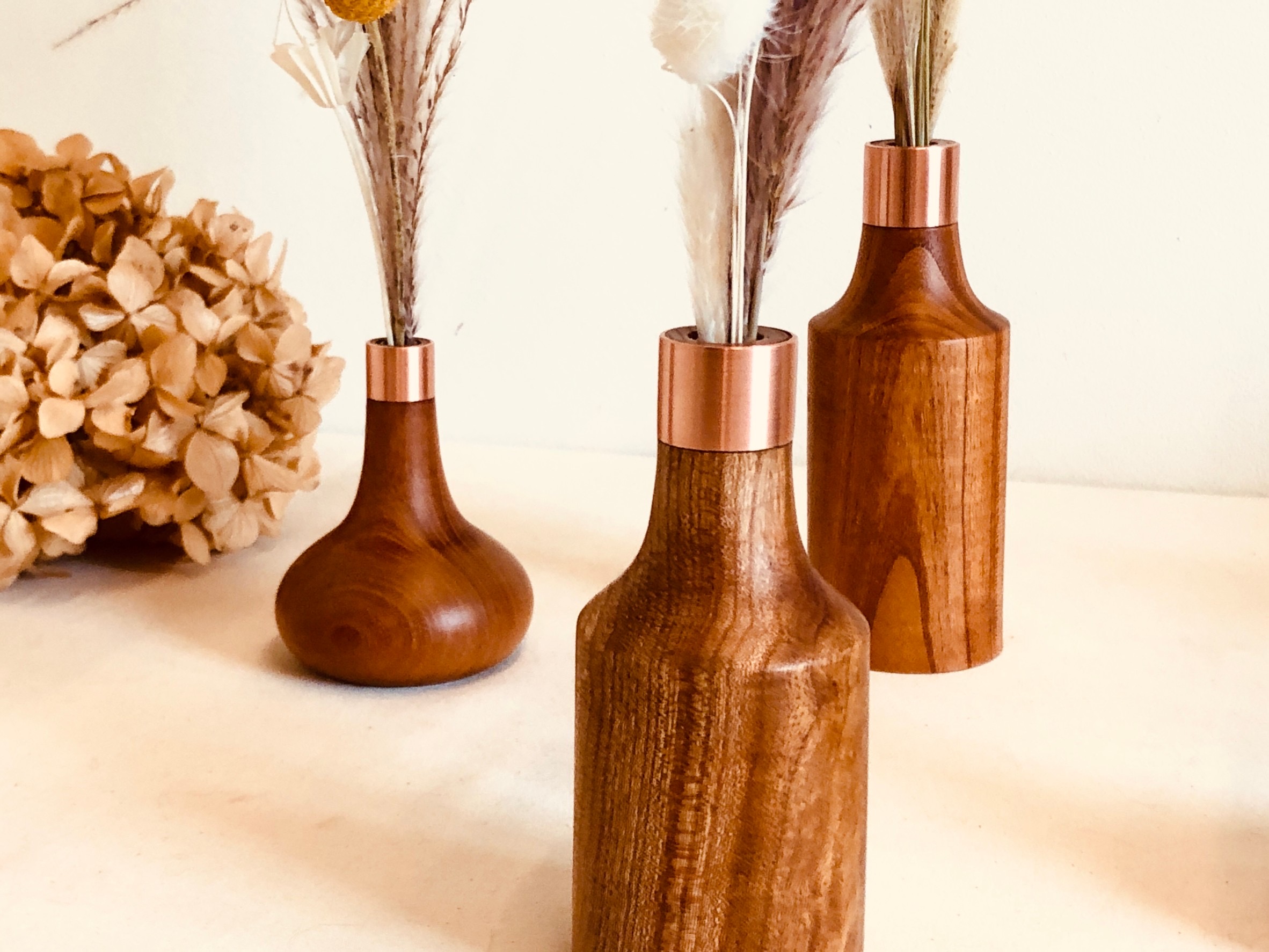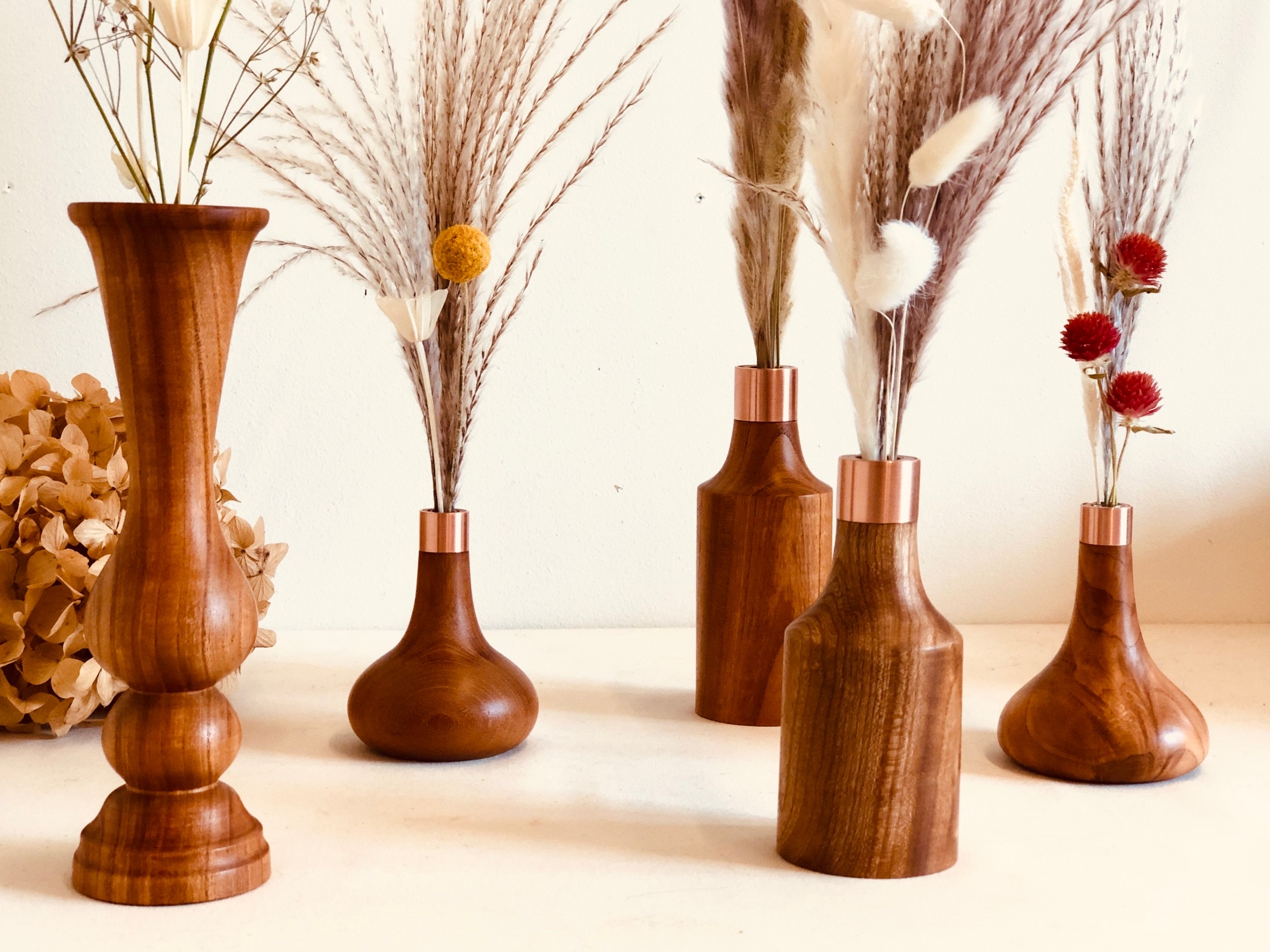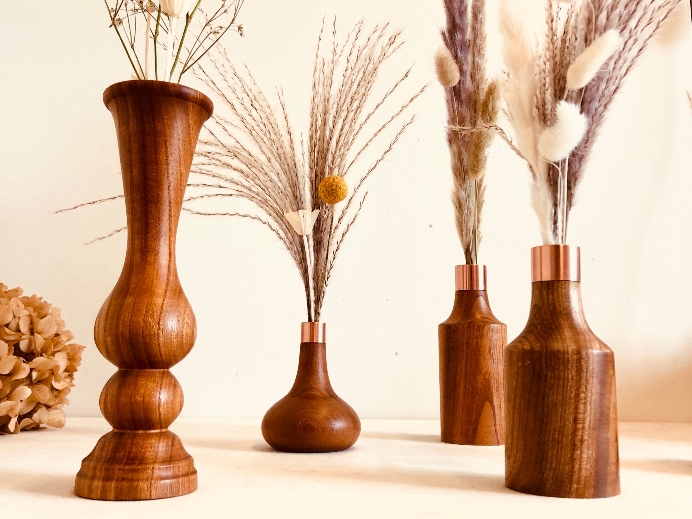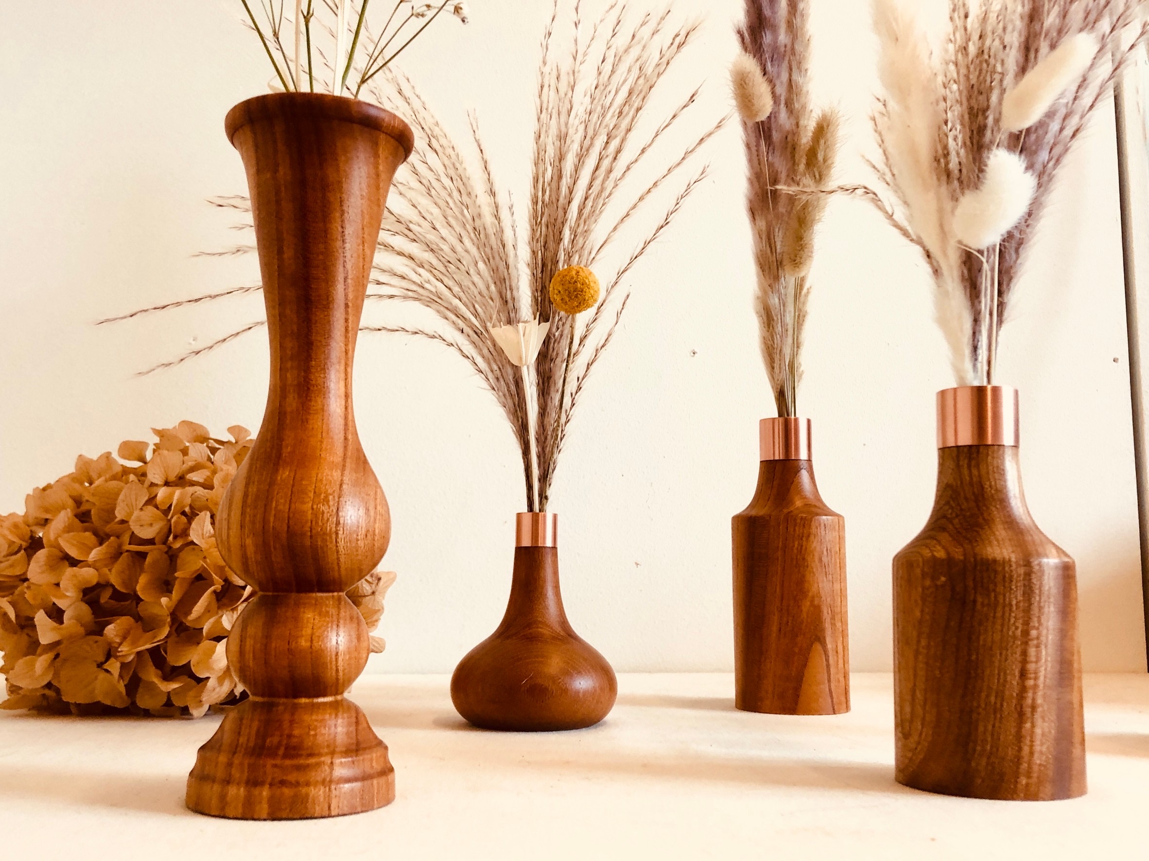 お気に入りのドライフラワーをウッドフラワーベースにディスプレイして、