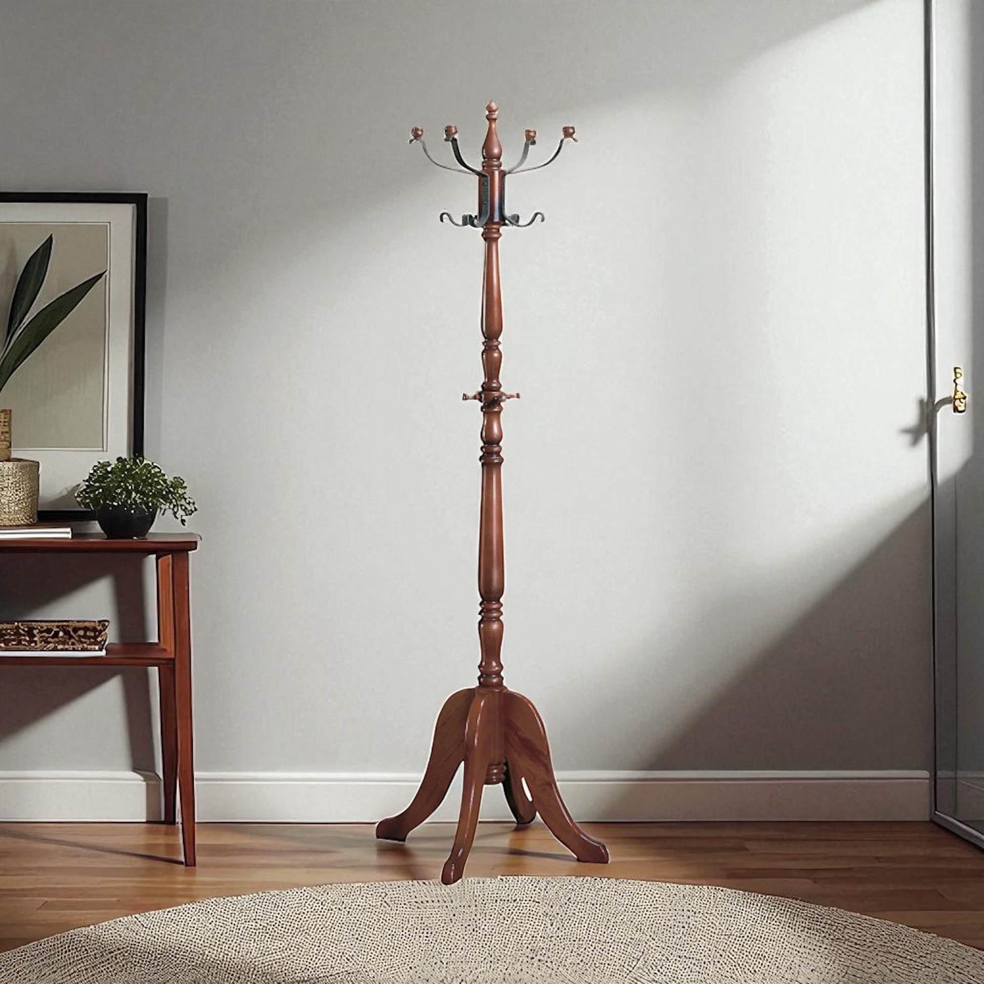 玄関先やお部屋に置いて、帰宅時やお出かけの際に帽子やコート、バッグなどさっと掛けるのに便利に使えます。