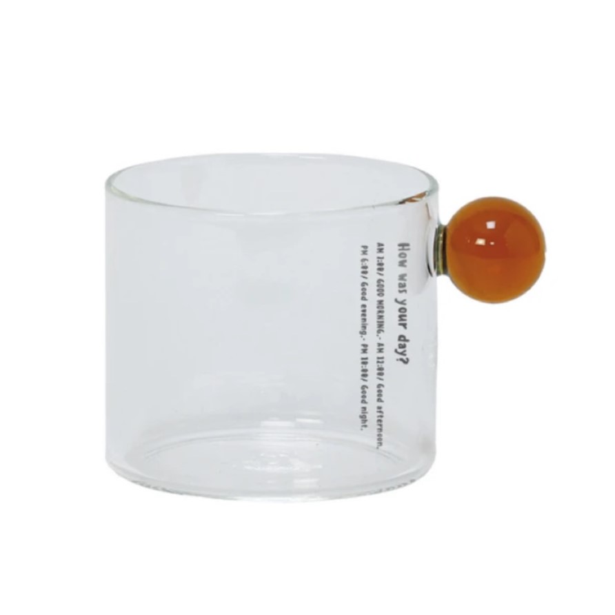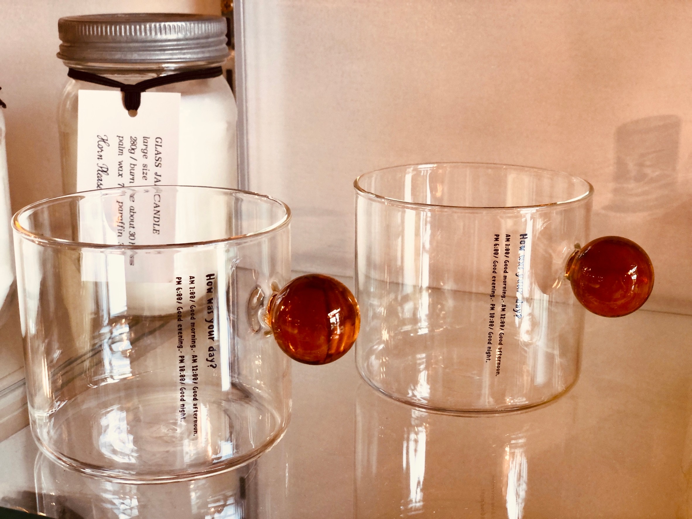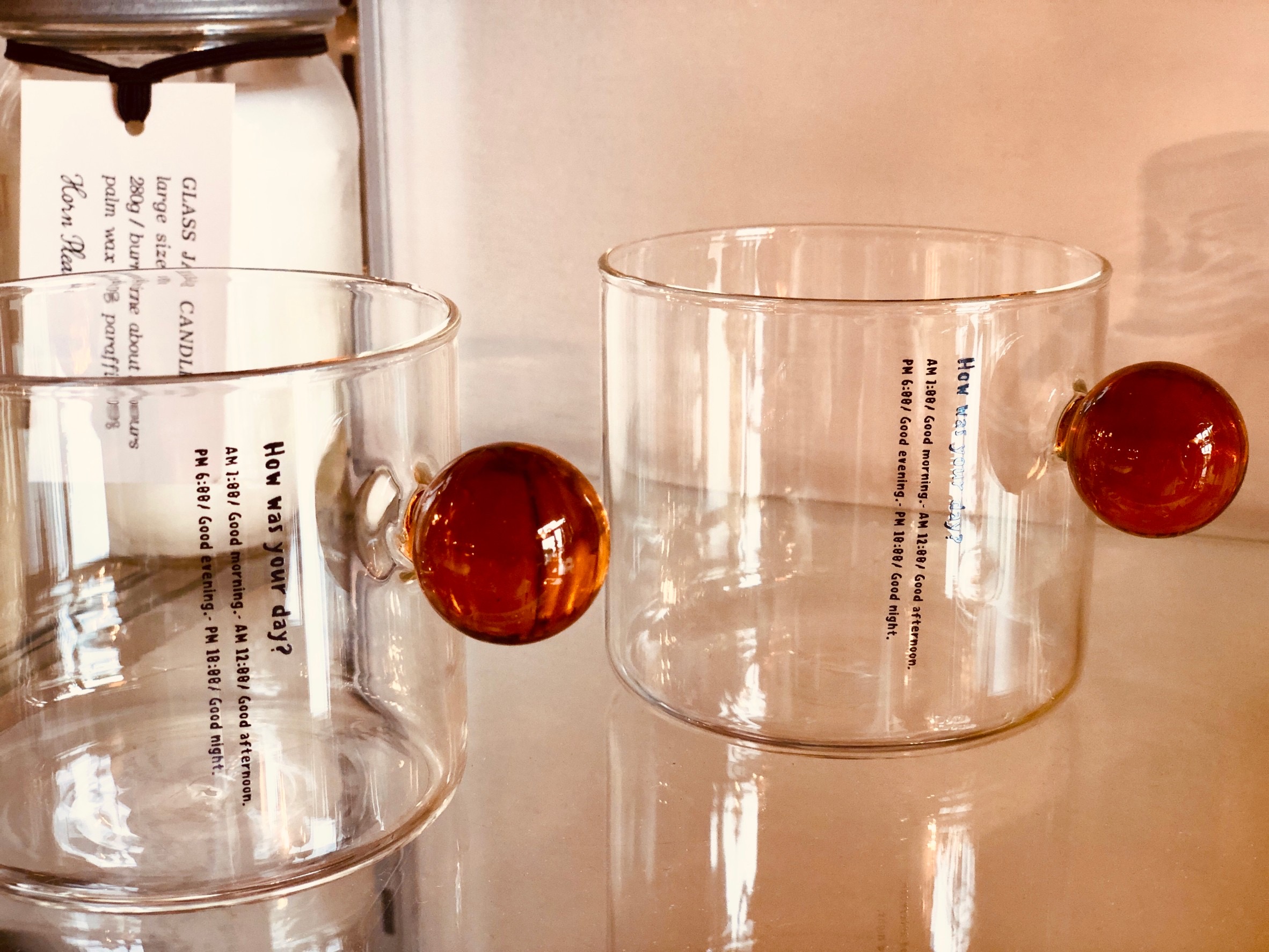 ラムネの瓶に入っているビー玉を思わせる、カラフルなガラス玉がくっついたグラス。