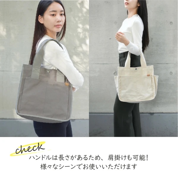 ハンドル部分は少し長く肩掛けも可能です。外ポケットは深めなので安心して荷物を入れられます。