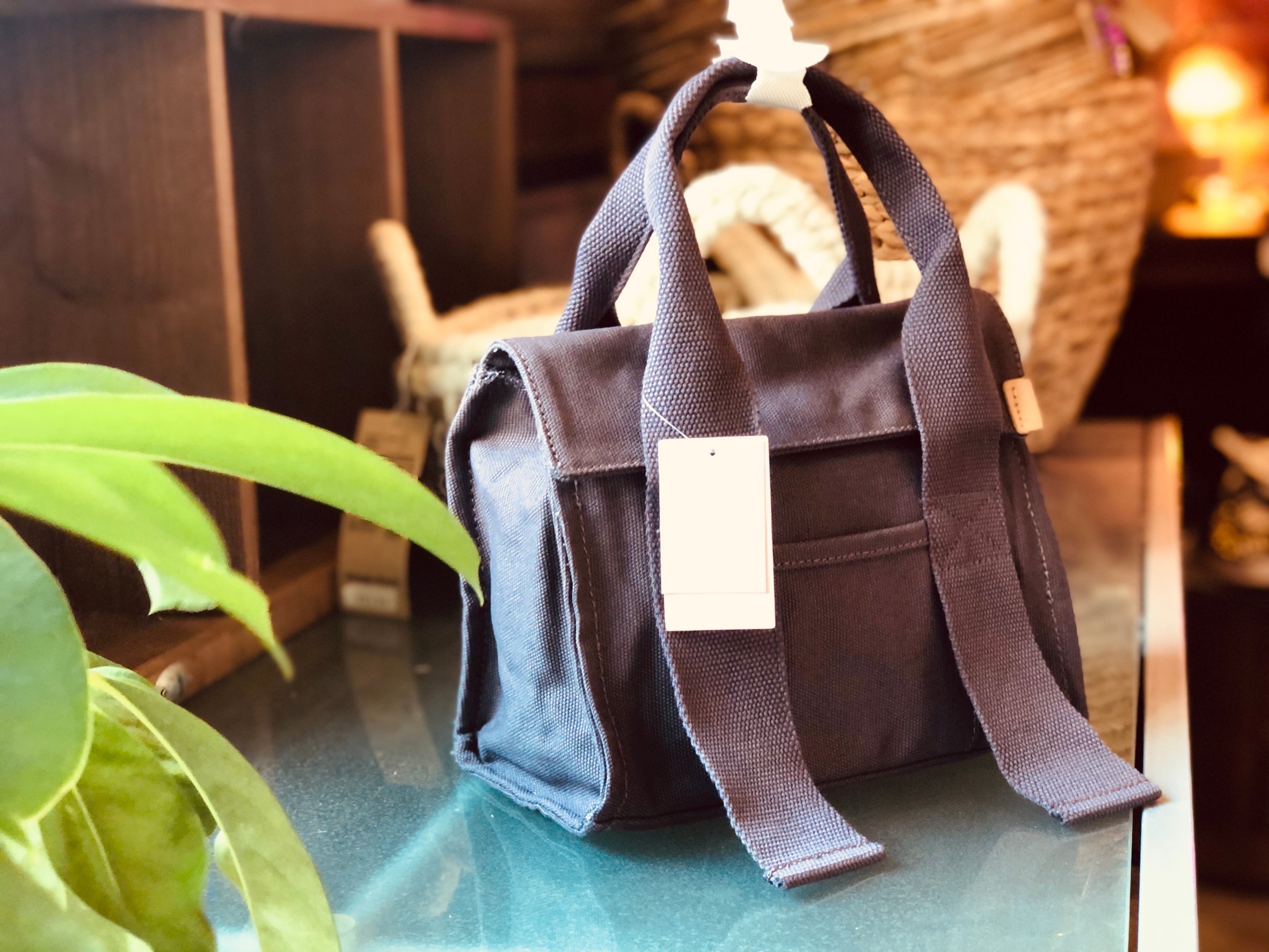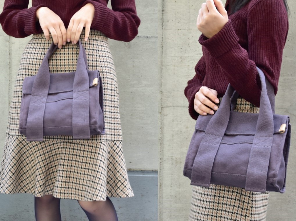 テープ使いが特徴的なミニトートです。