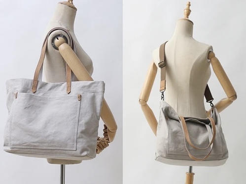 帆布にヌメ革のアクセントがカジュアルに都会的なおしゃれを感じさせるデザイン。