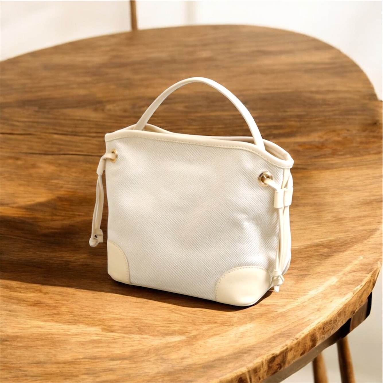布帛見えするフェイクレザーを合わせた異素材デザインがおしゃれなワンハンドルバッグ。