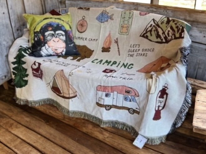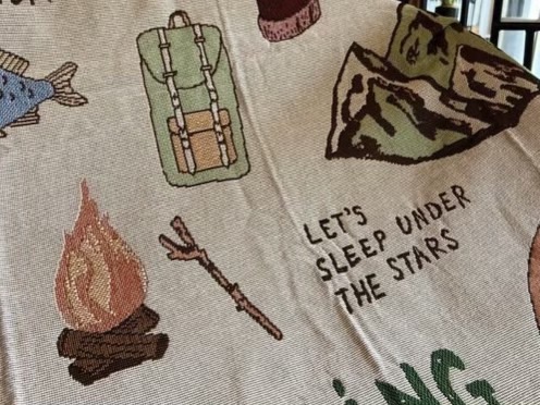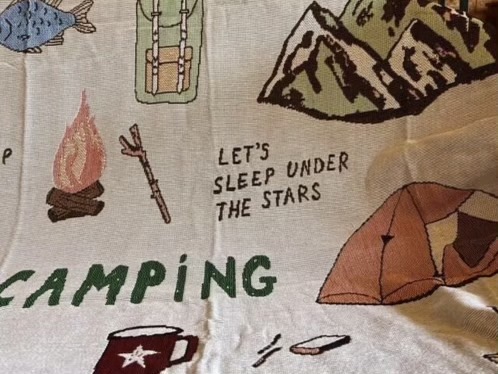 キャンプカーやテント、焚火、方位磁石など キャンプにまつわるアイテムがいっぱいにデザインされたスローケット。
