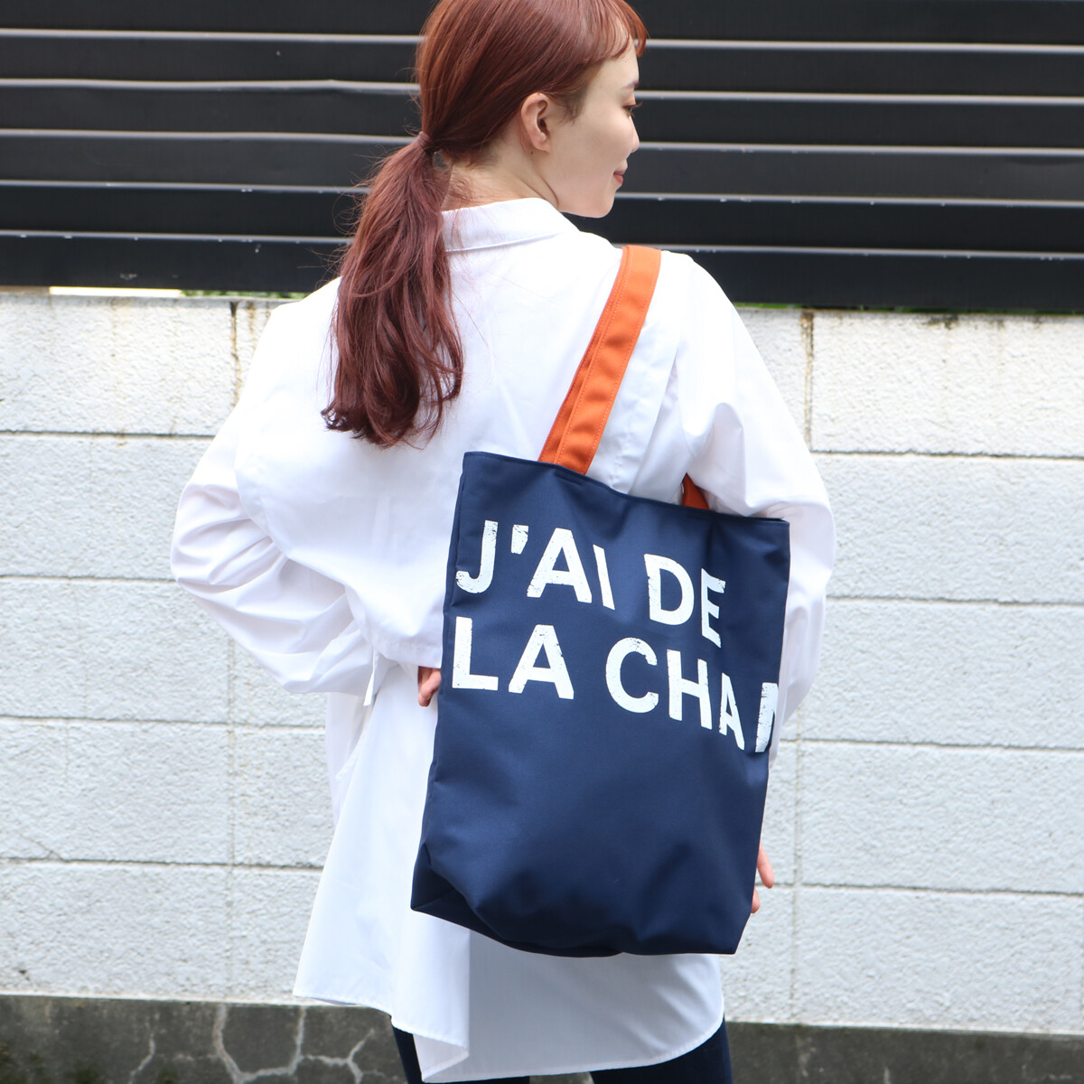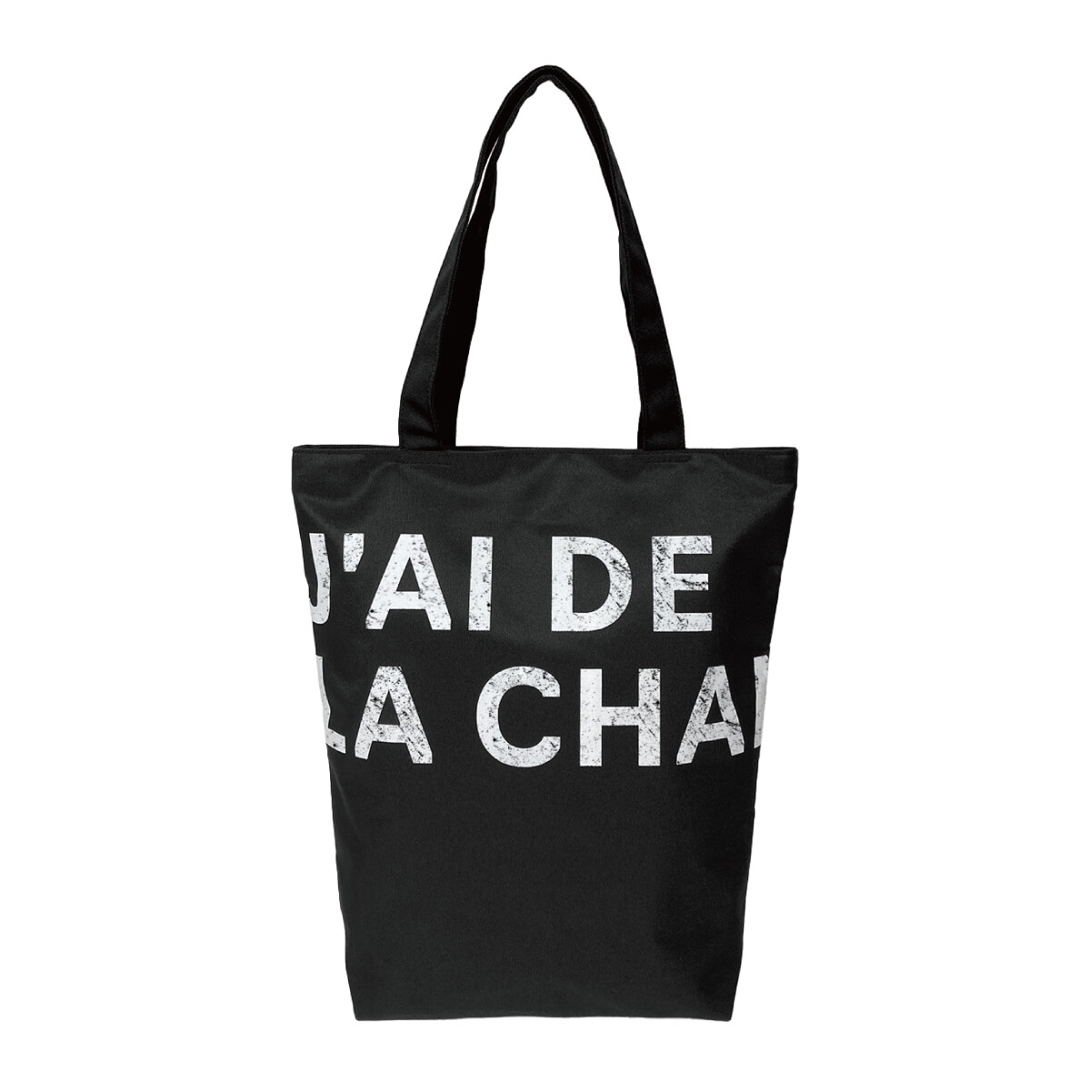 グランジ加工を施したロゴを大胆に配置したユニセックス向けトート。