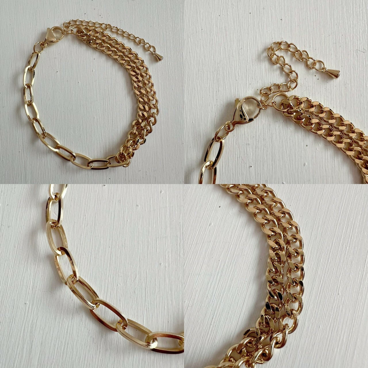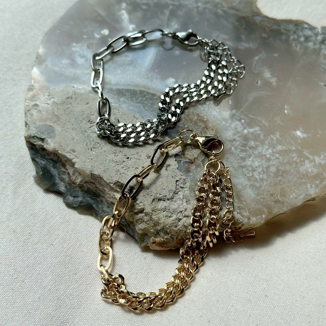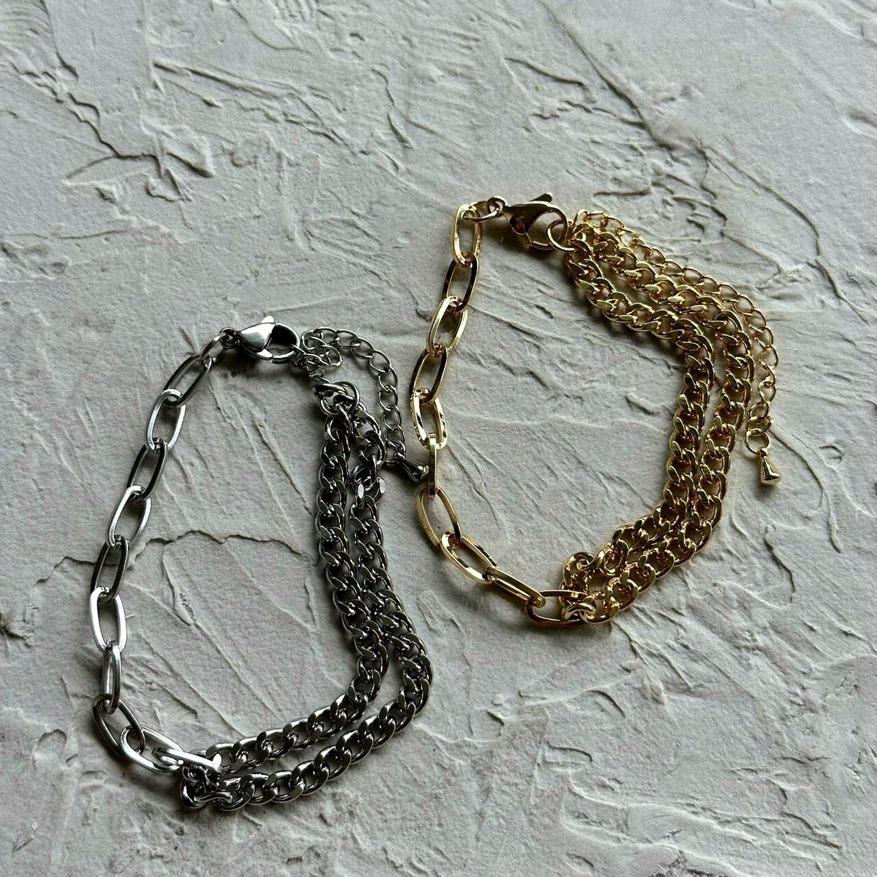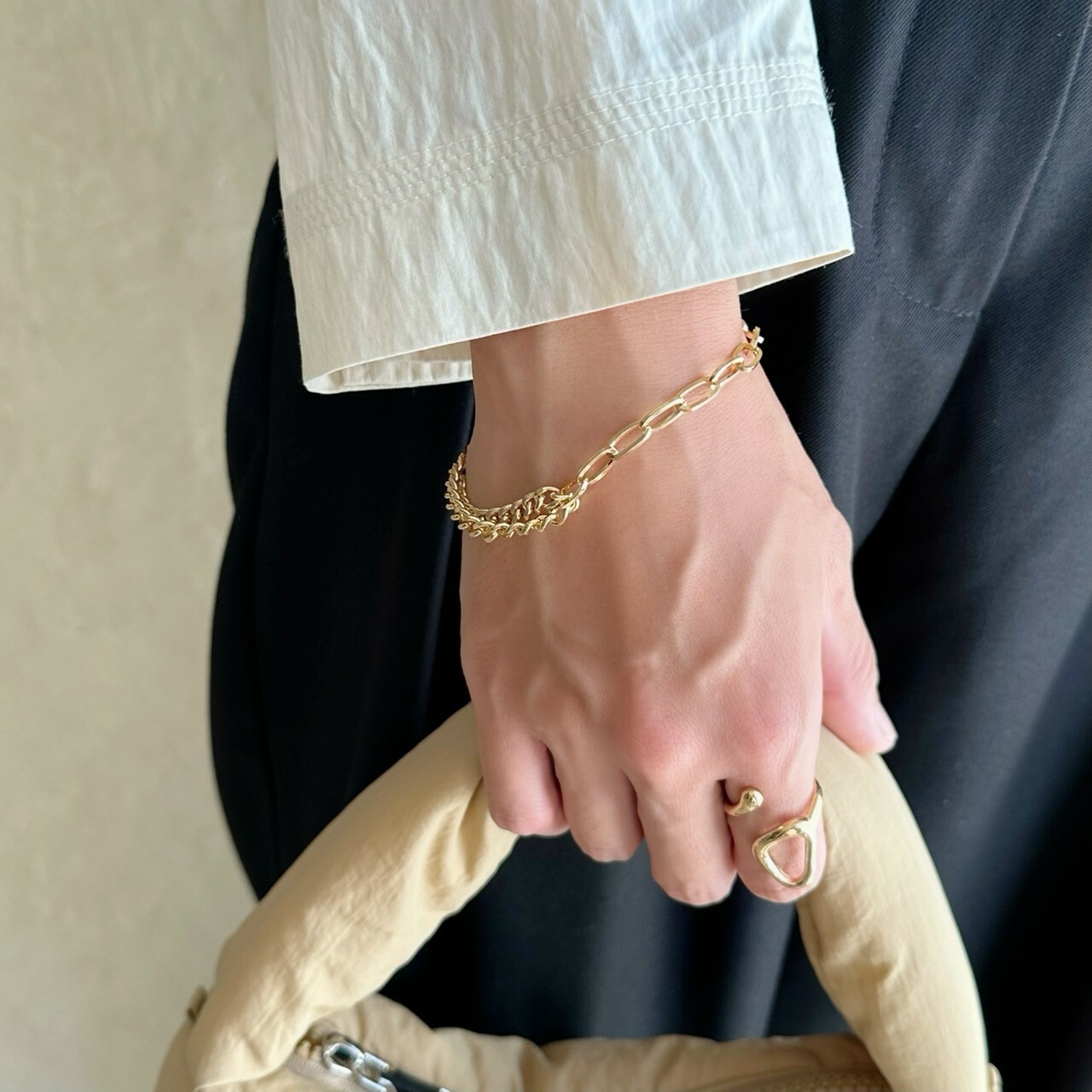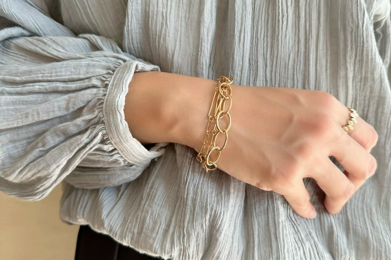 デザインの違う2種類のチェーンが手首周りで違った光沢をうむ一品。