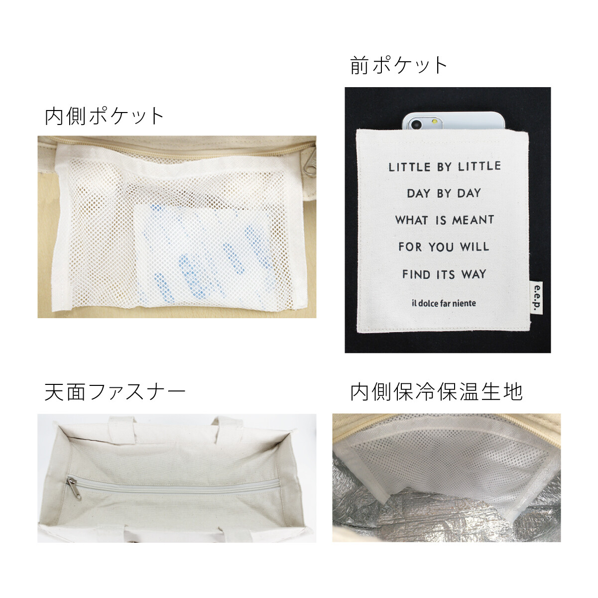 内側ポケットには保冷剤などの収納に便利なメッシュポケット付き。