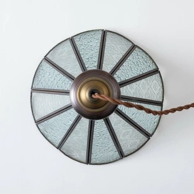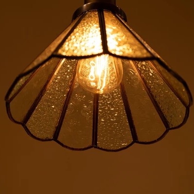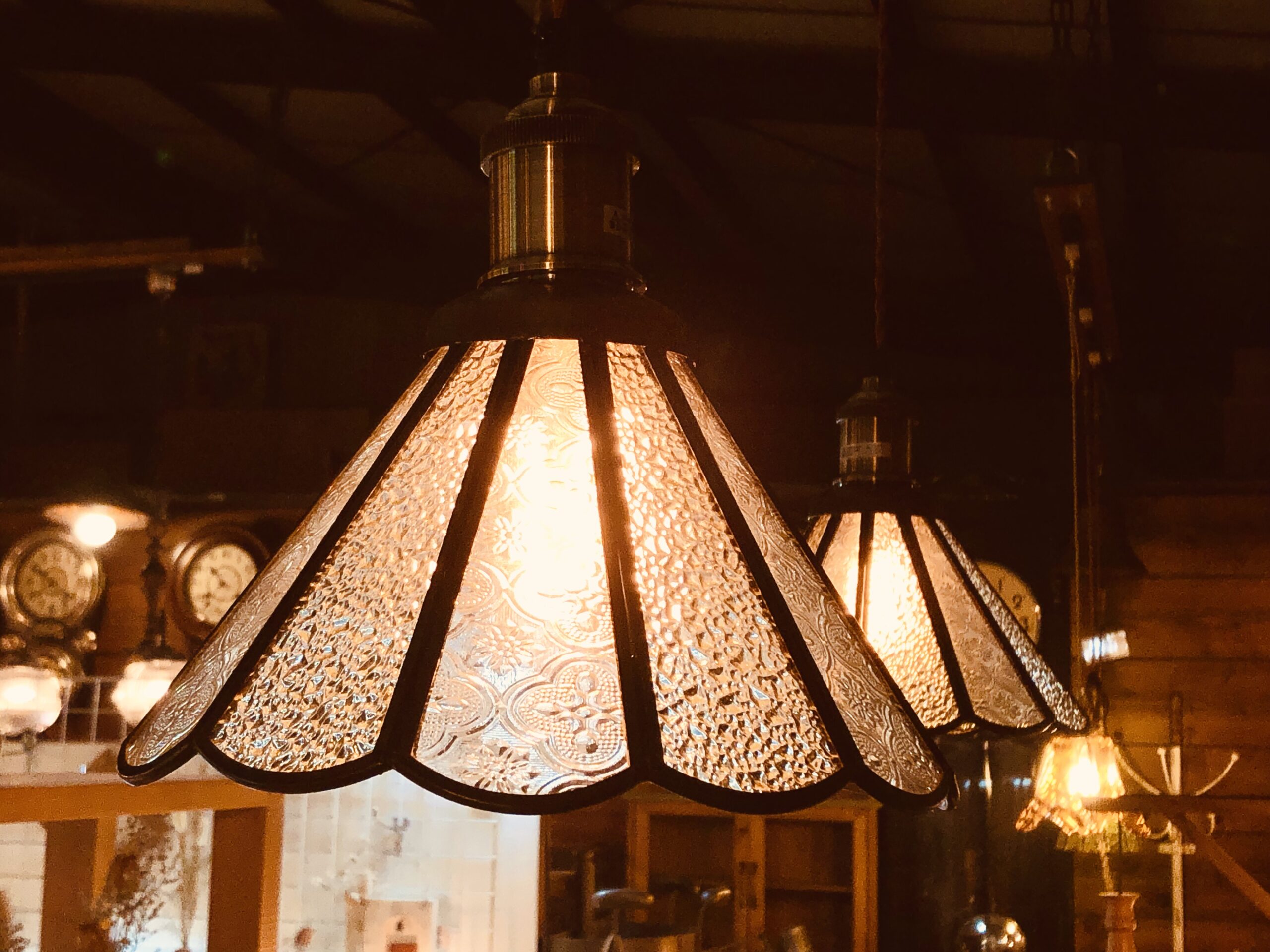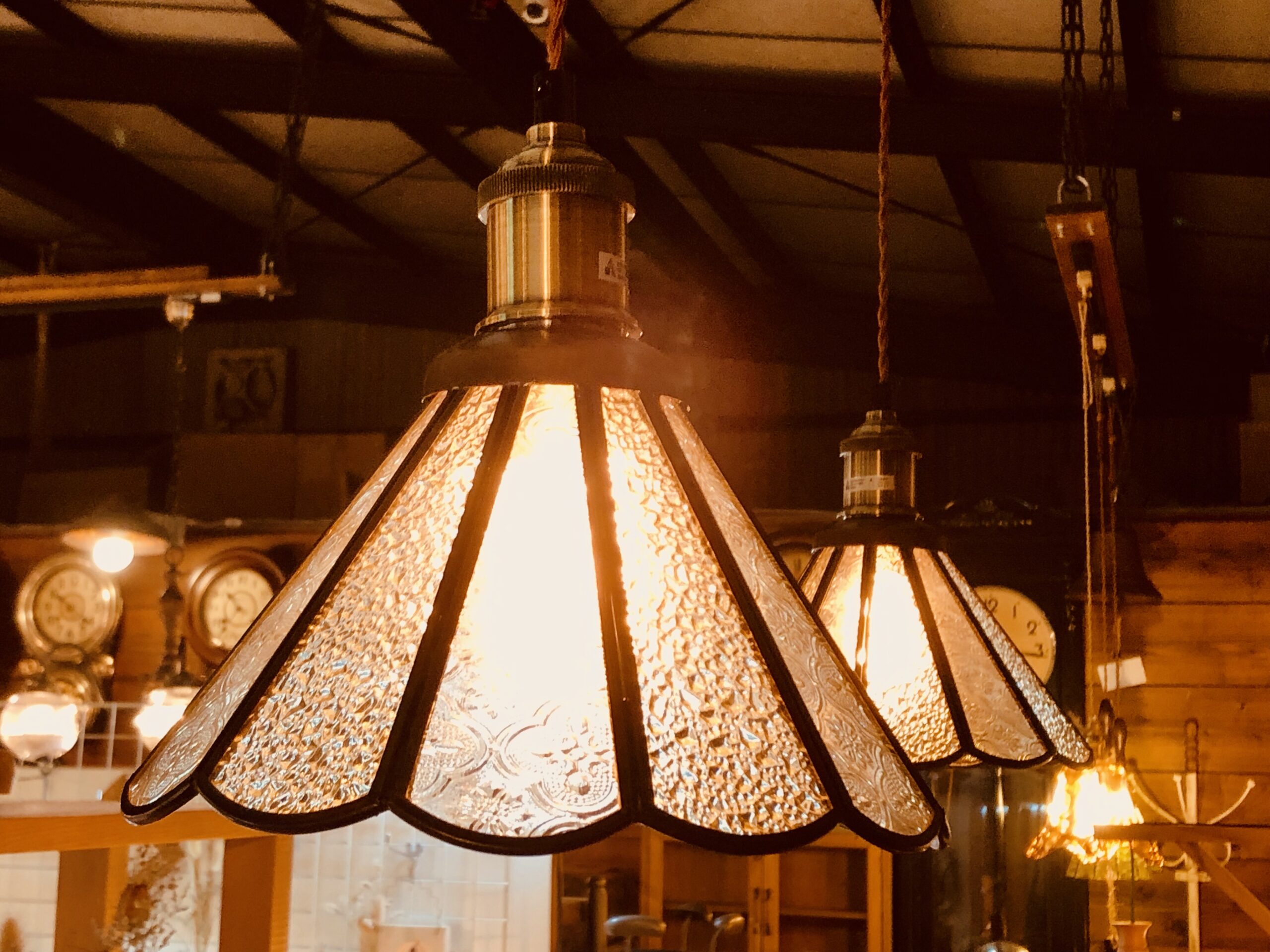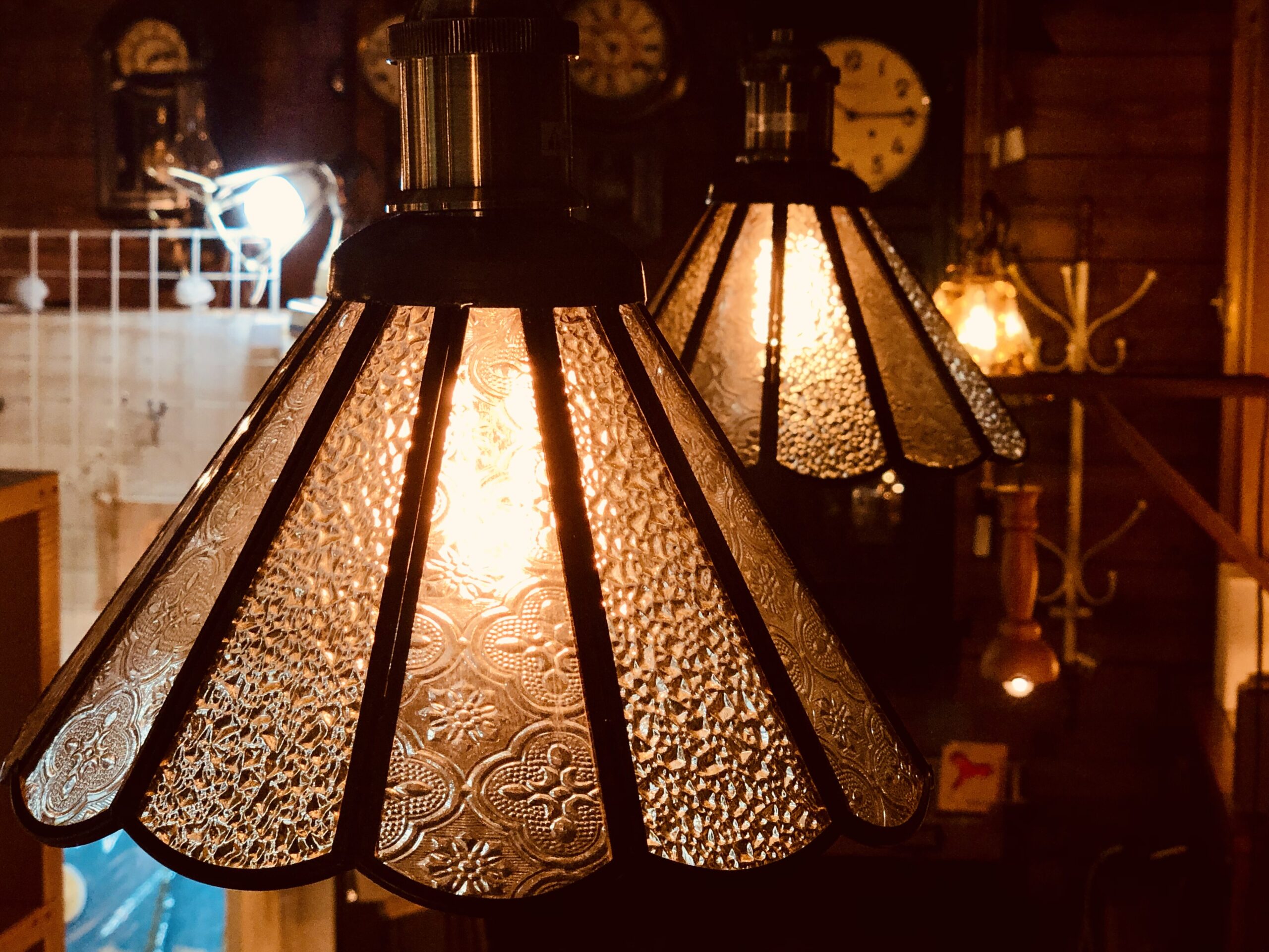 レトロ感漂うペンダントライト。ステンドグラスのシェードは立体的な模様が特徴的。