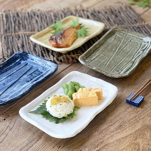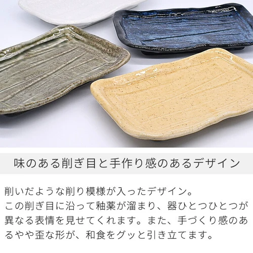 削いだような削り模様が入ったデザイン。 この削ぎ目に沿って釉薬が溜まり、器ひとつひとつが 異なる表情を見せてくれます。また、手づくり感のあ るやや歪な形が、和食をグッと引き立てます。