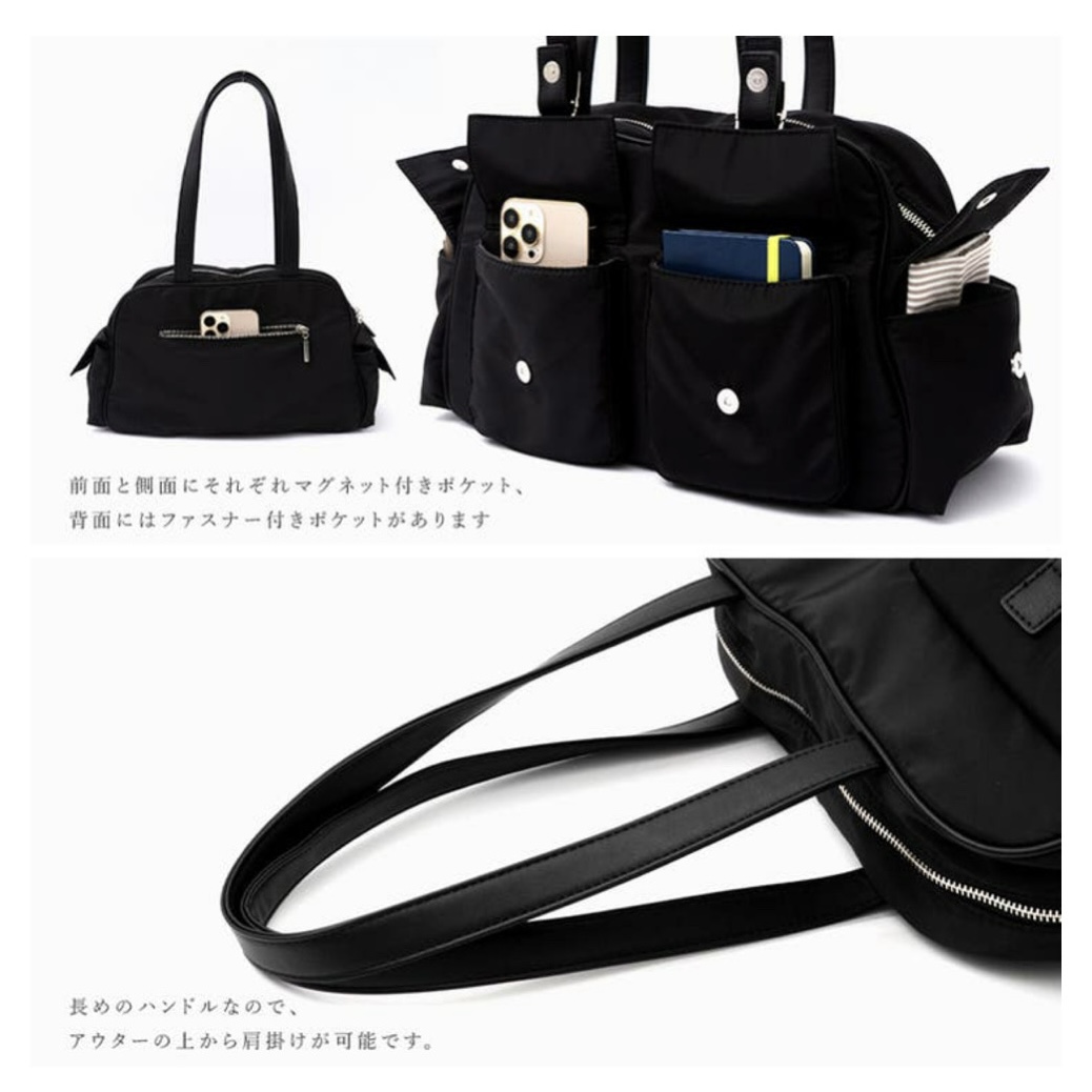 長めのハンドルで肩掛けしやすくデザイン。
