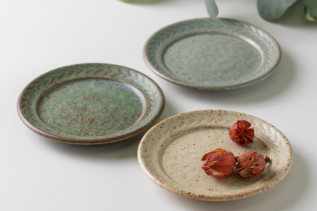 放射線状のしのぎが作り出す輝きと、窯変の淡い色が魅力です。