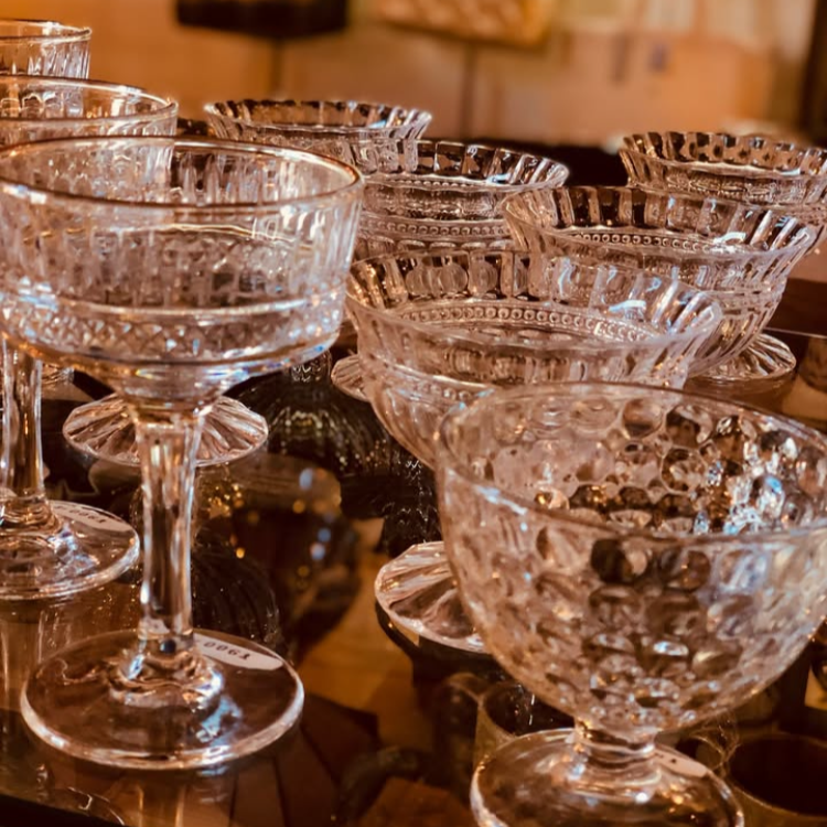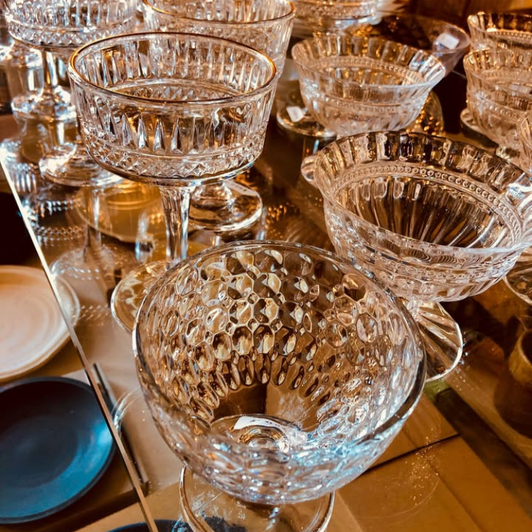 レトロなフォルムの美しいデザインが目を引く、ガラス製のデザートグラス。