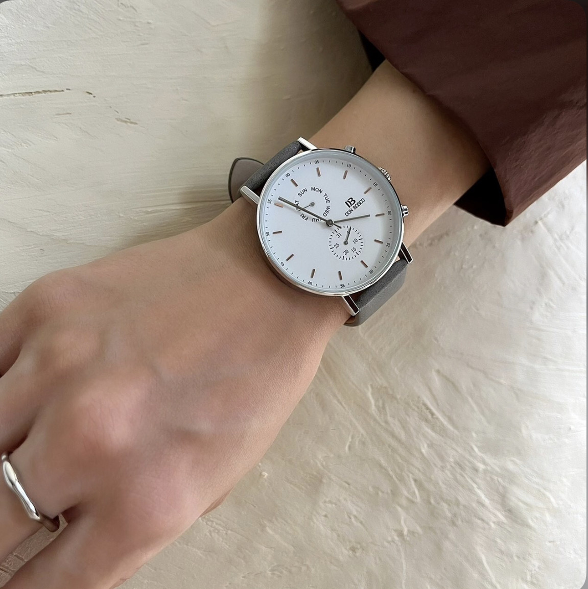 インデックスや秒針の色が、柔らかな印象を与え、バランスが取れたひと品です。