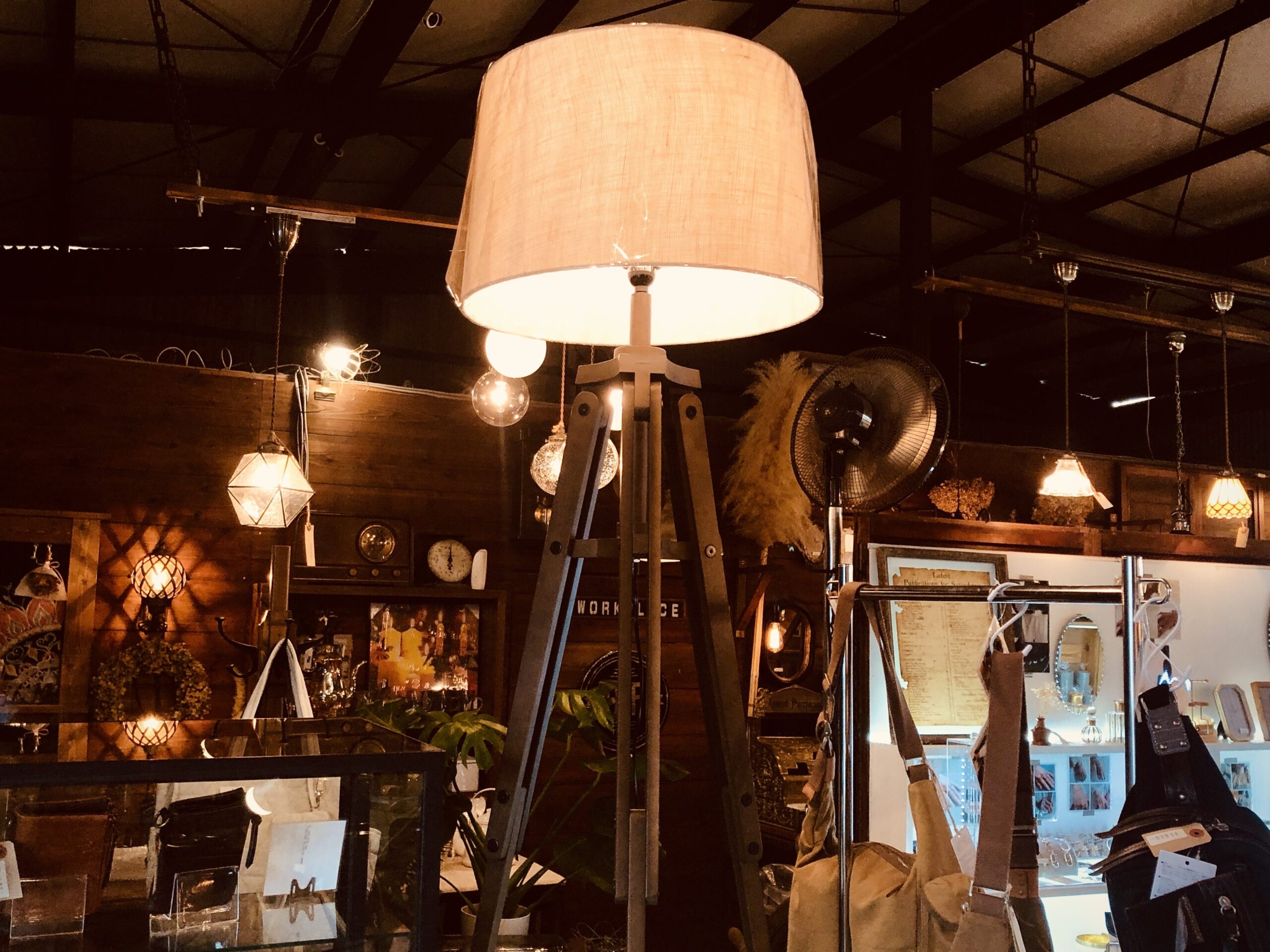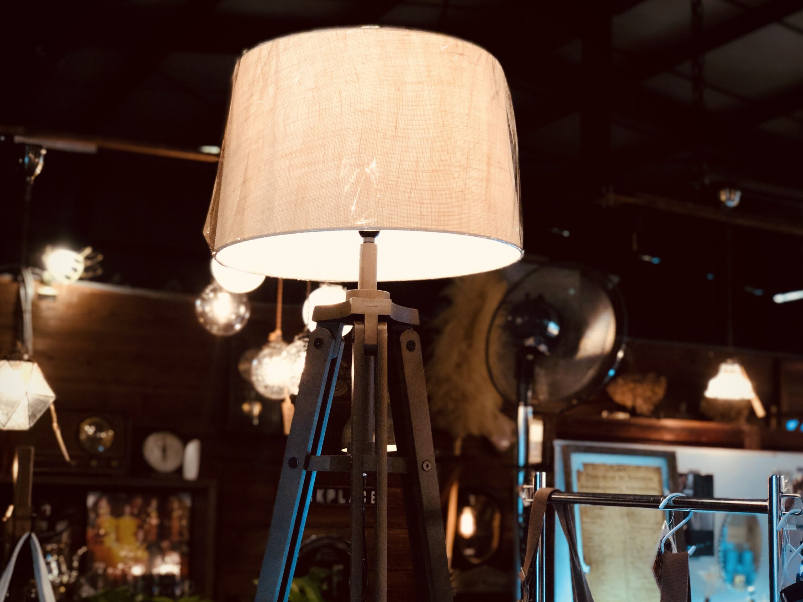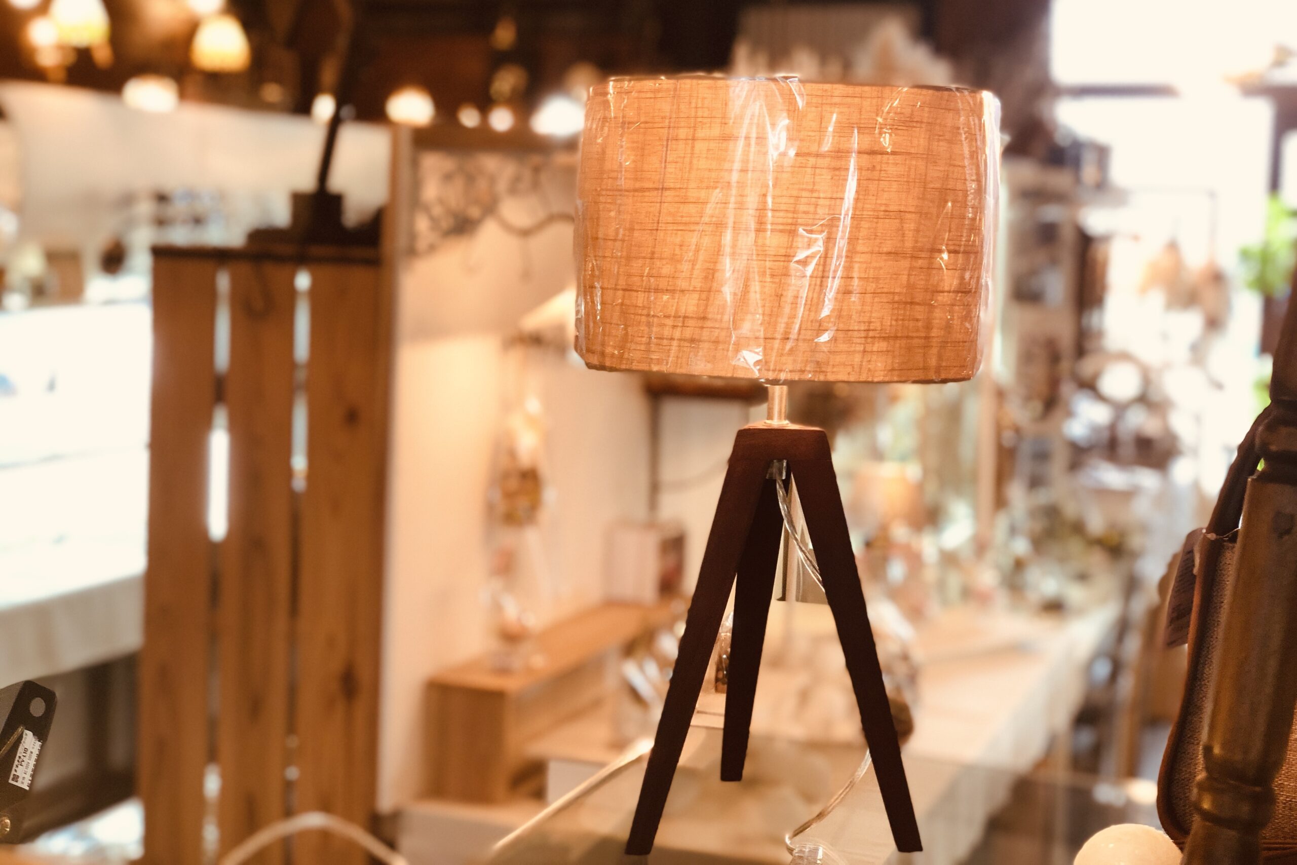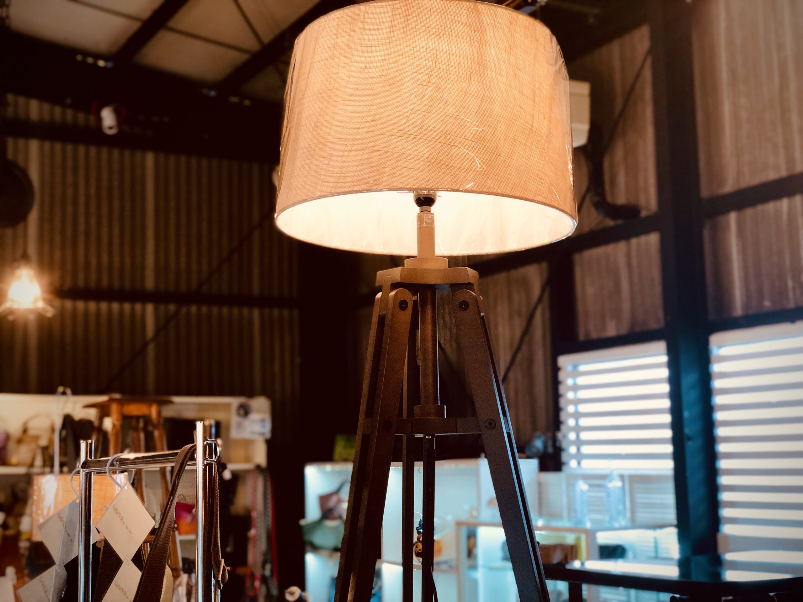 麻のシェードとヴィンテージ感のある三脚がクラシカルなフロアライト。