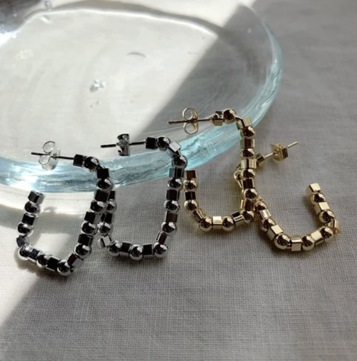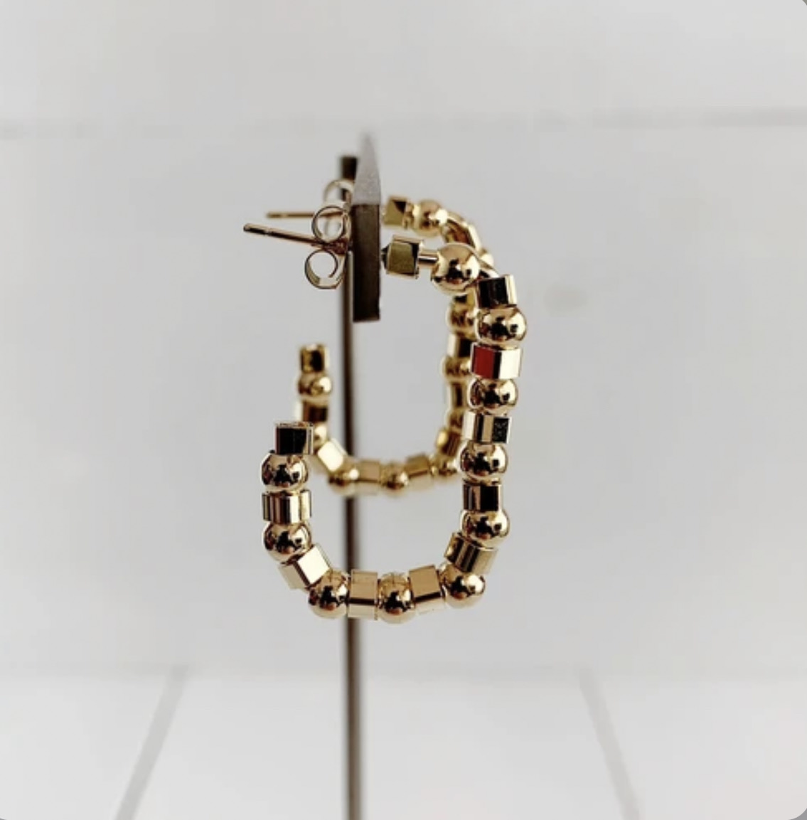 ボールとスクエアパーツの組み合わせが新鮮なフープピアス