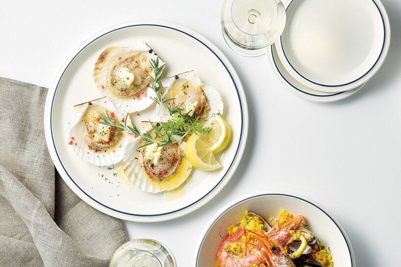 真っ白なうつわにブルーのラインが際立つ、ムダをそぎ落としたシンブルなフォルム。