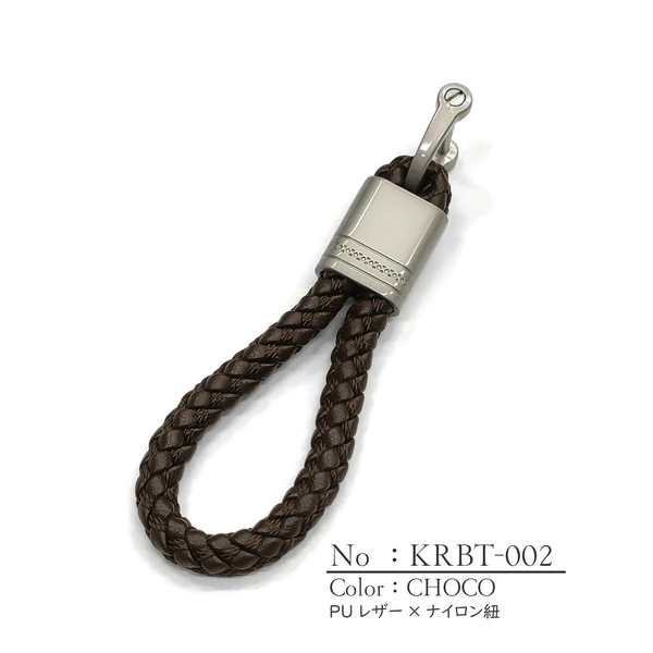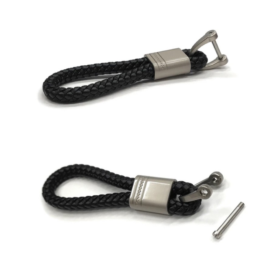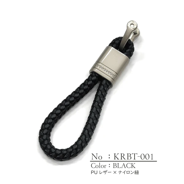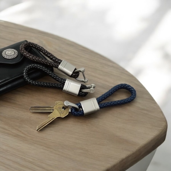 PUレザーを編み込み、メタルパーツを組み合わせハンドストラップ形状にしたキーリング。