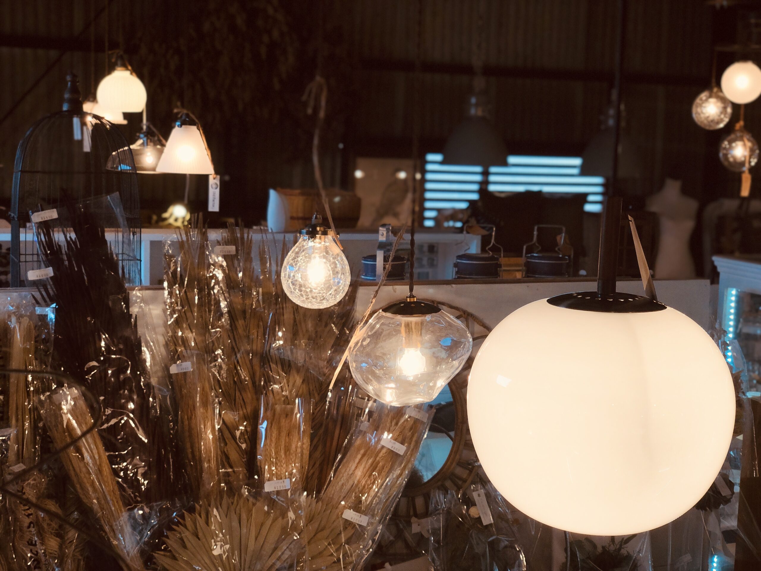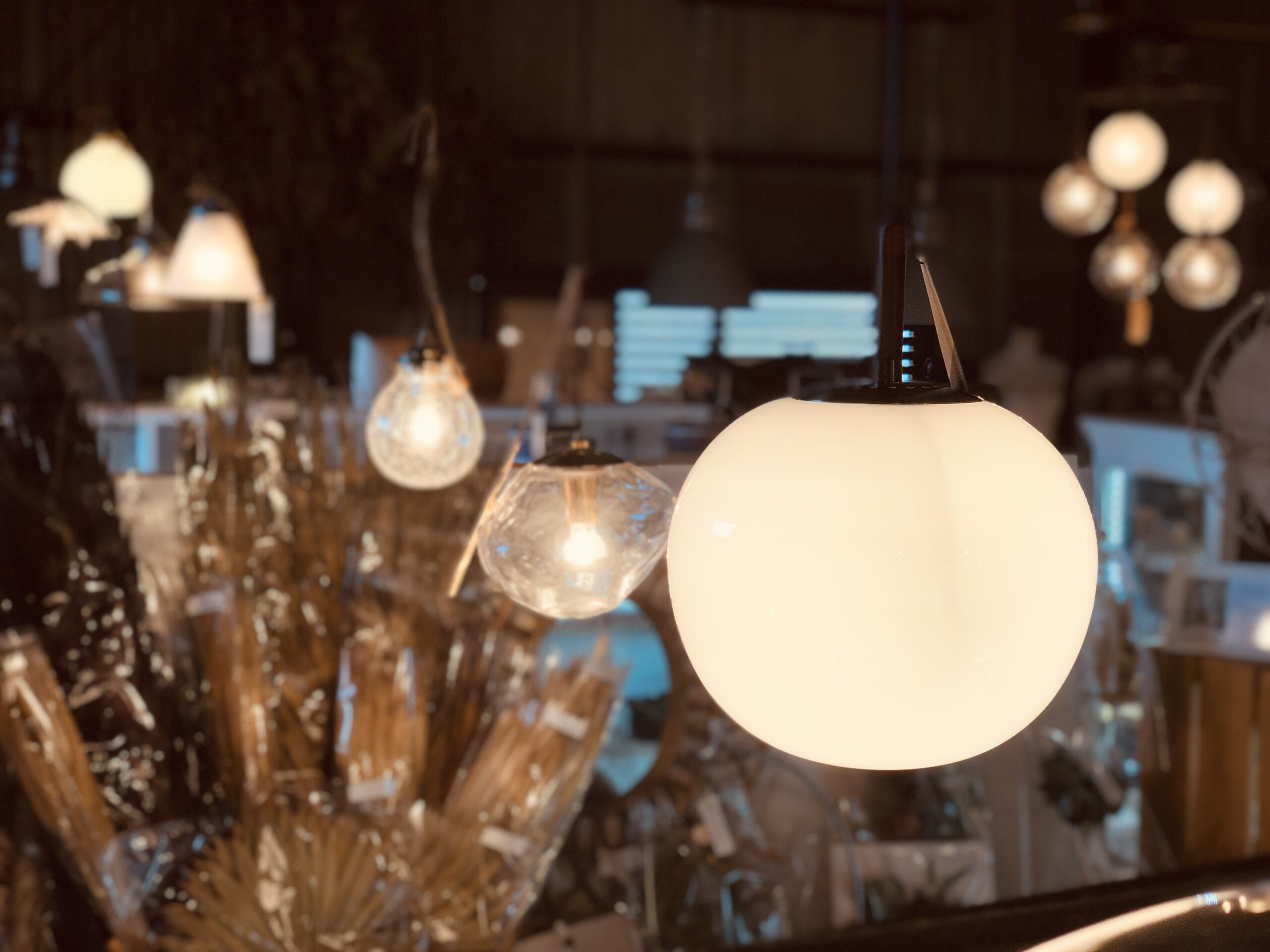 ホワイトガラスシェードが柔らかな光を広げます。
