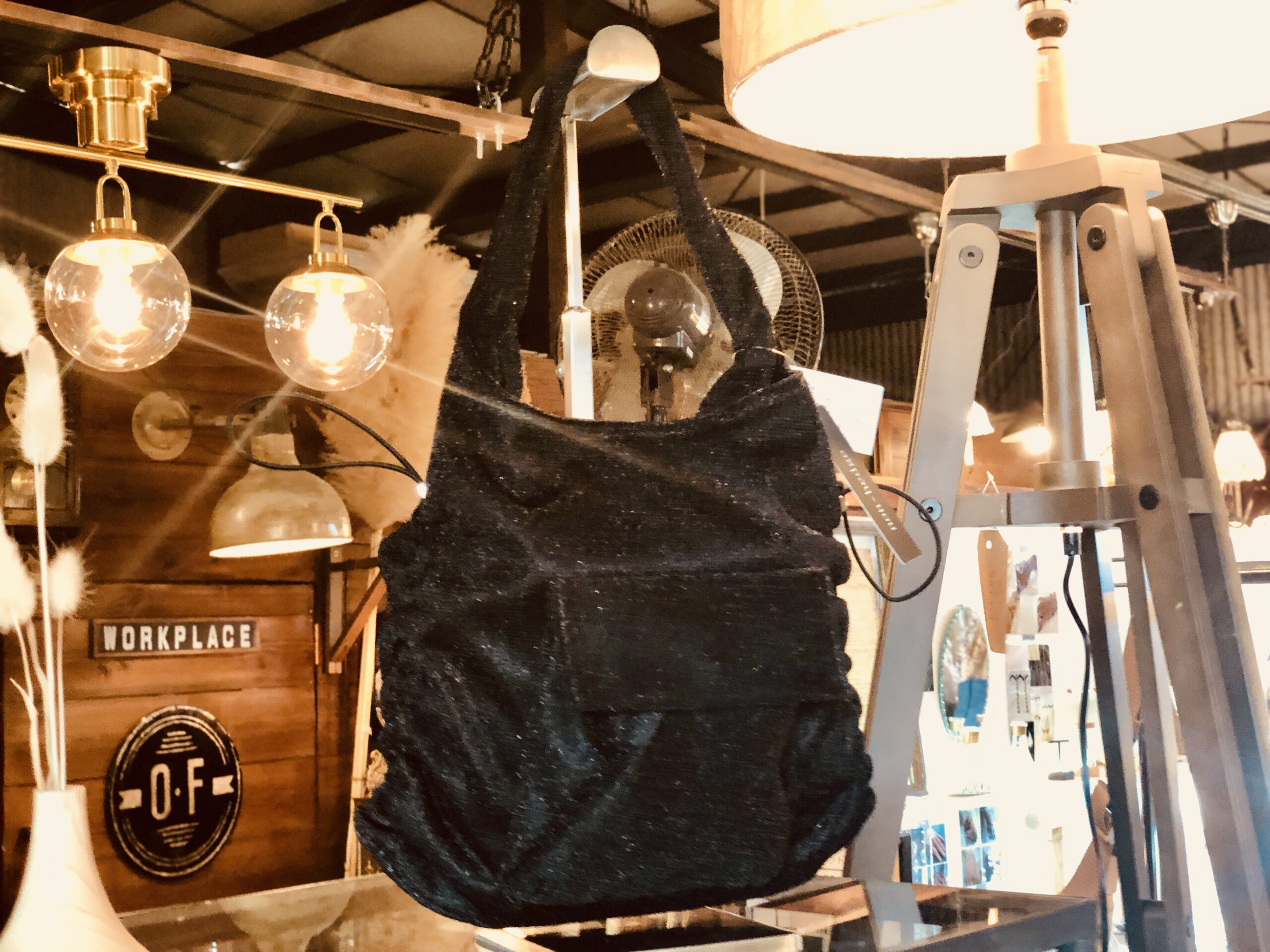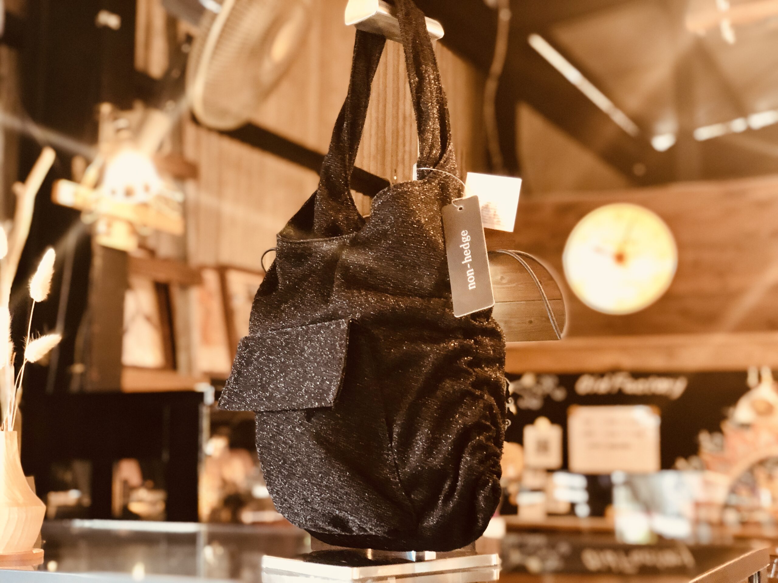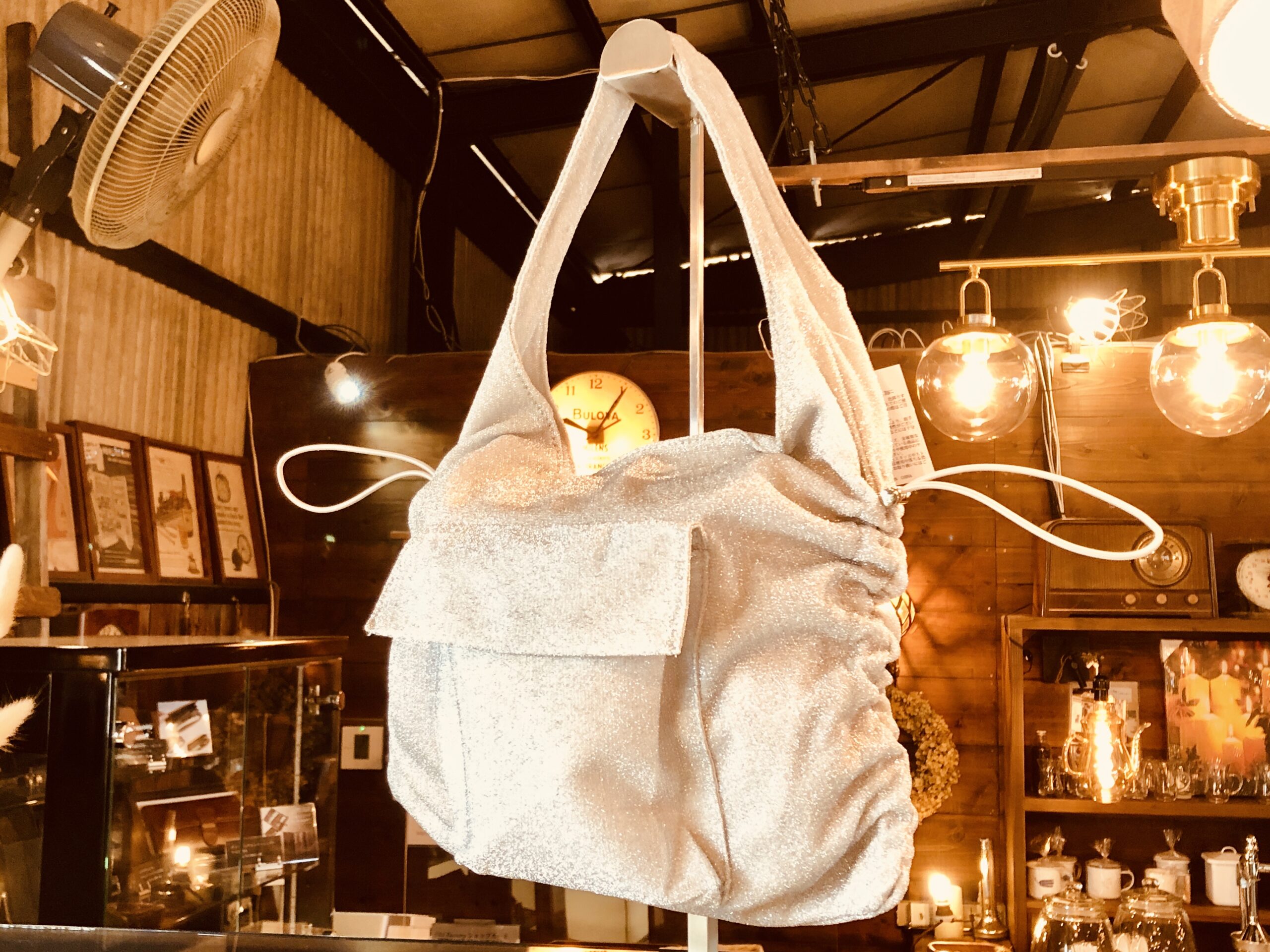 ラメのきらきらとした表面感が印象的なトートバッグ。
