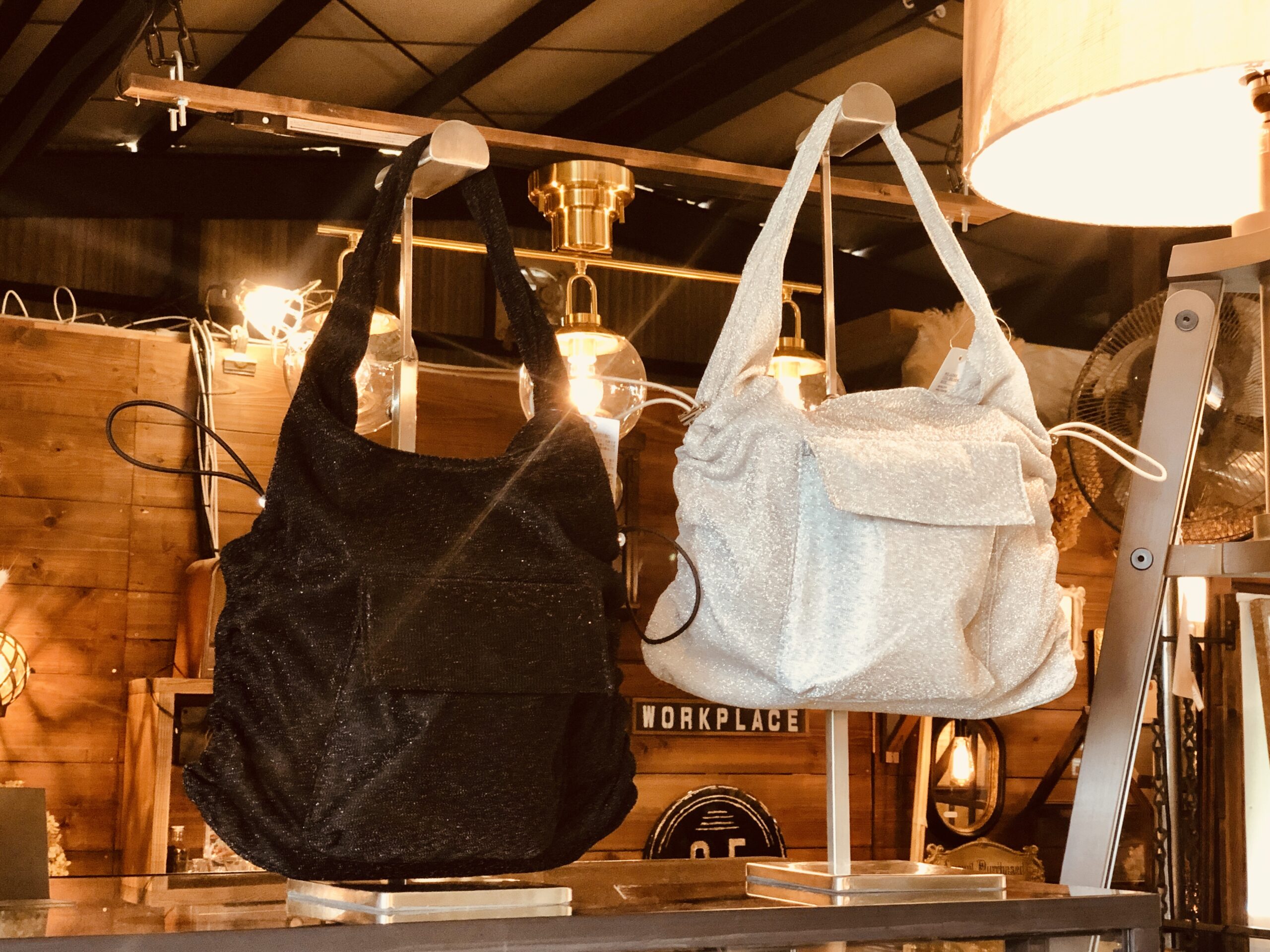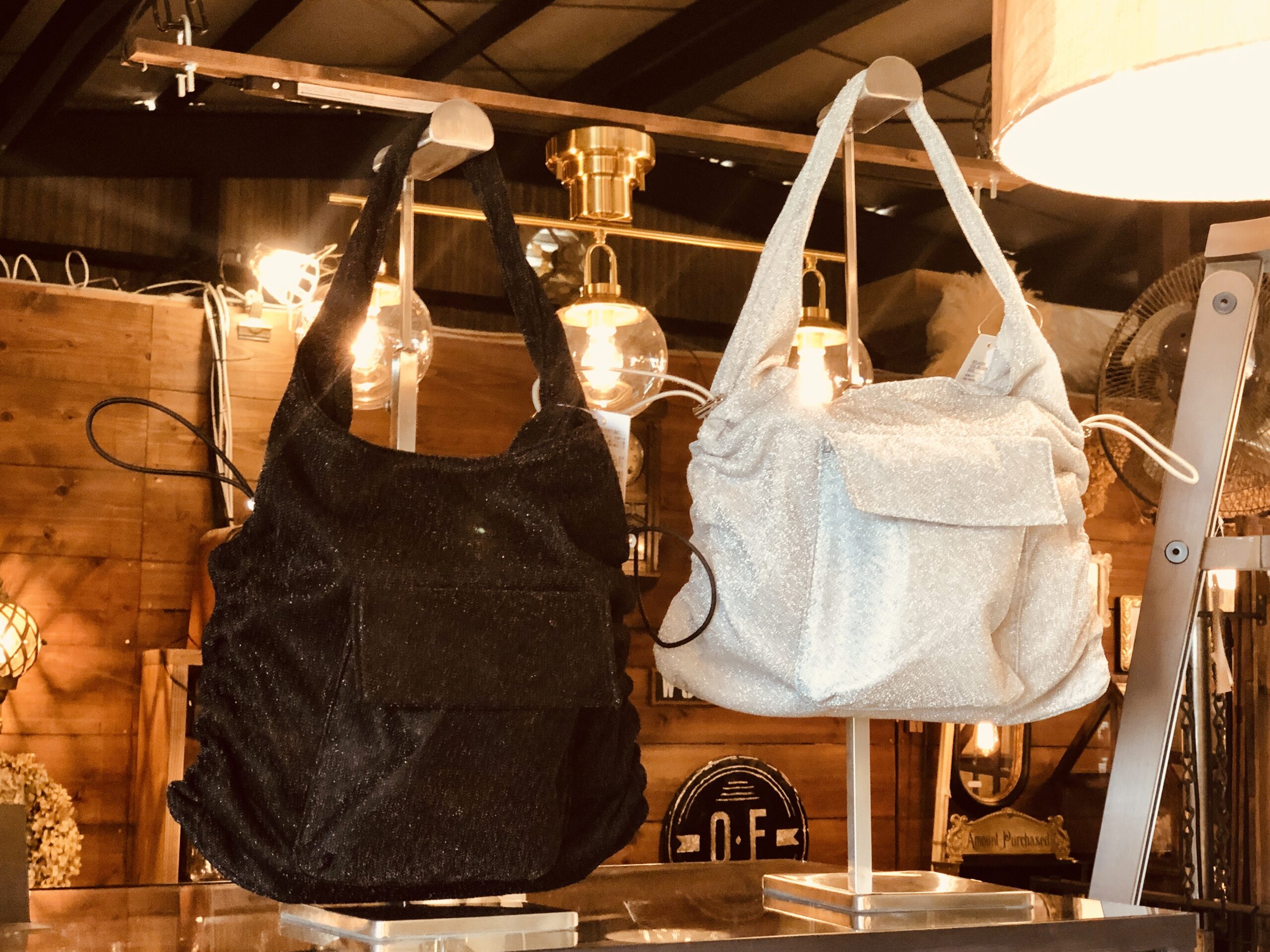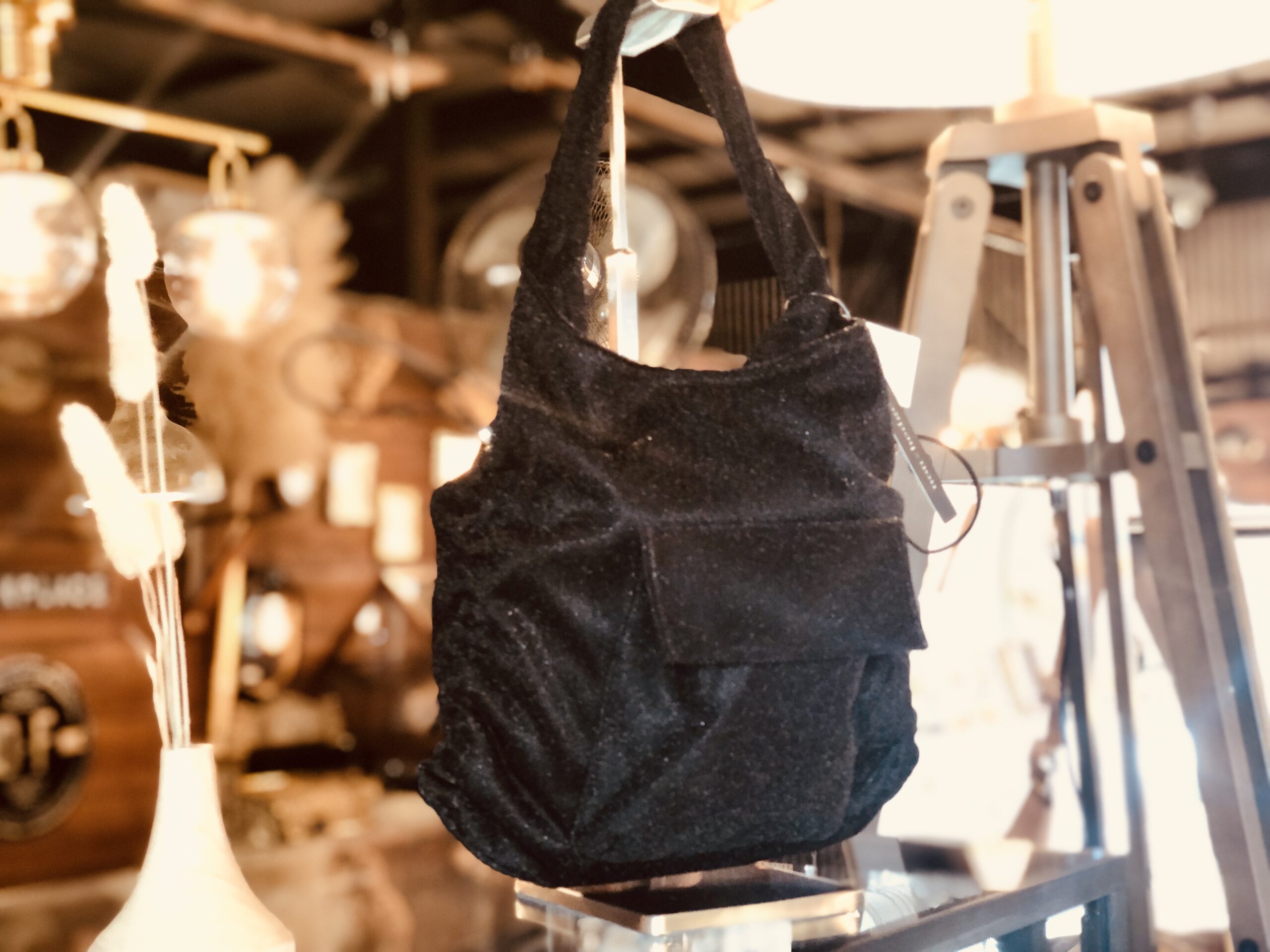 ラメのきらきらとした表面感が印象的なトートバッグ。
