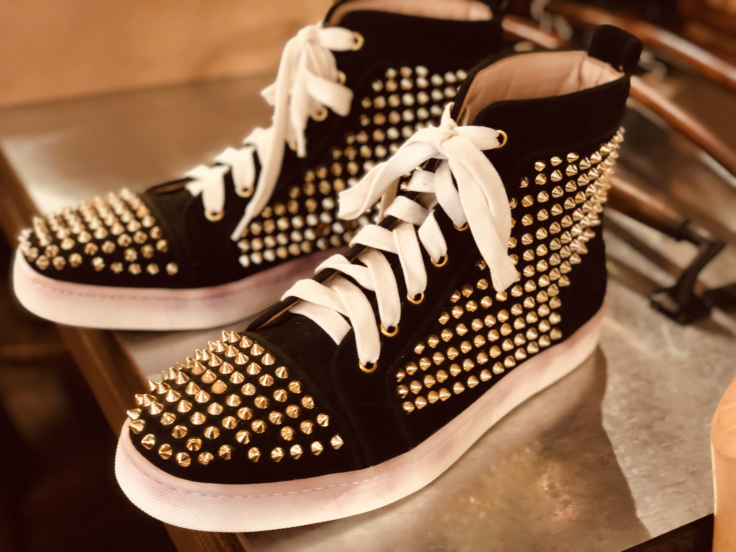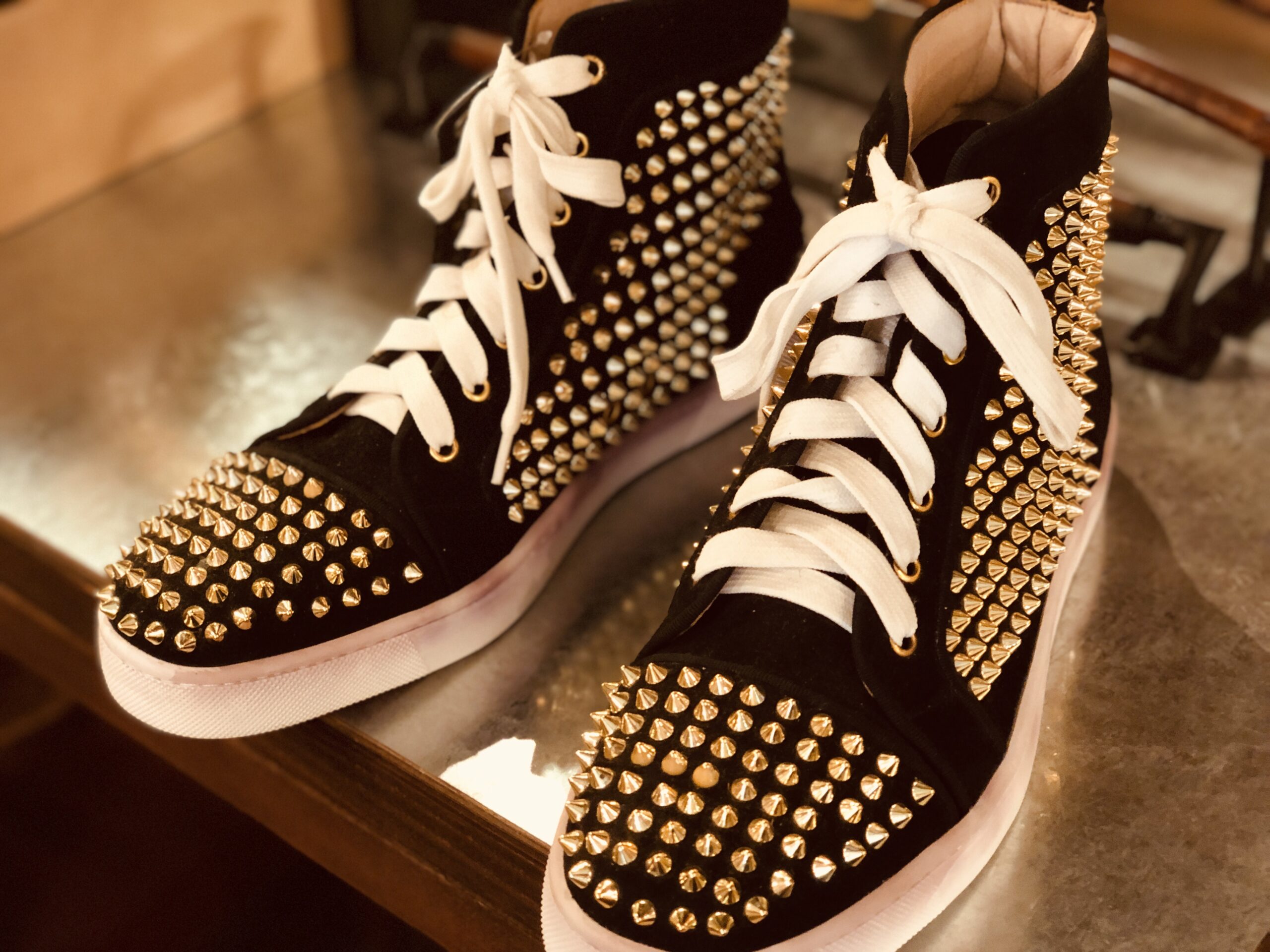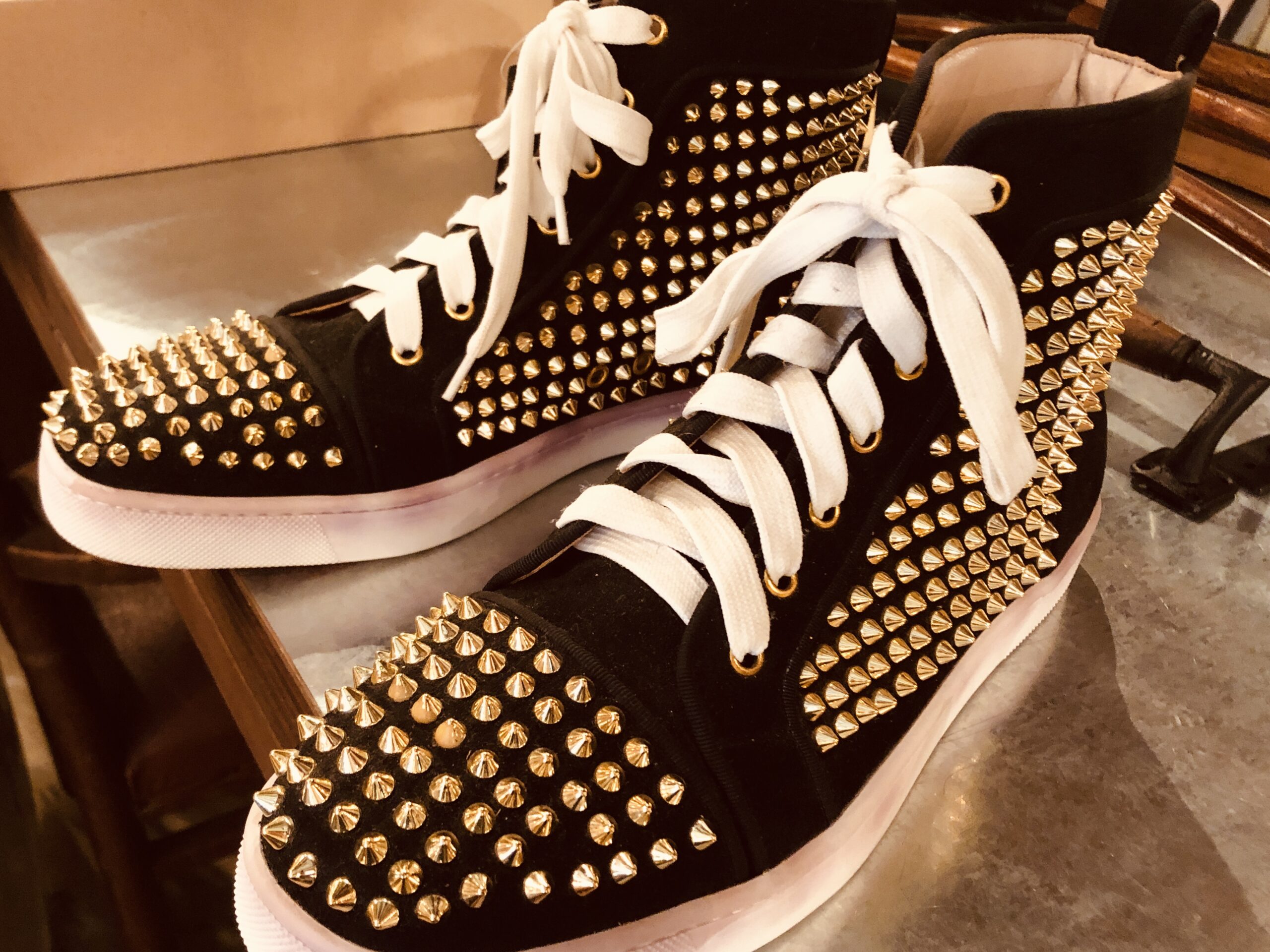 シンプルなブラックスニーカーに、ゴールドスタッズのコントラストで目を引くアイテムです。