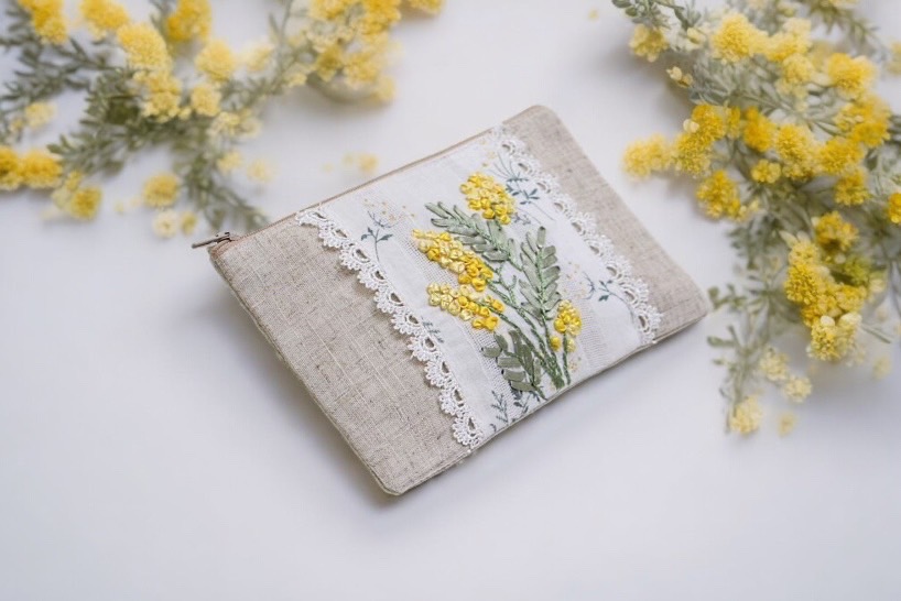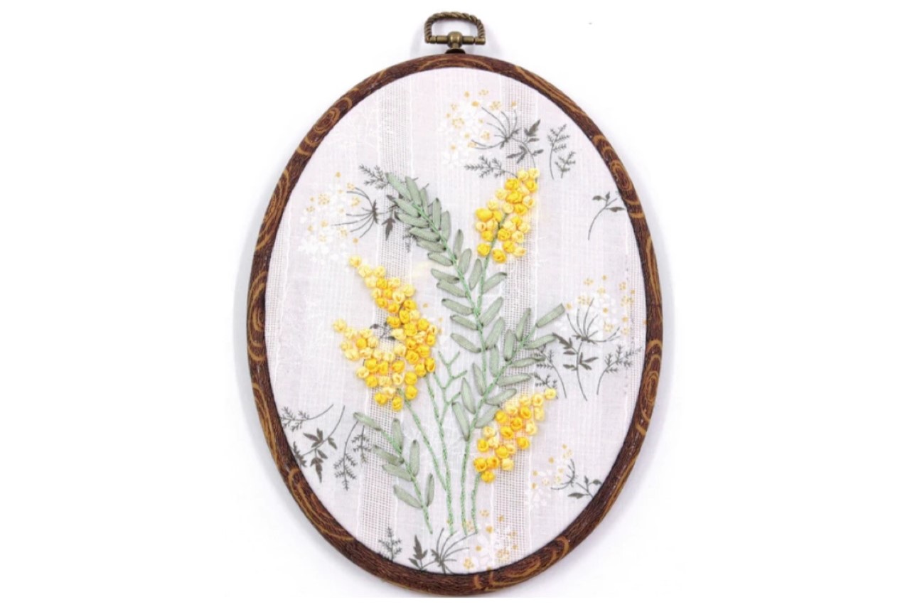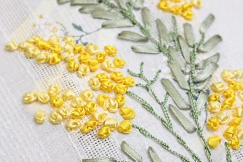 手刺しのリボン刺繡でミモザの花が表現されています。