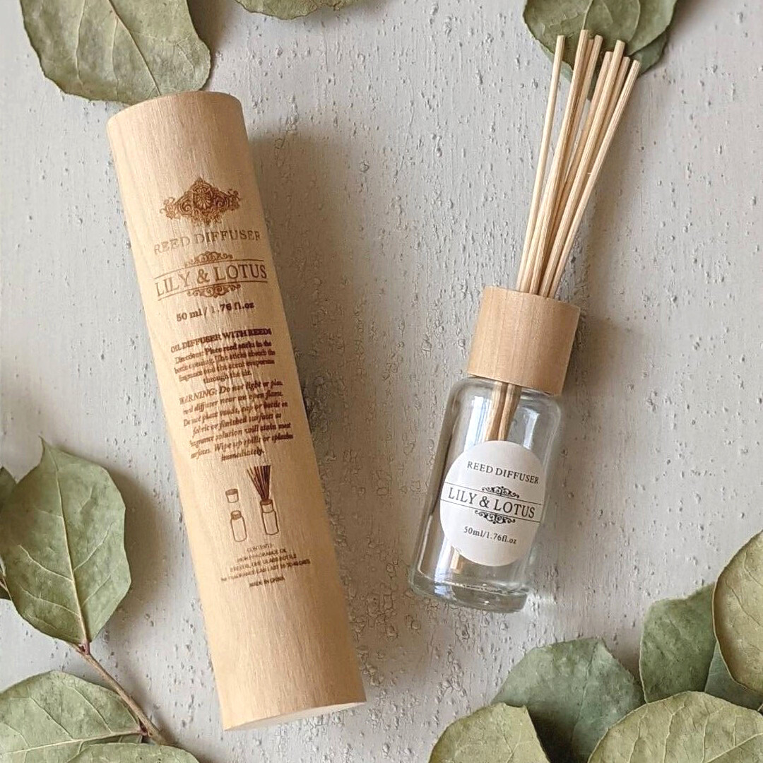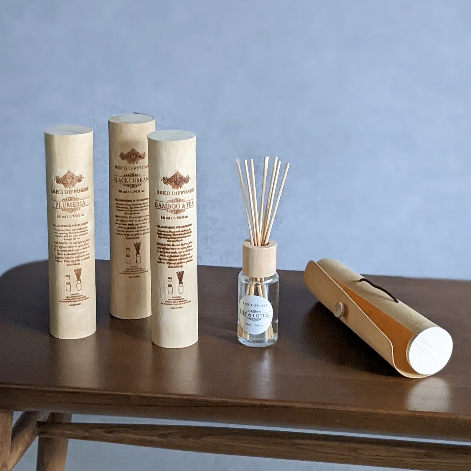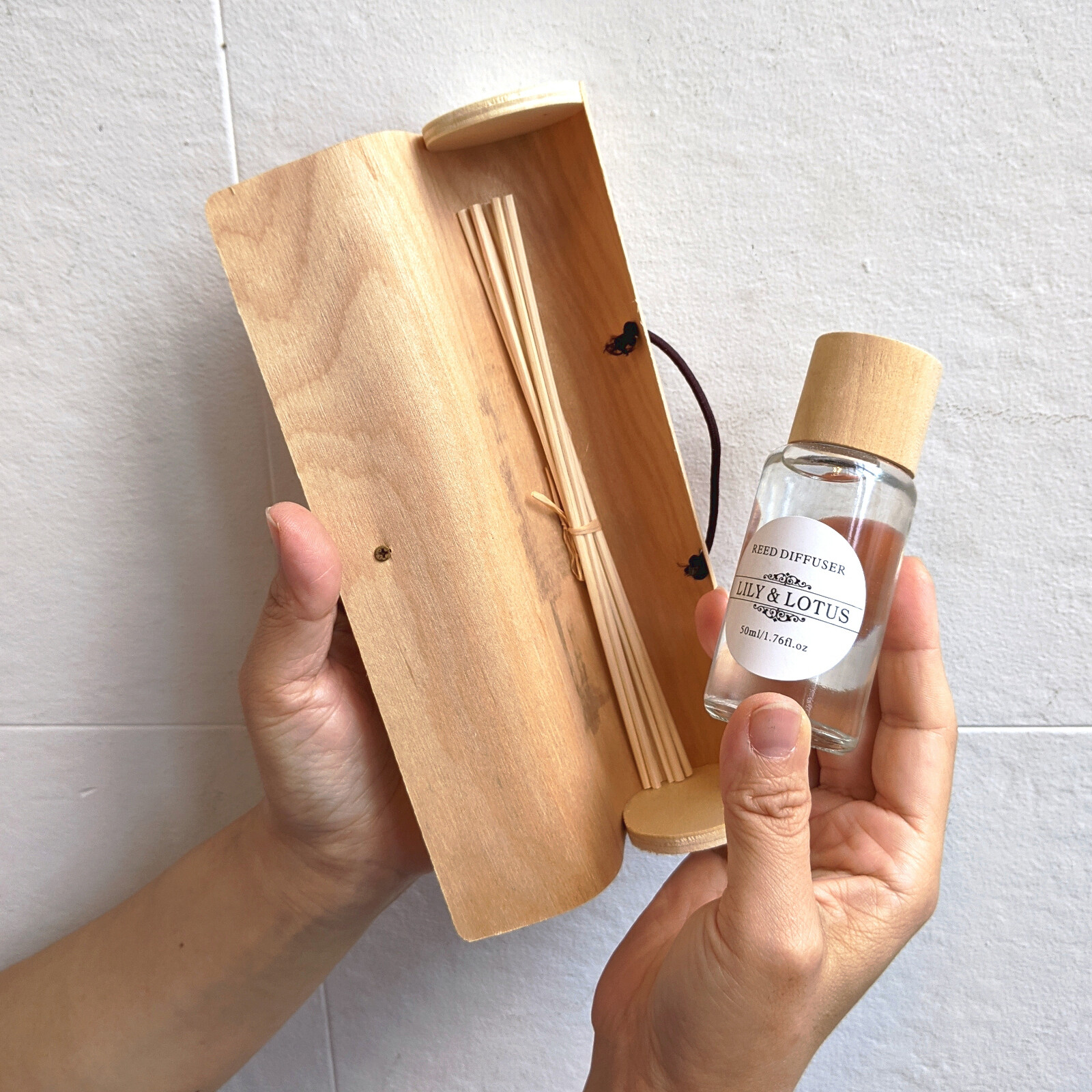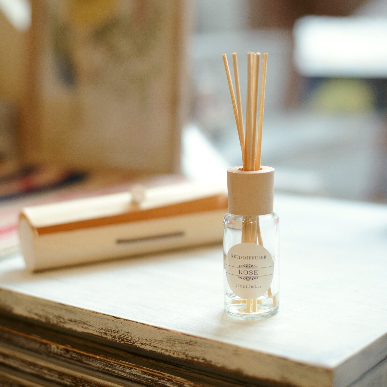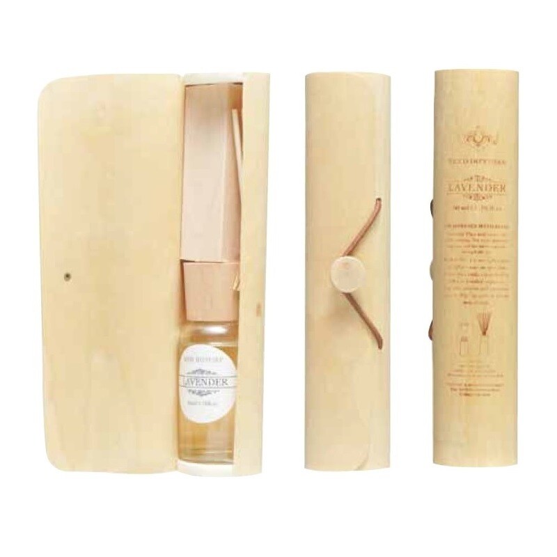 ナチュラルなウッドのケースに入ったルームフレグランス。