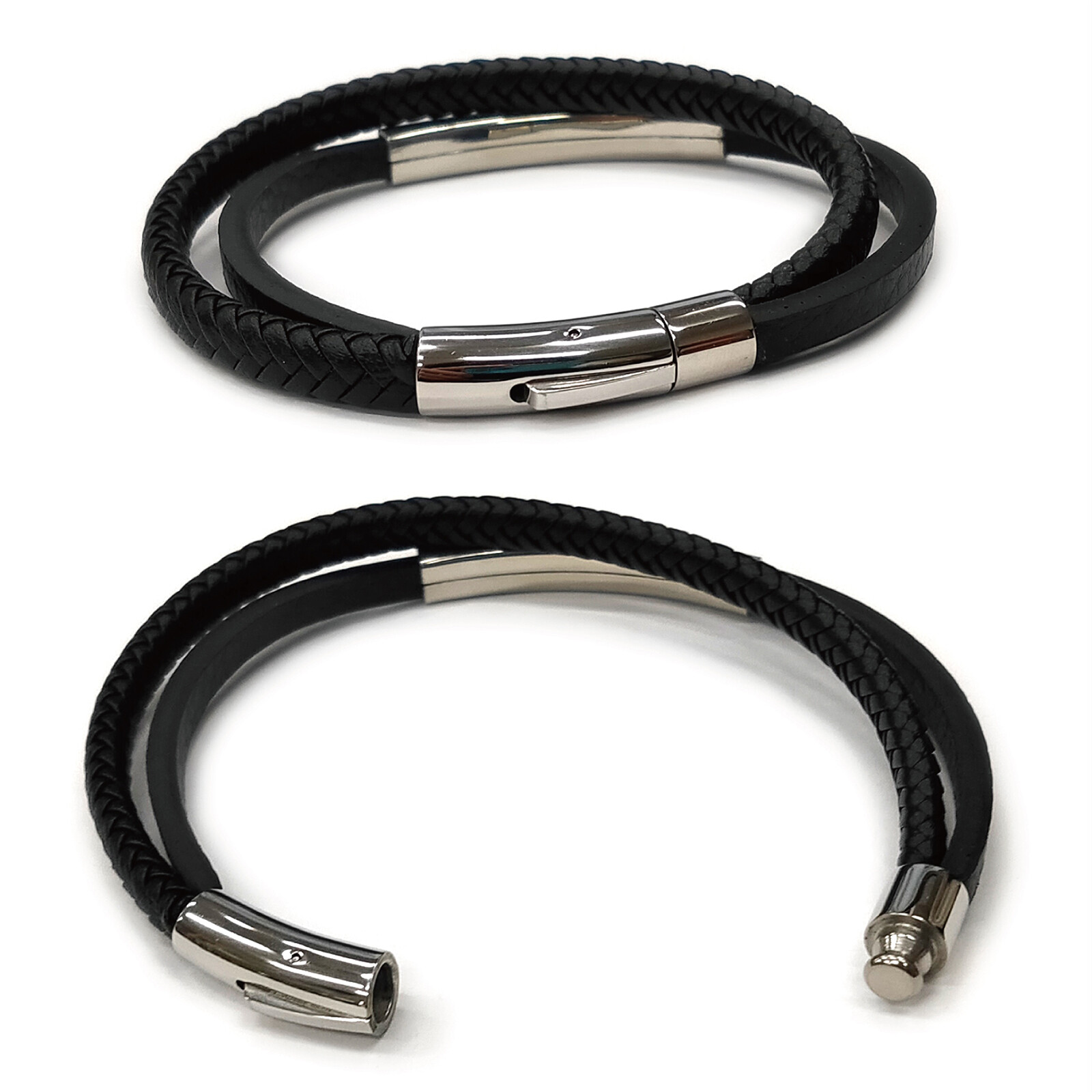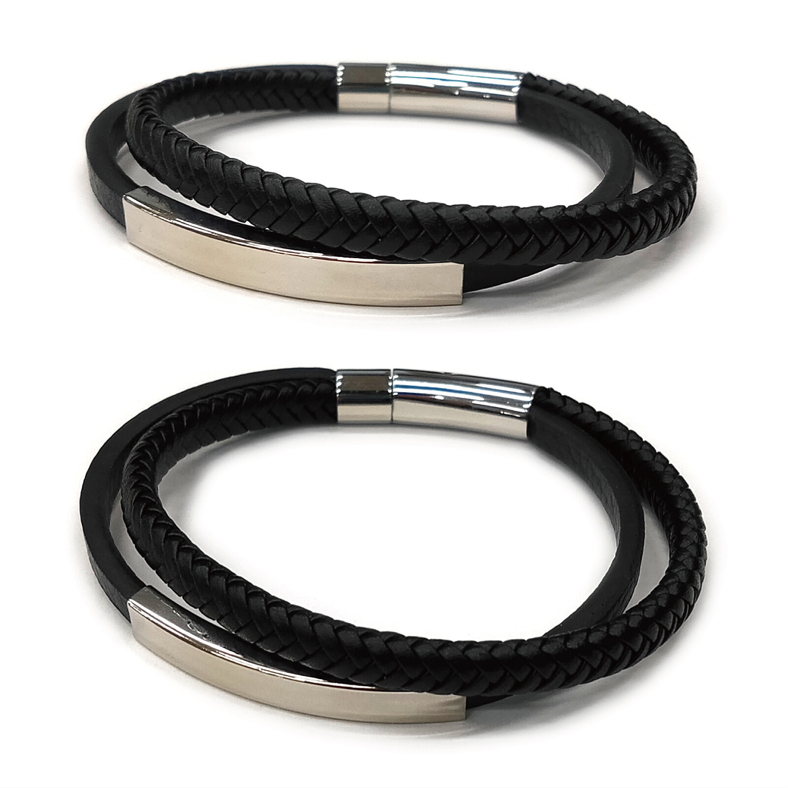 ステンレス製のプレートを配置したしなやかで厚みのあるシボ平革に、編込革をレイヤードし、ステンレス製の留め具パーツを配置した2連レザーブレスレット。