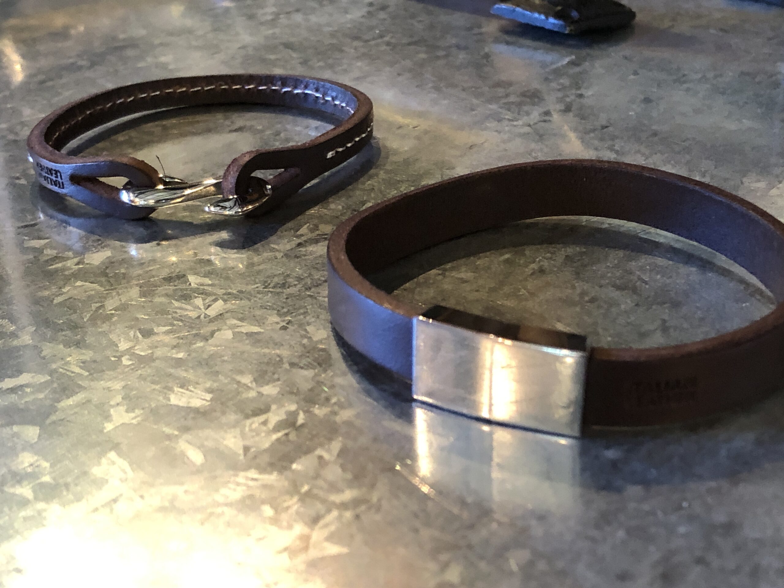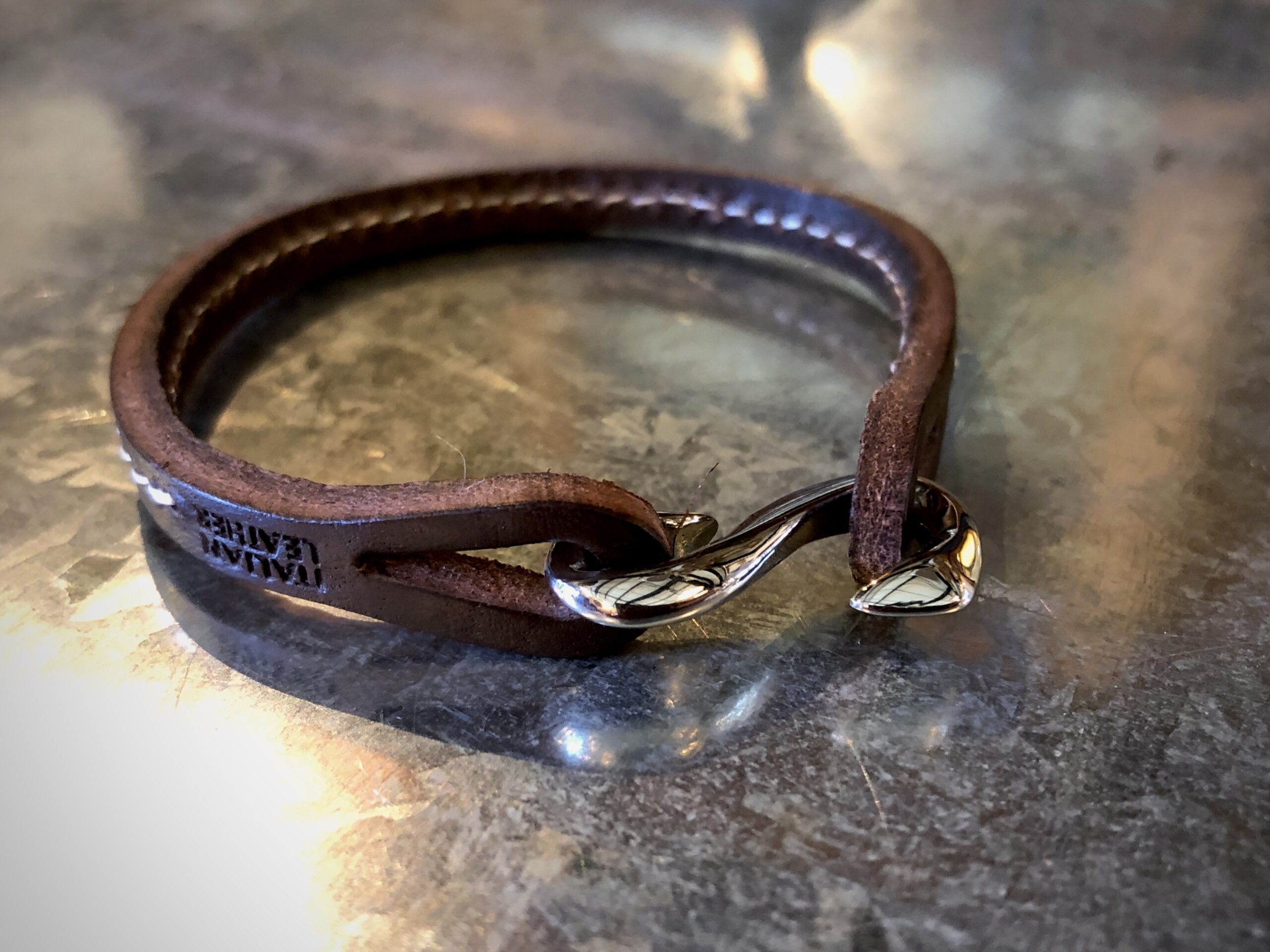 イタリア製牛革をベースにシルバーカラーのステンレス製Sフックを配置したレザーブレスレット。