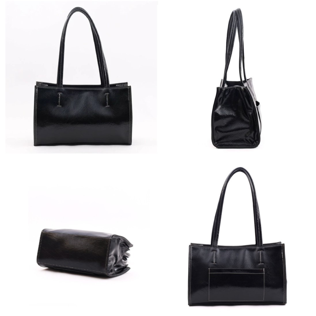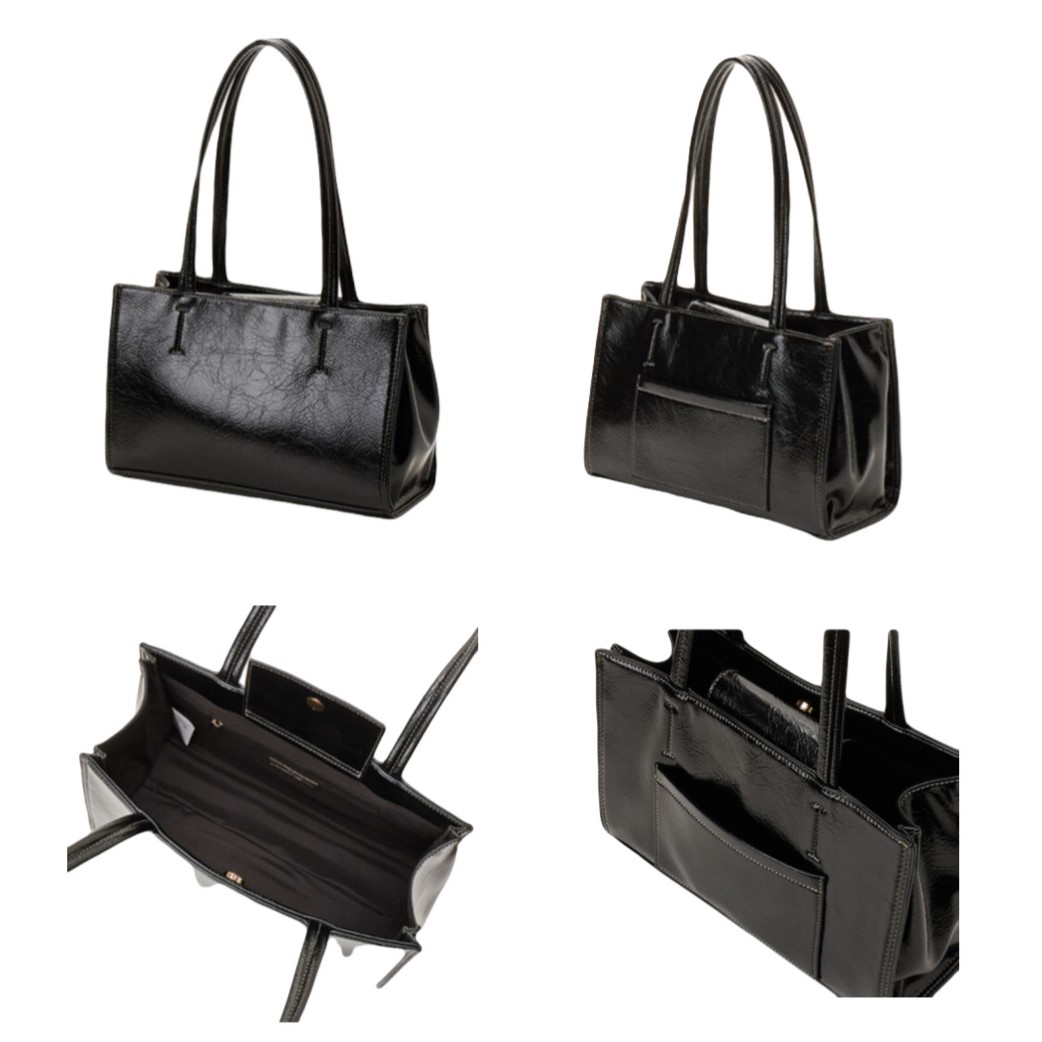 艶やかなフェイクレザーの素材で、スクエアのフォルムがベーシックかつ上品なシルエットのハンドバッグ。
