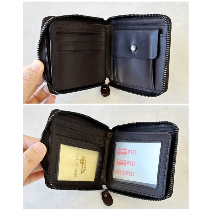 クリアーなカード入れが2カ所付き。磁気カードや定期入れ使い分けができる作りになっています。ファスナー開閉で2つ折りタイプはコンパクトに収納でき持ち歩きにも便利です。