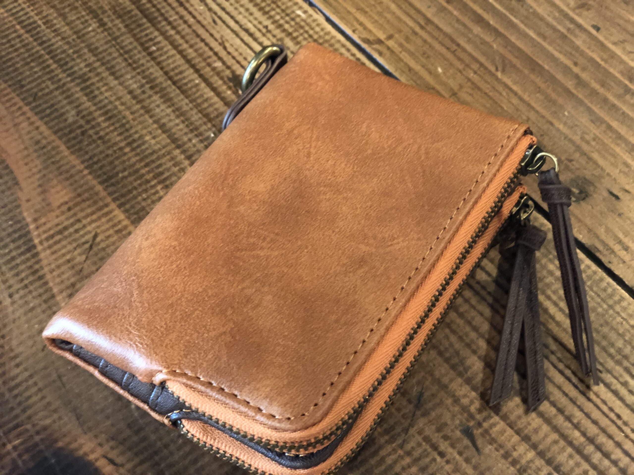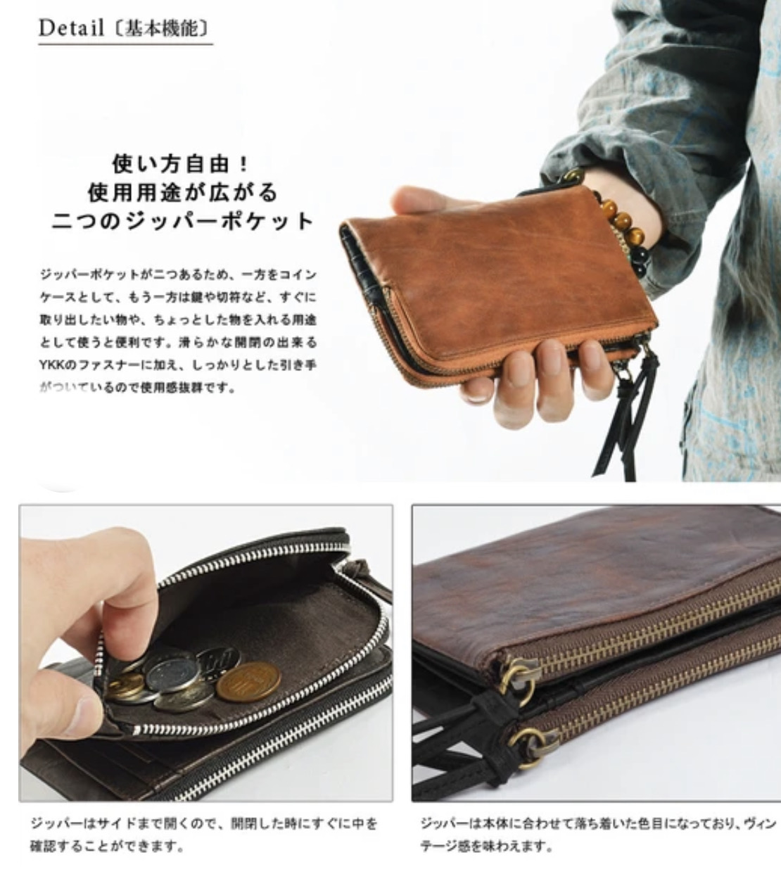 両サイドにコインケースを備えたシンプルな二つ折り財布。ジッパーポケットが二つあるため、