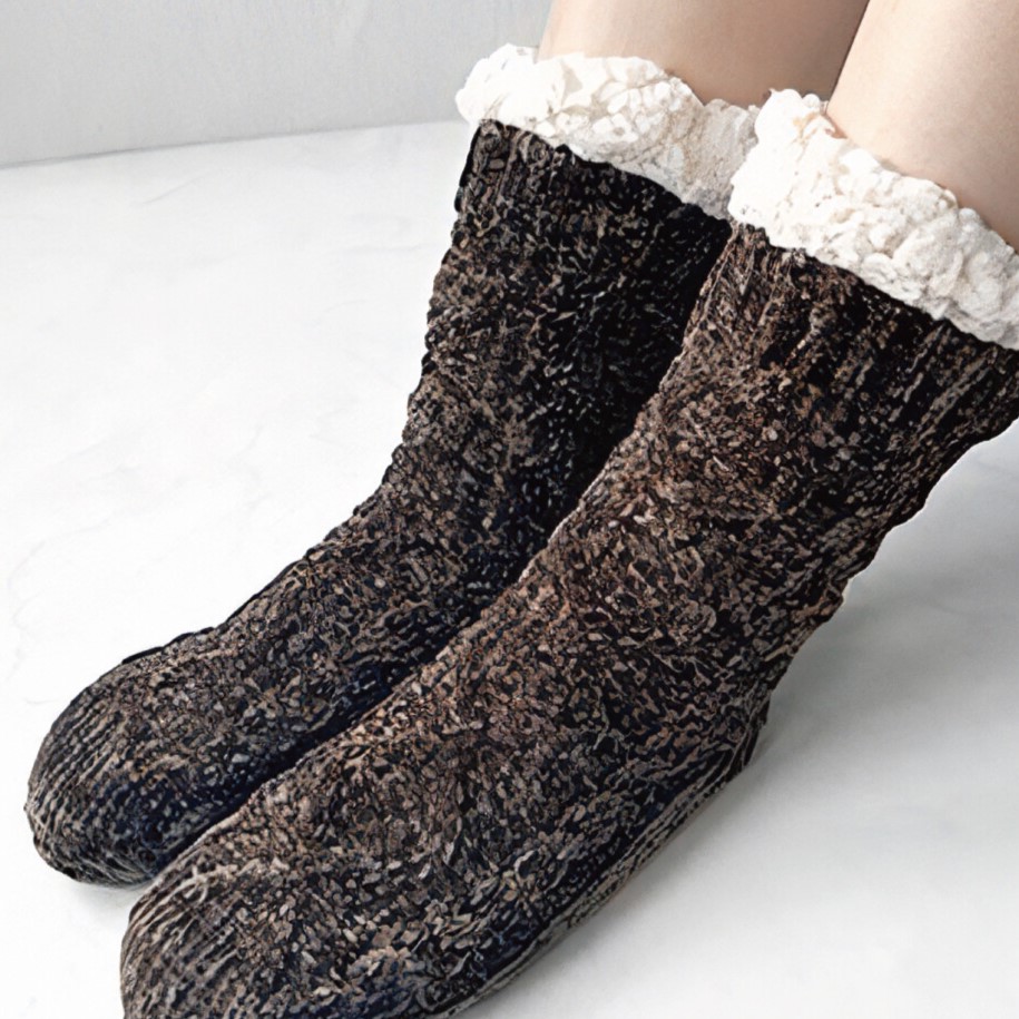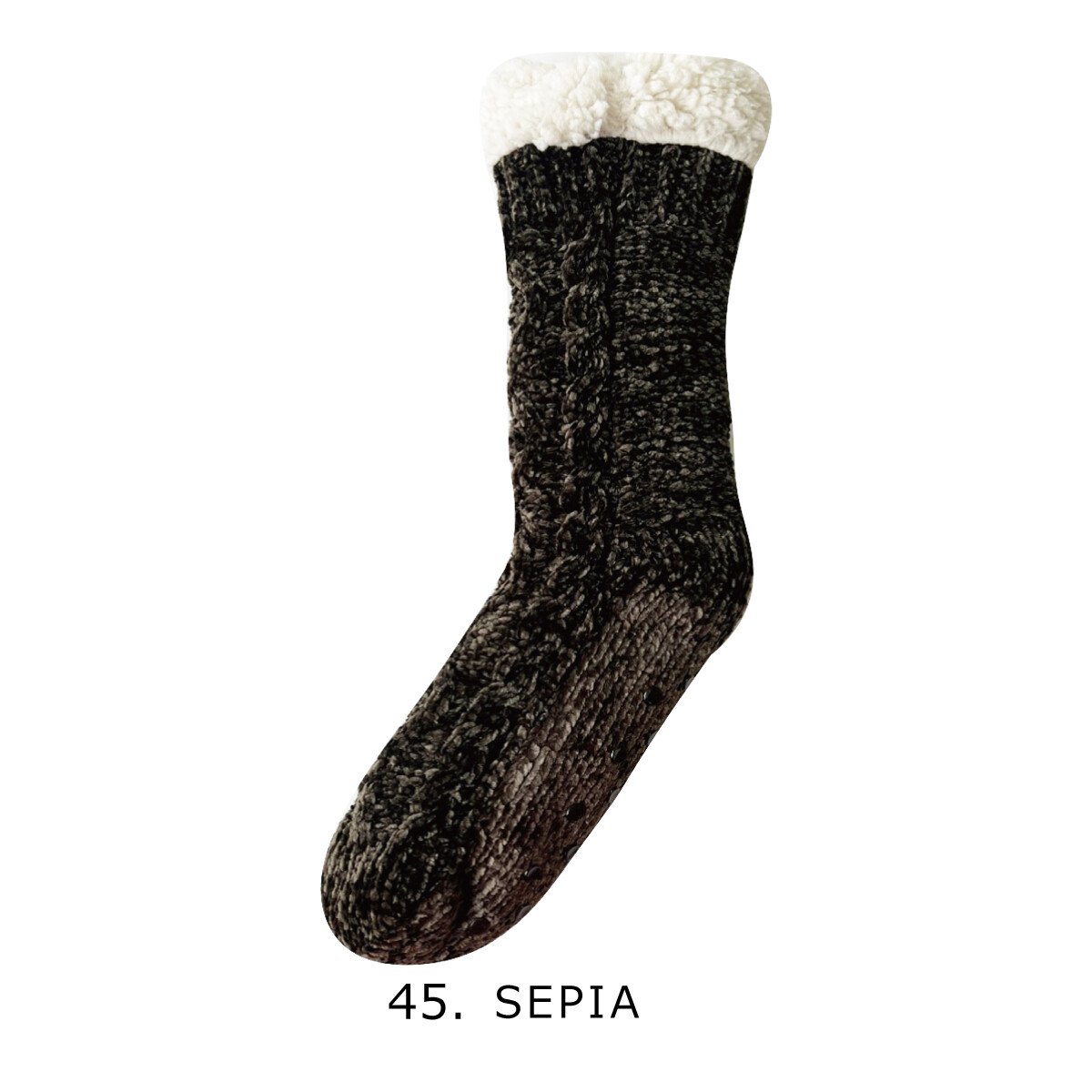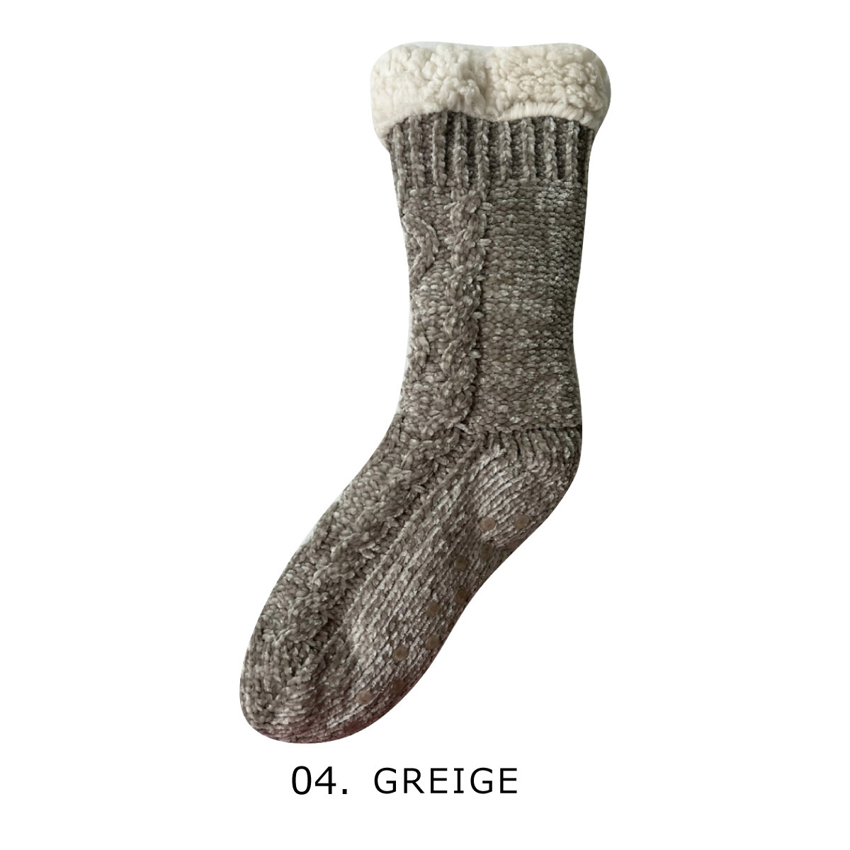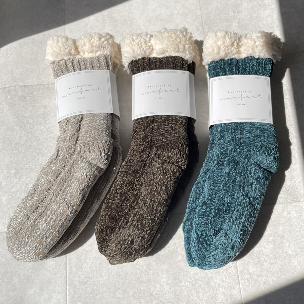 モールヤーンの温かみのある表地と、ボリューム感のある内ボアのルームソックス。