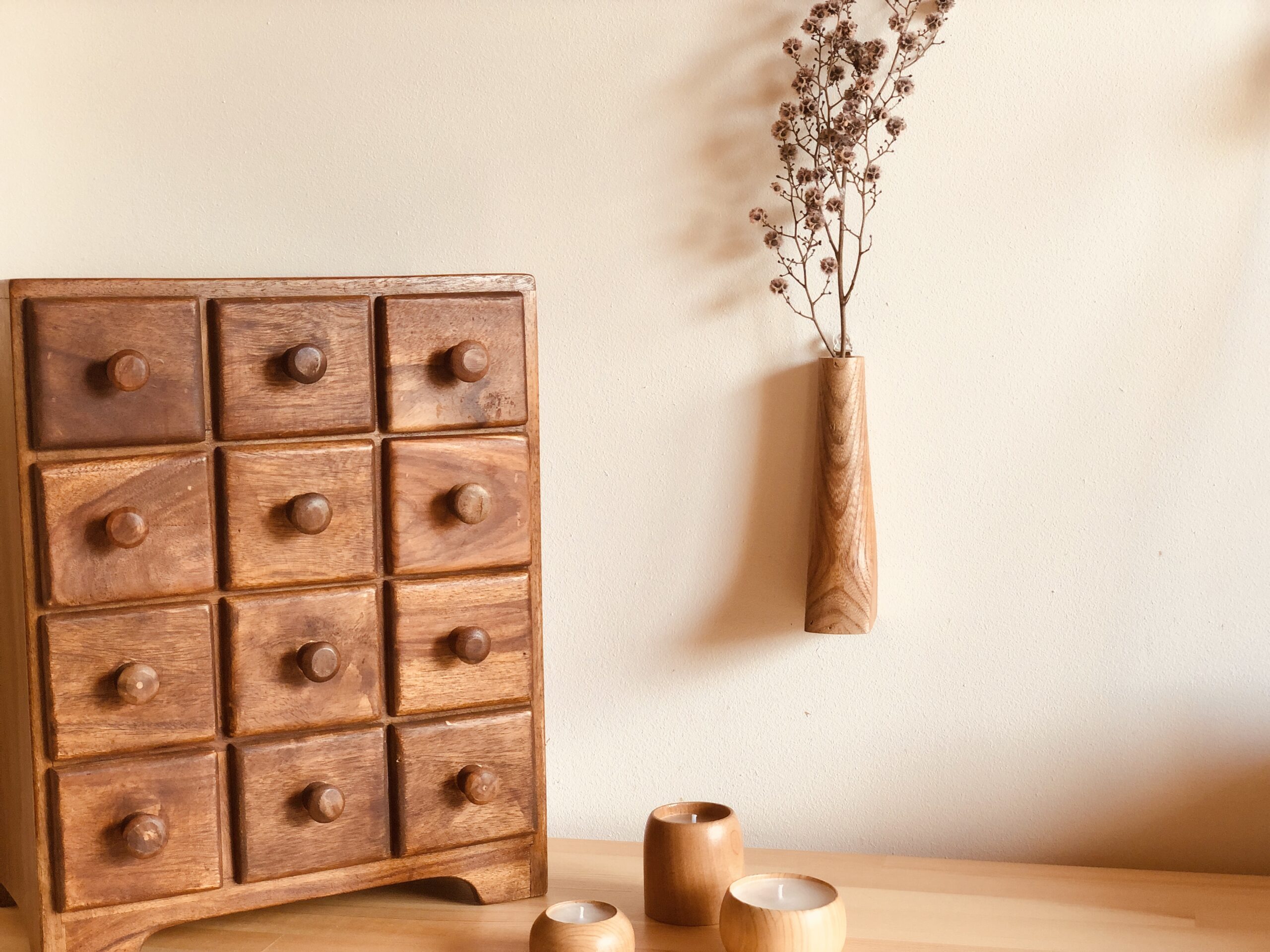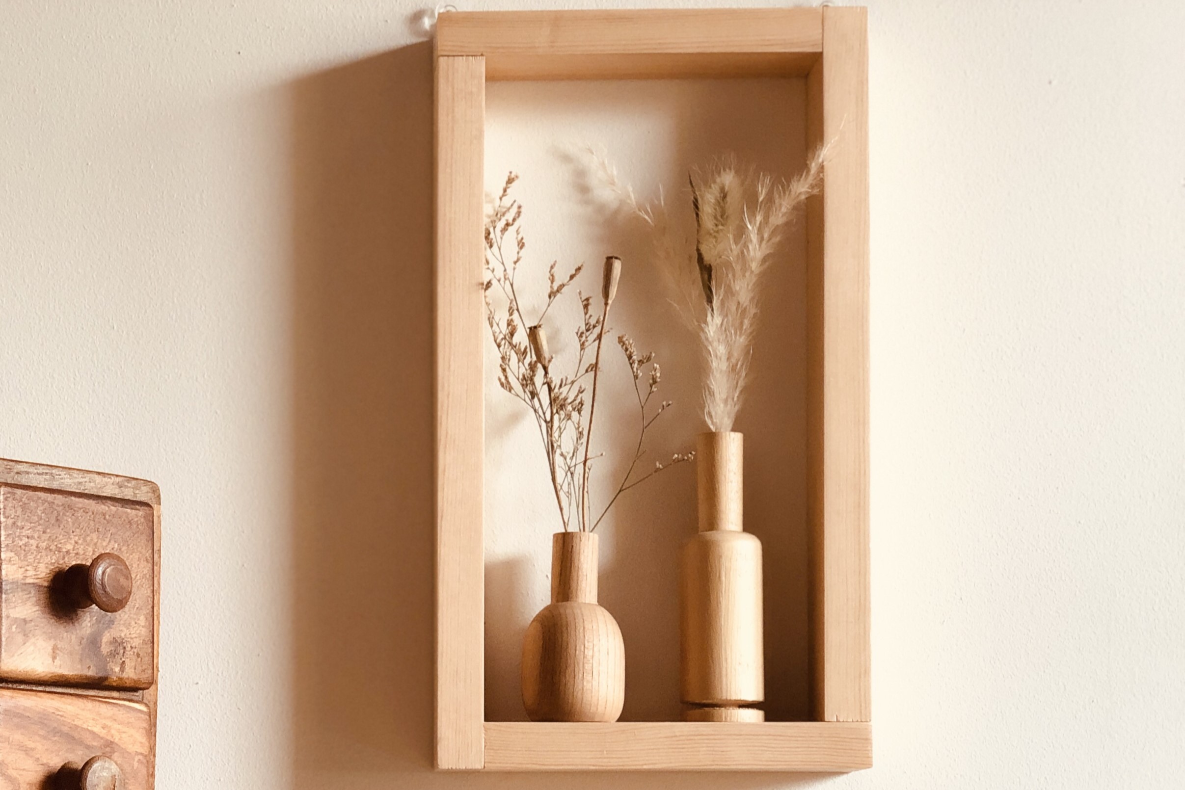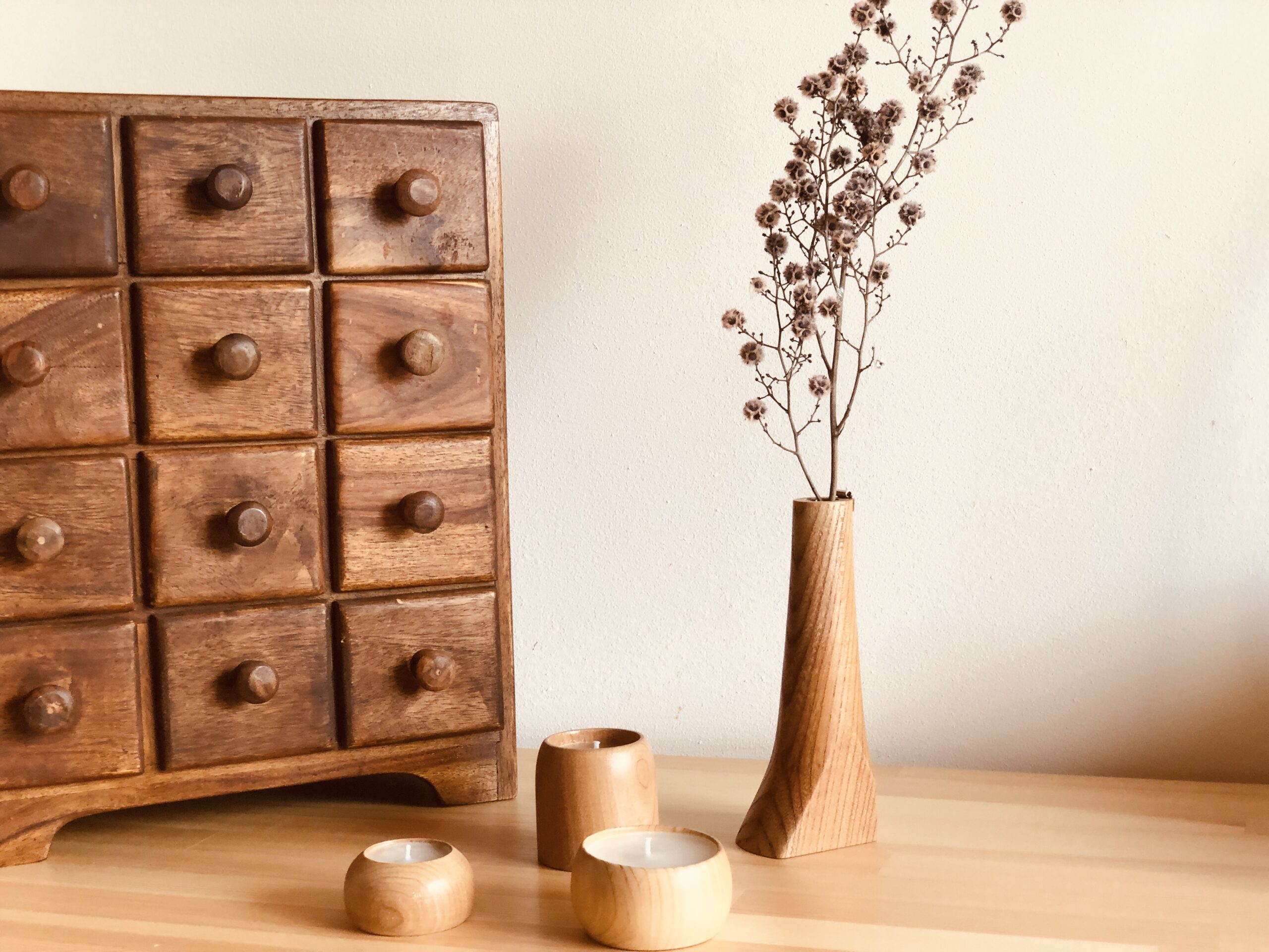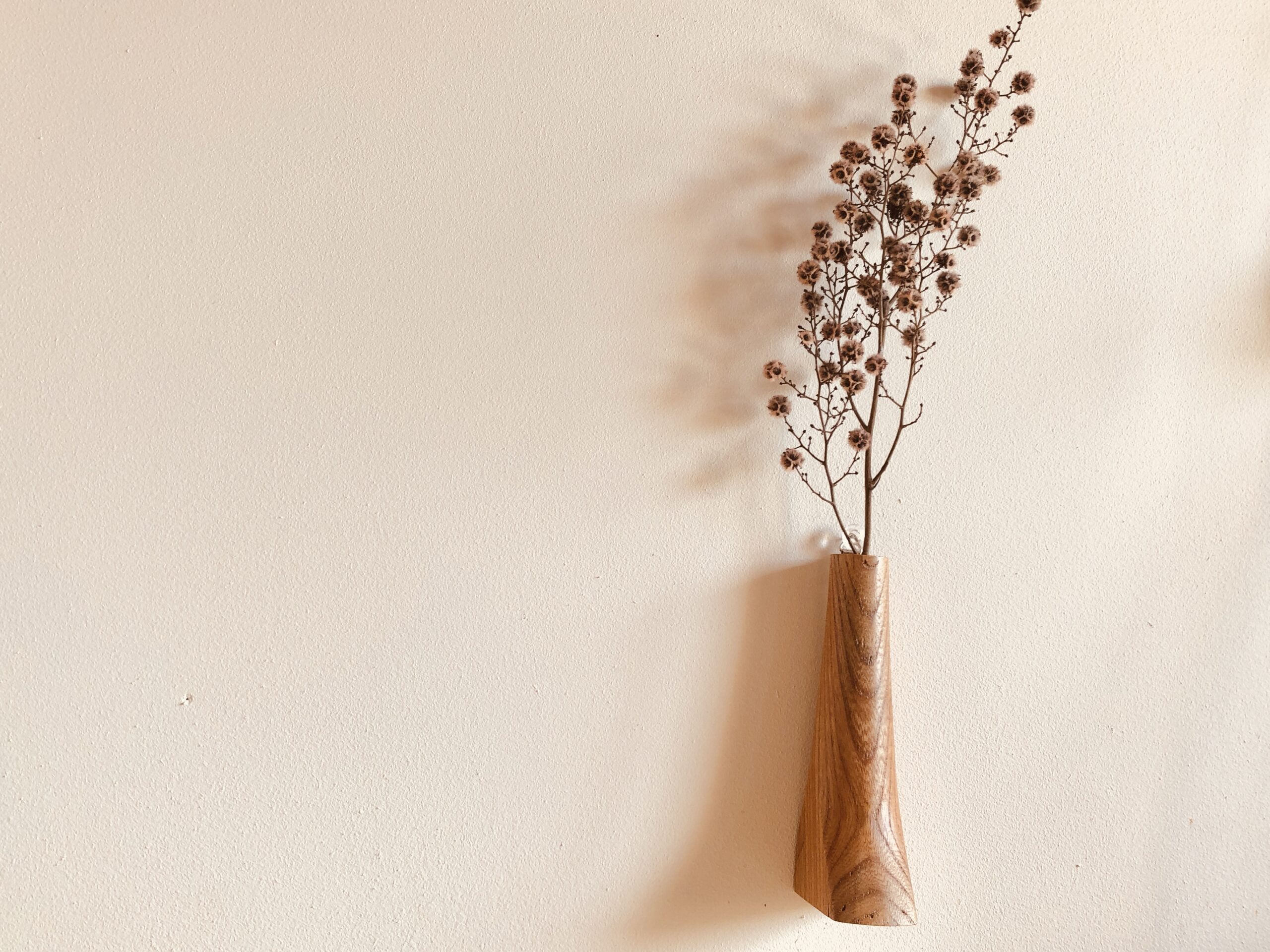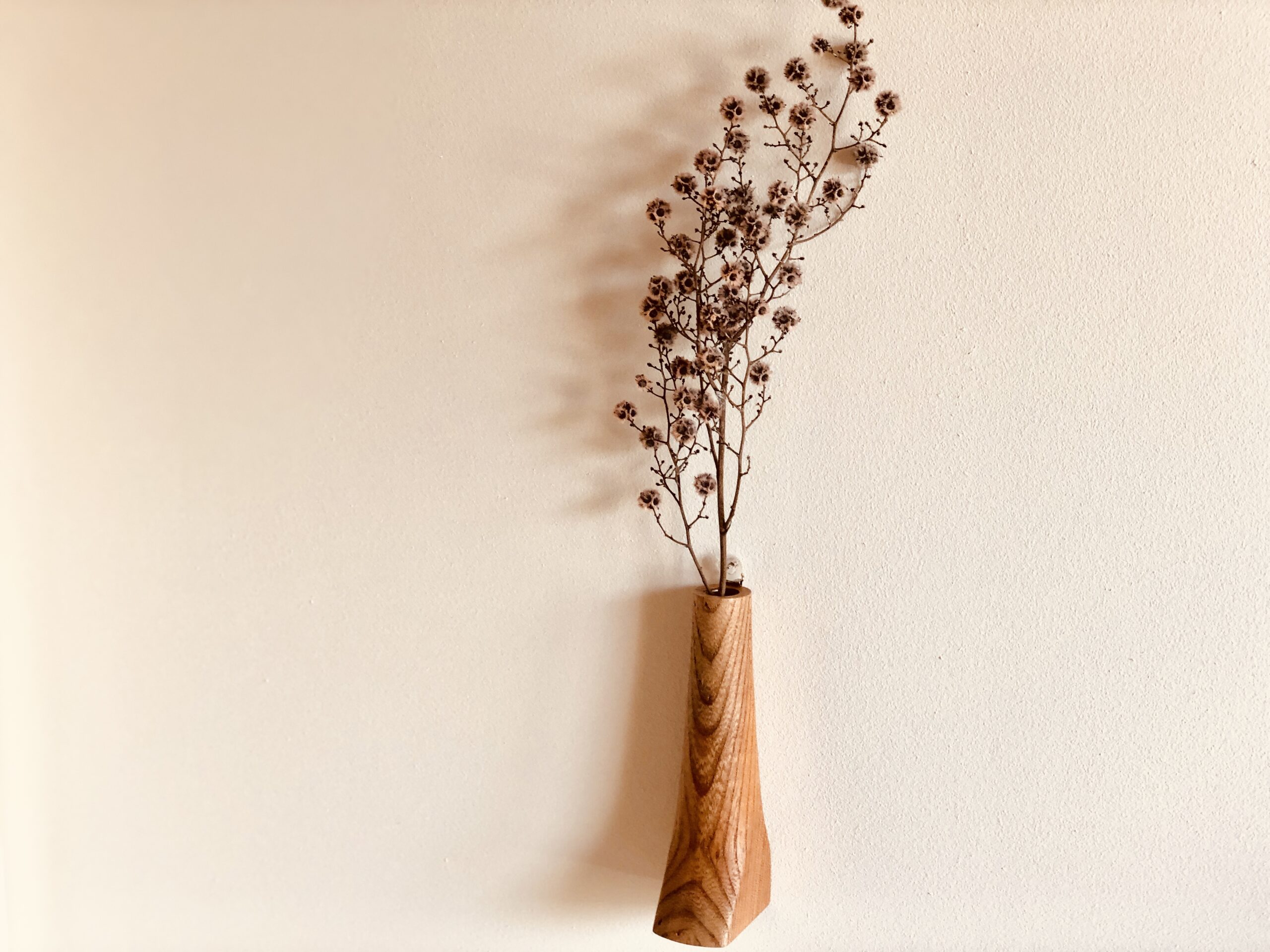 お気に入りのドライフラワーをウッドフラワーベースにディスプレイして、インテリアのアクセントにいかがですか?