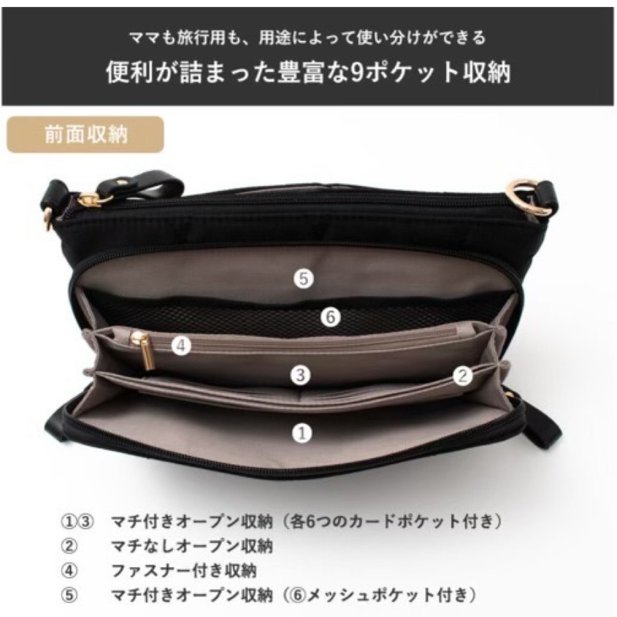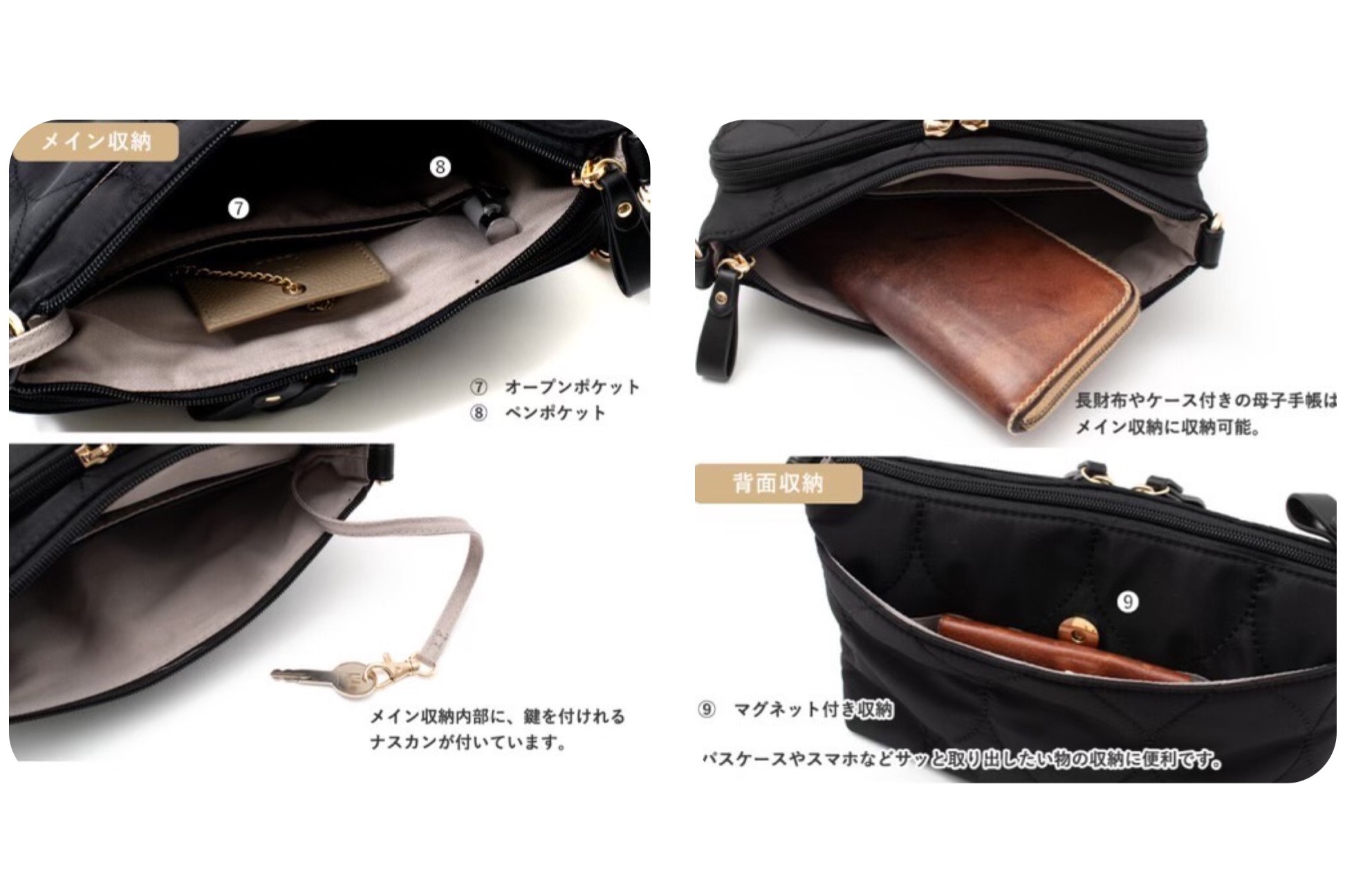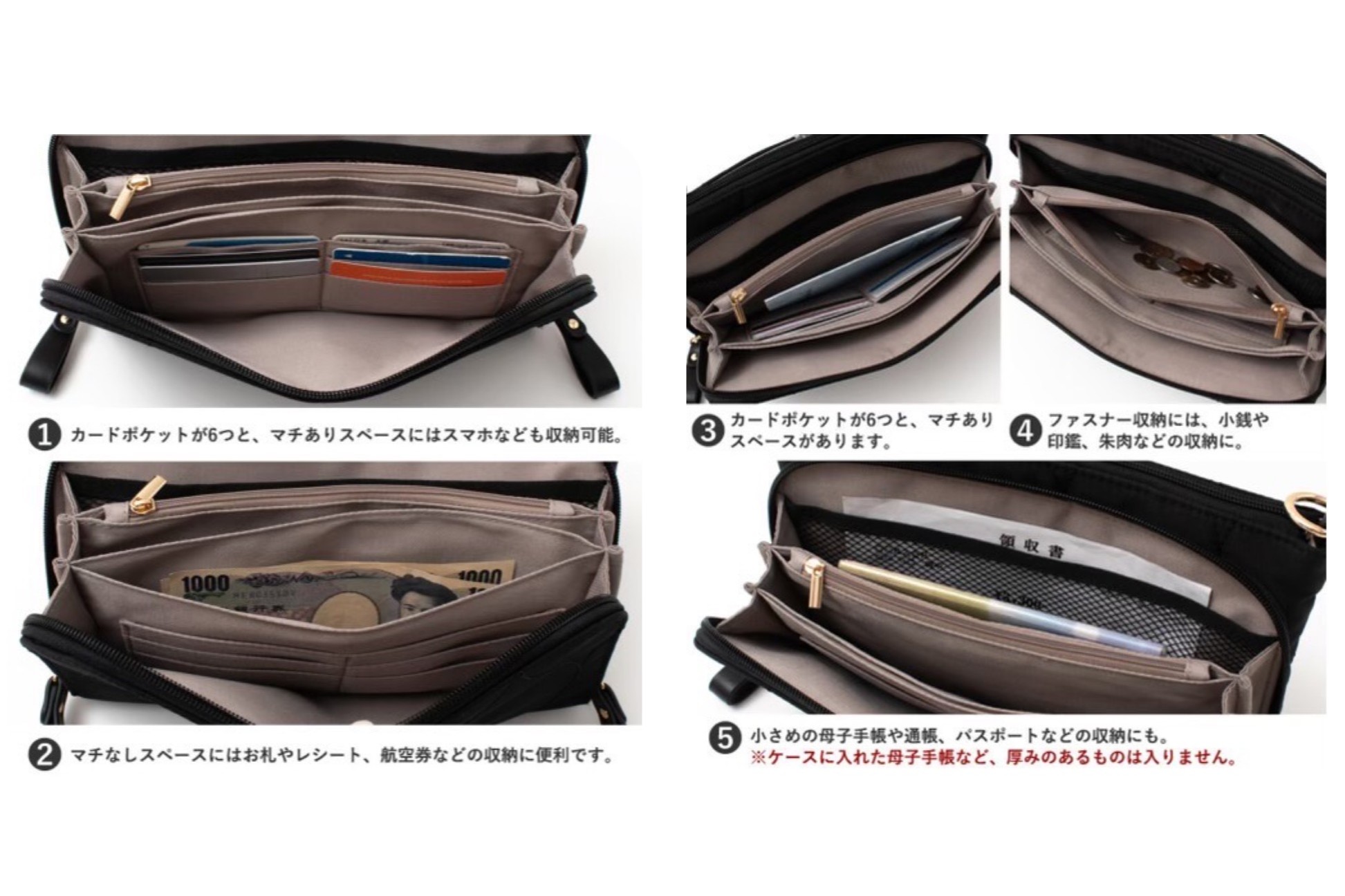●前面ポケット:カード入れ12箇所、マチありオープン収納3、マチなしオープン収納1、ファスナー付き収納1、メッシュポケット1