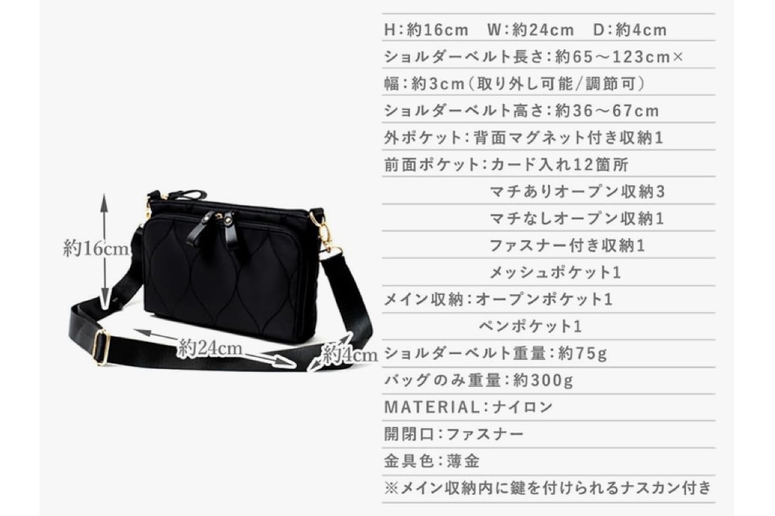 ●ショルダーベルト長さ:約65〜123cm×幅:約3cm(取り外し可能/調節可)