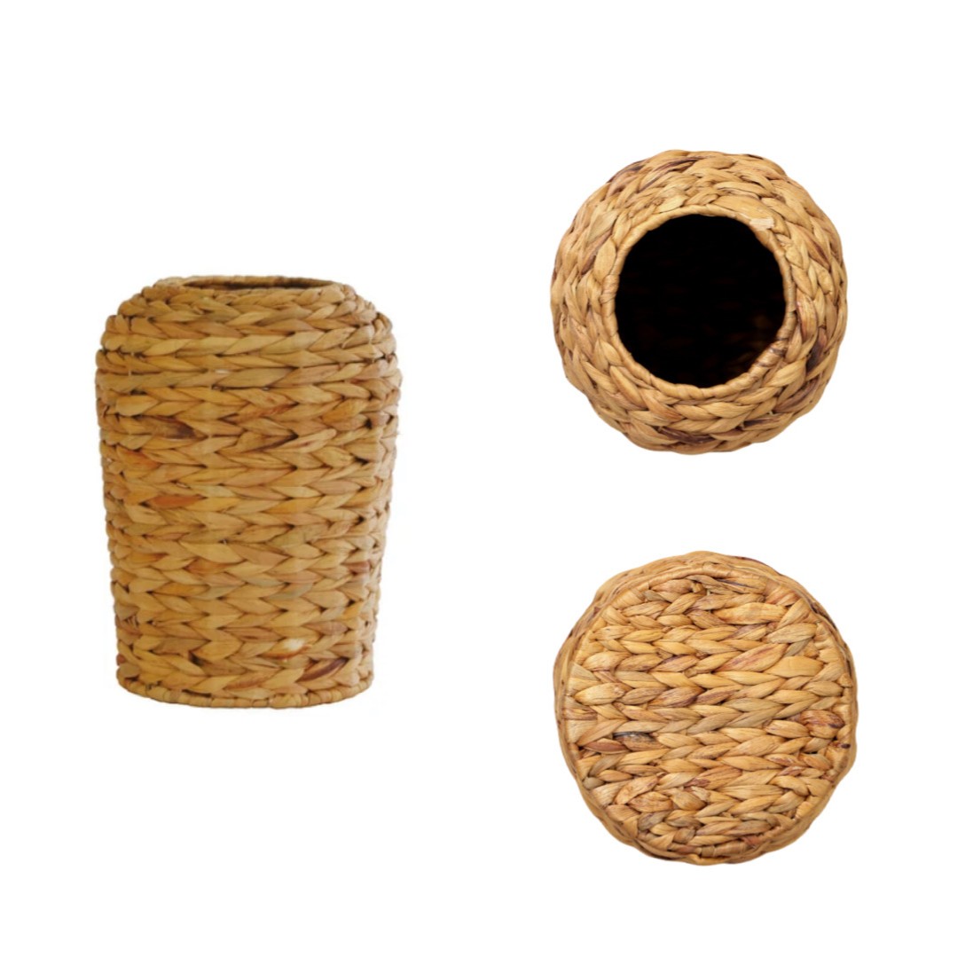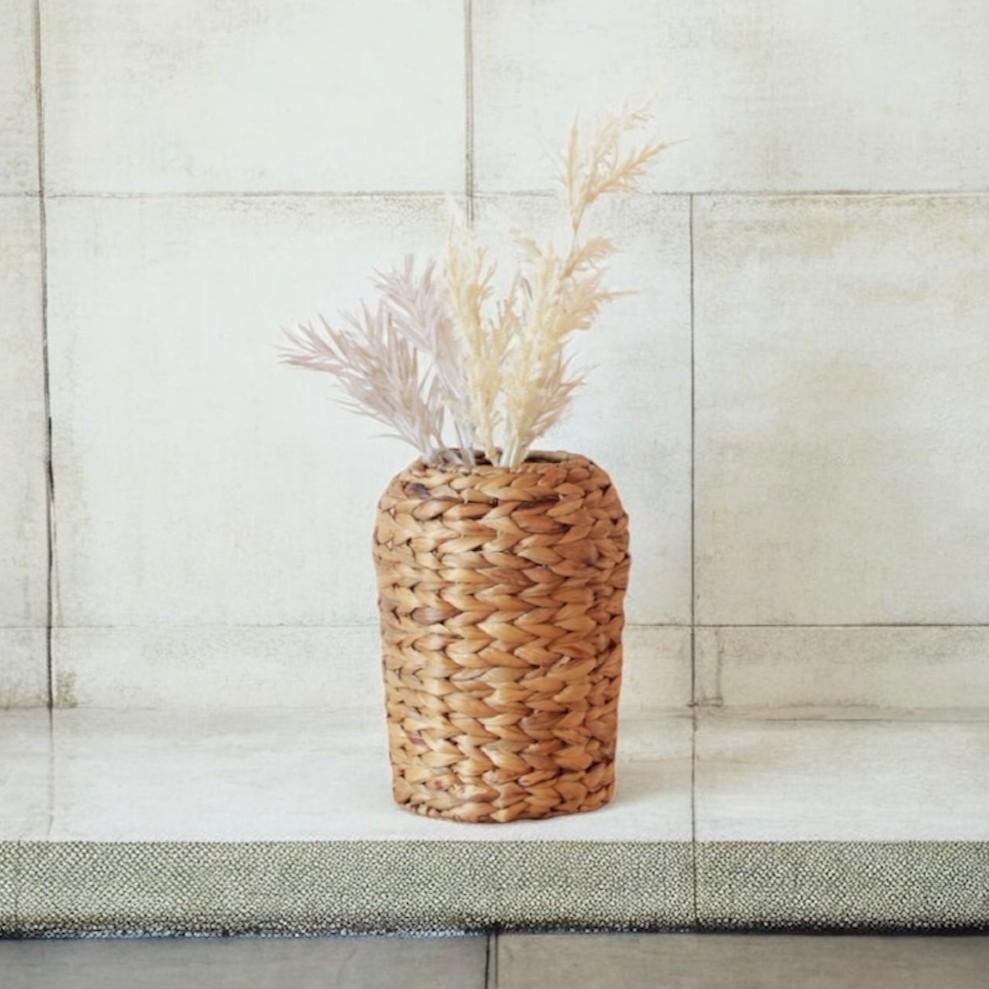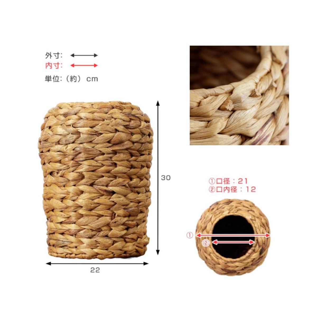 陶器のオブジェのようなフォルムが大きな花を彩るラタンベース。