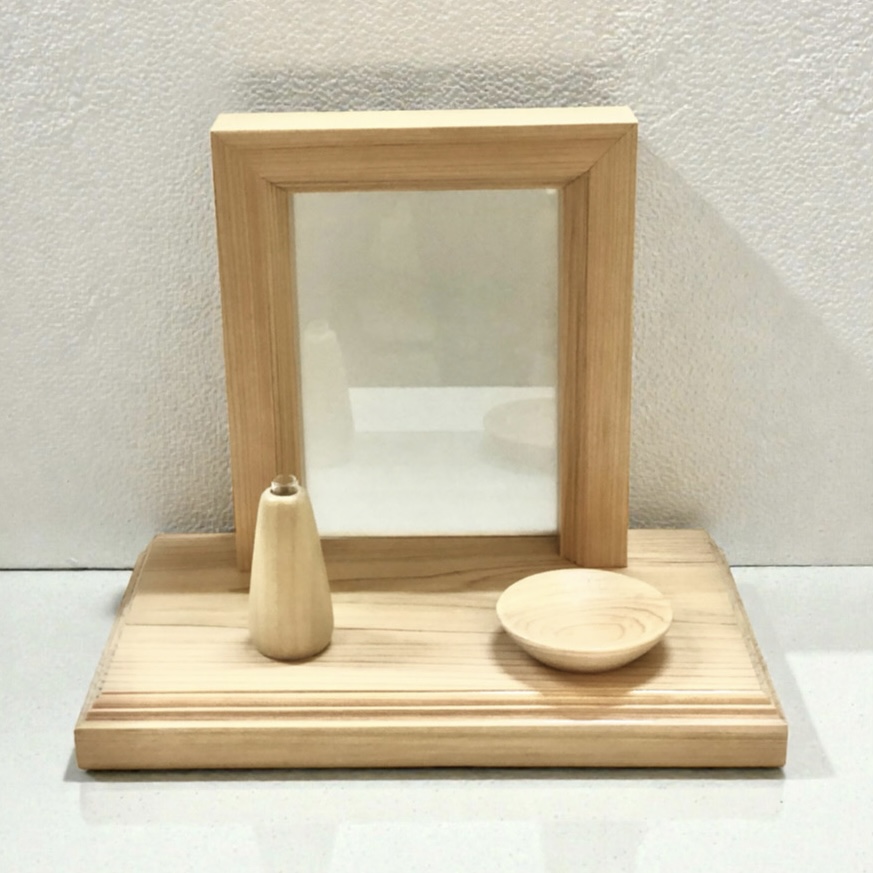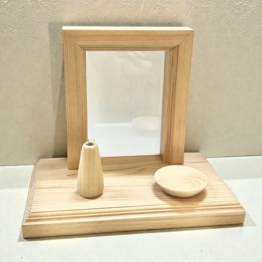 木のフラワーベースとお供え用の小皿付き。