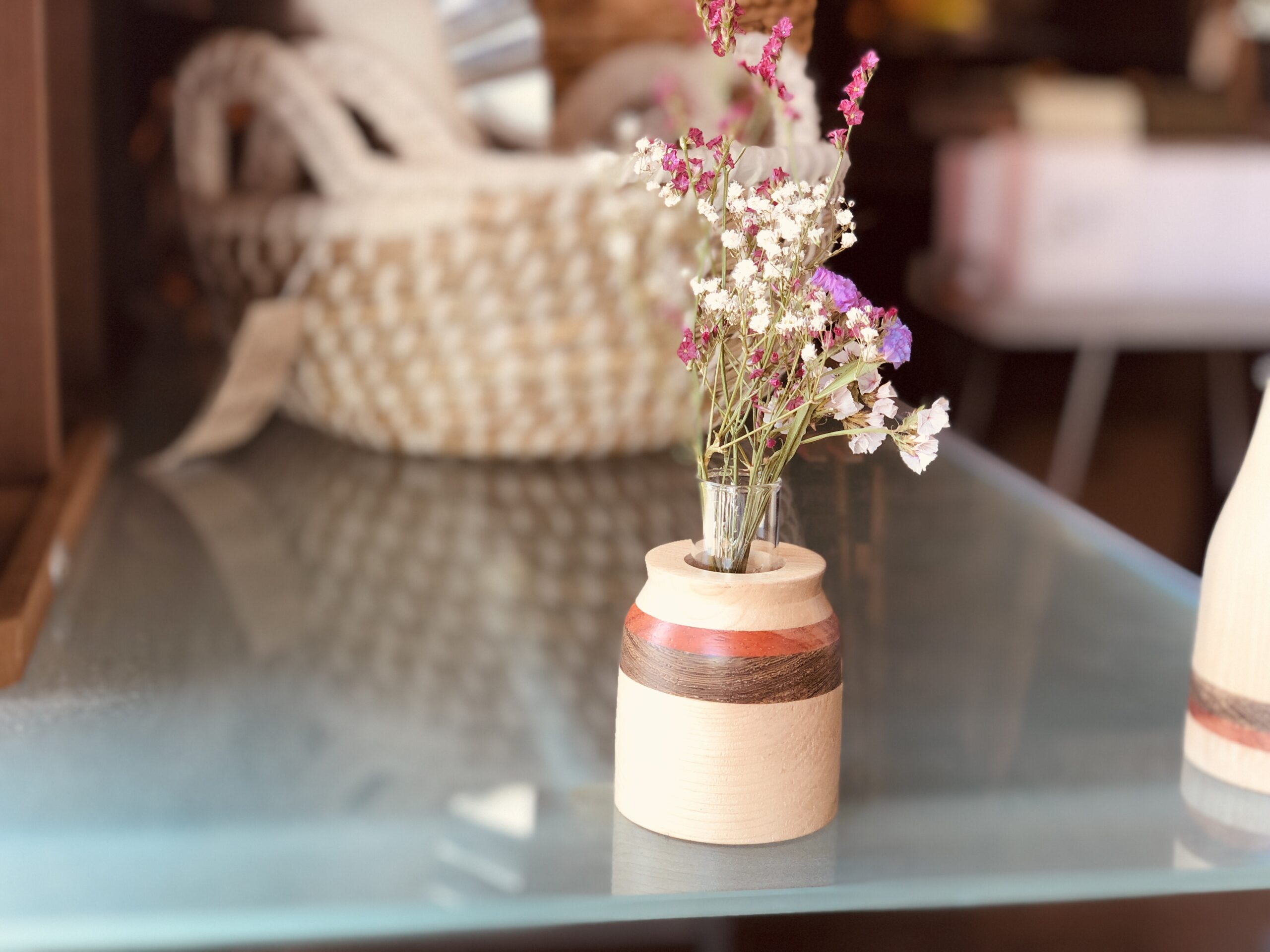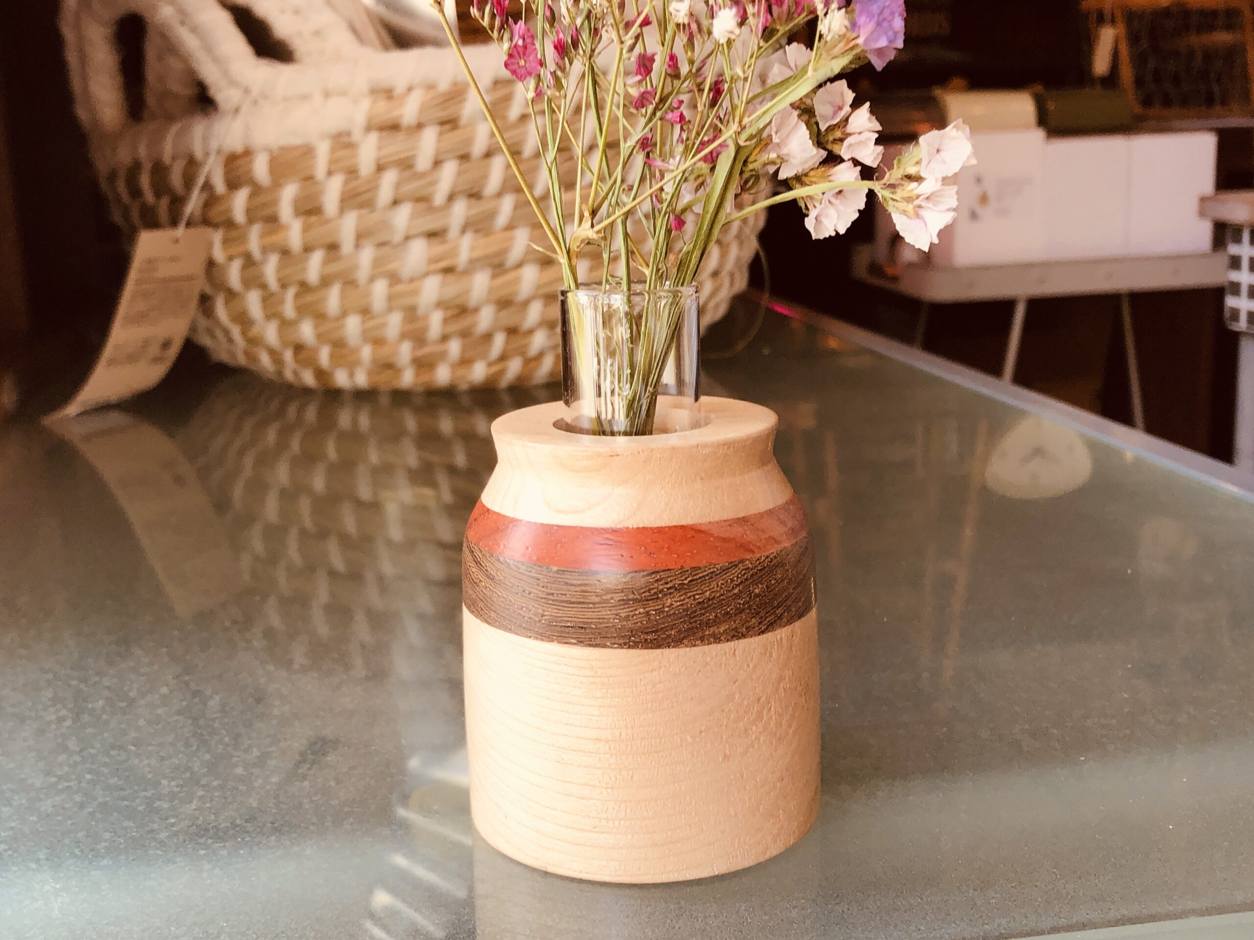 色の違う木を組み合わせた寄木のフラワーベース