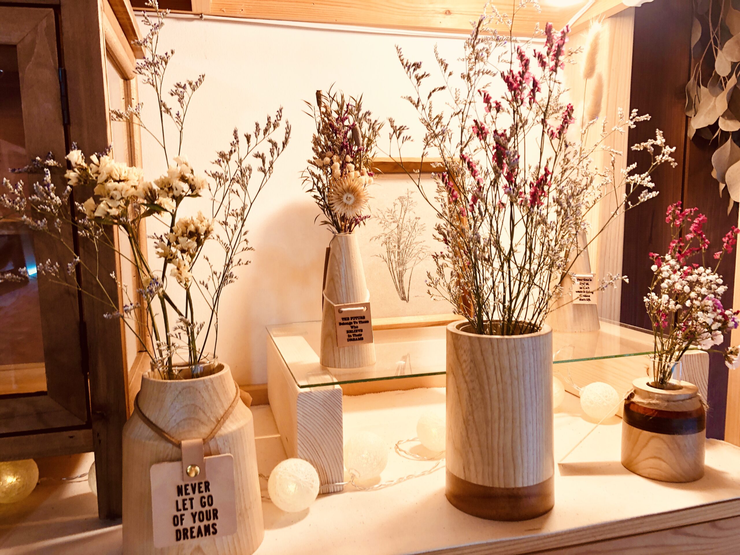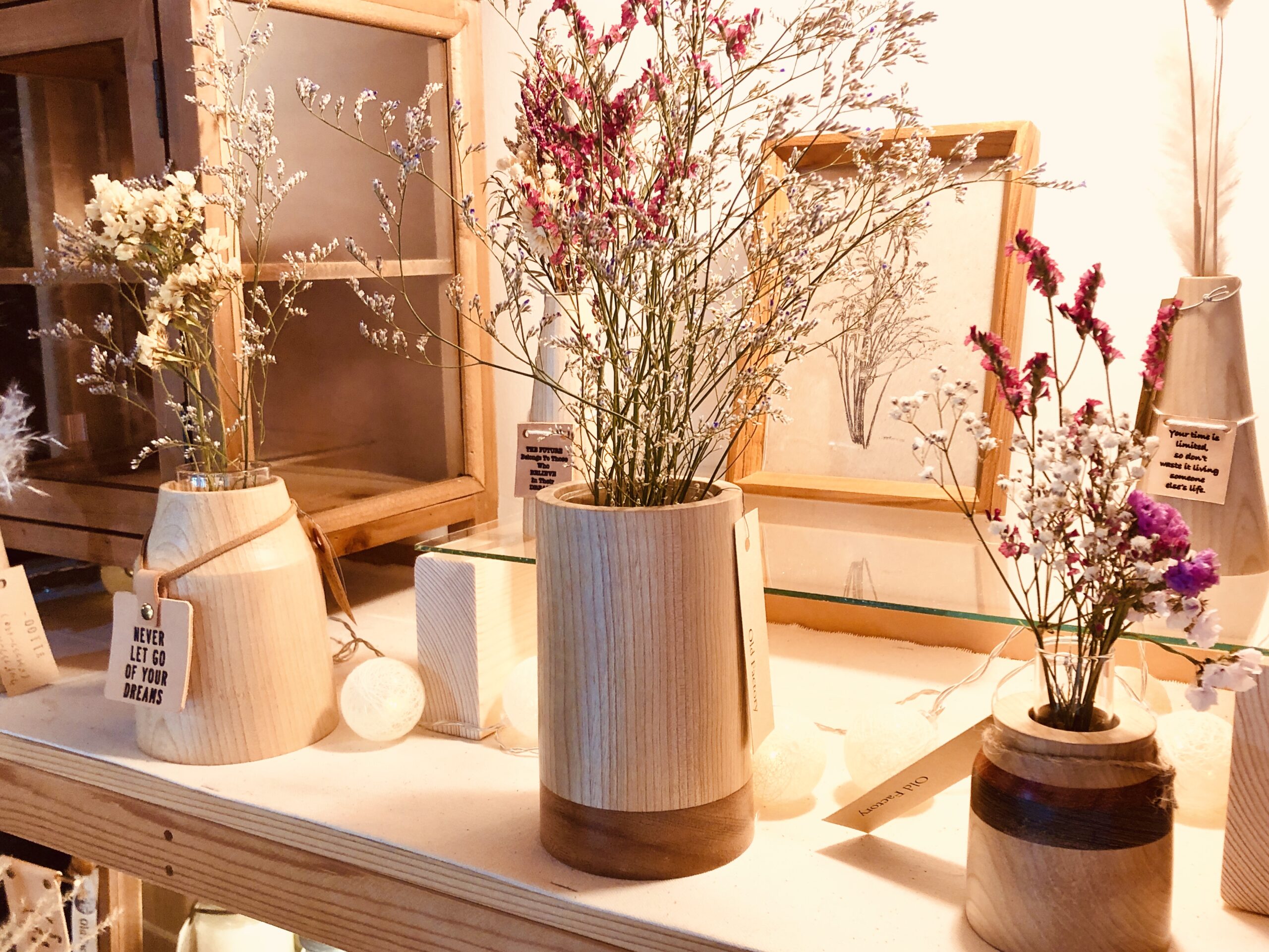 お気に入りのドライフラワーをウッドフラワーベースにディスプレイして、