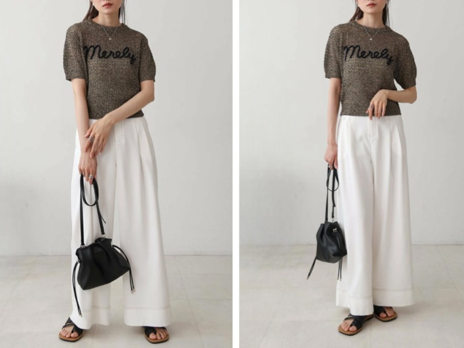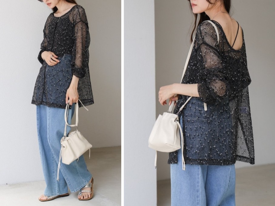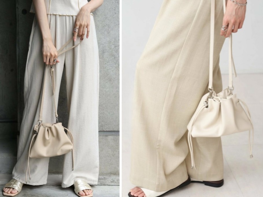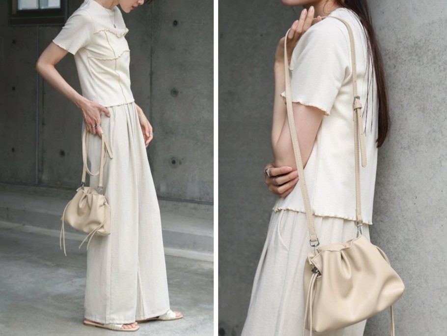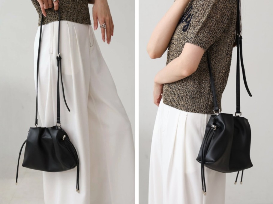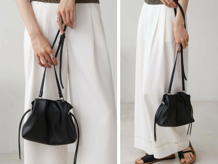 巾着タイプでカジュアルからフェミニンまで幅広いスタイルに対応。