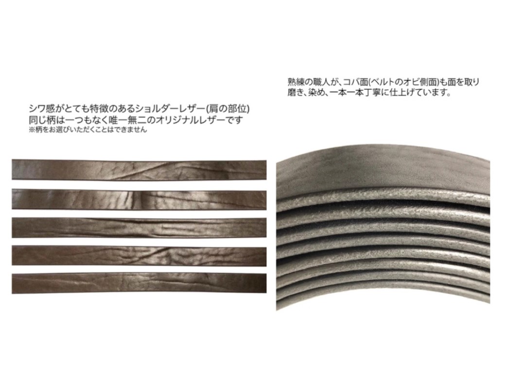 日本屈指の栃木レザー社の上質なベジタブルタンニングレザー(通称ヌメ革)を使用したショルダーベルト。