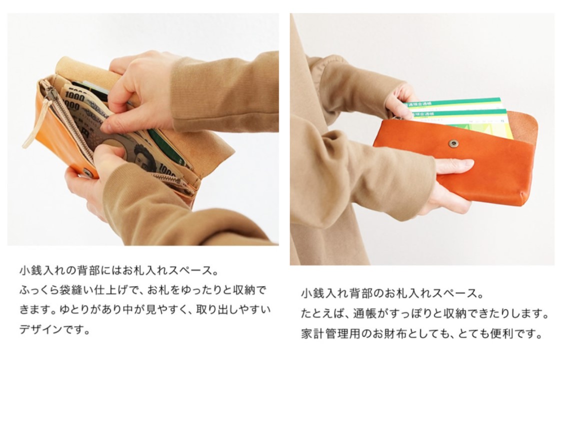 ファスナー付きの大きな小銭入れ、お札スペース、カード入れと満足できる収納力です。