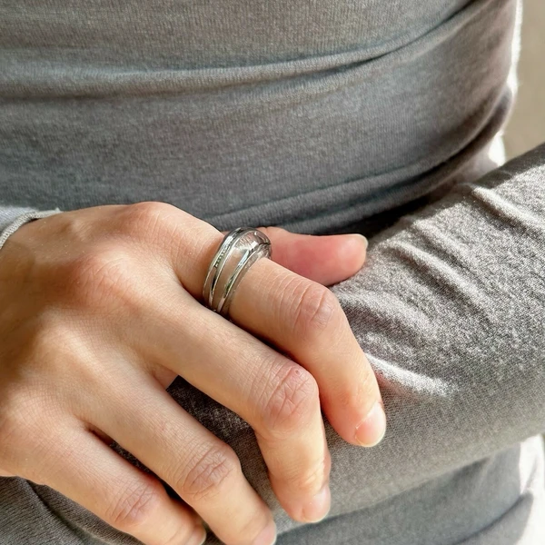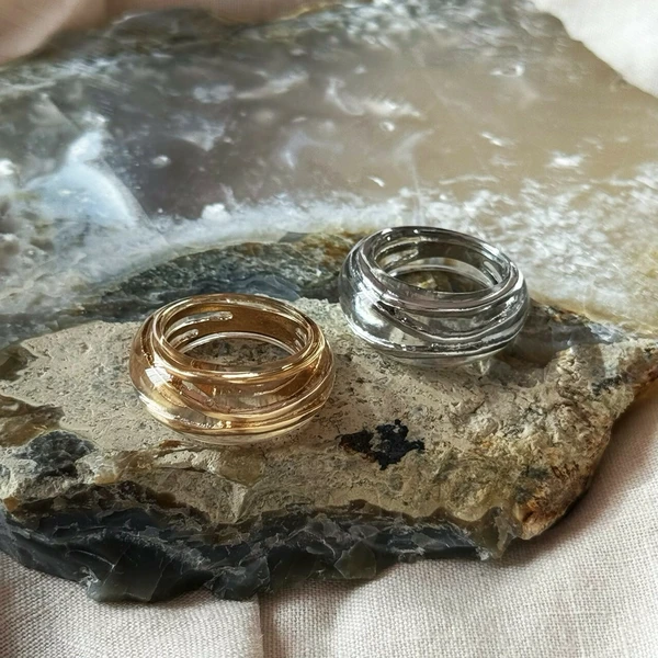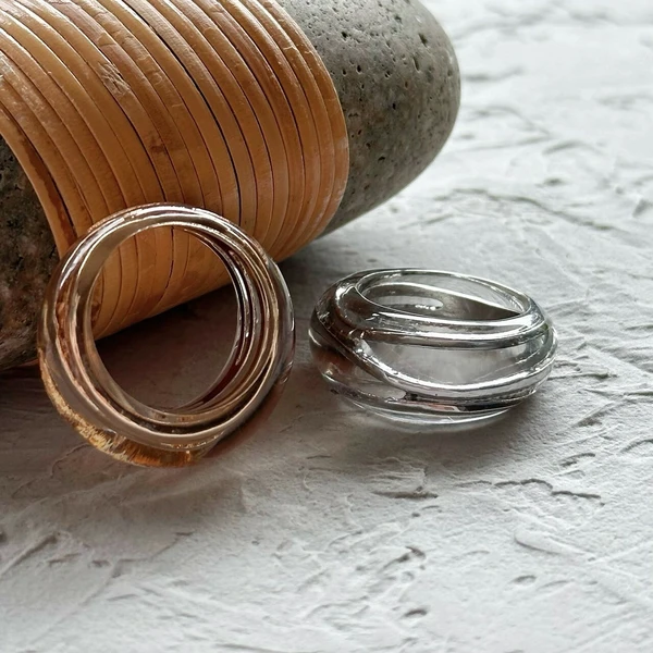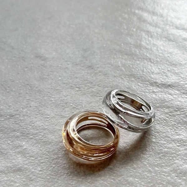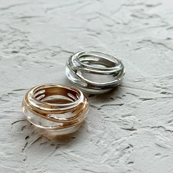 メタリックとクリア樹脂で程よい抜け感と存在感を発揮したデザインリング。