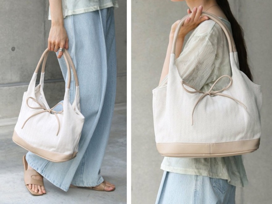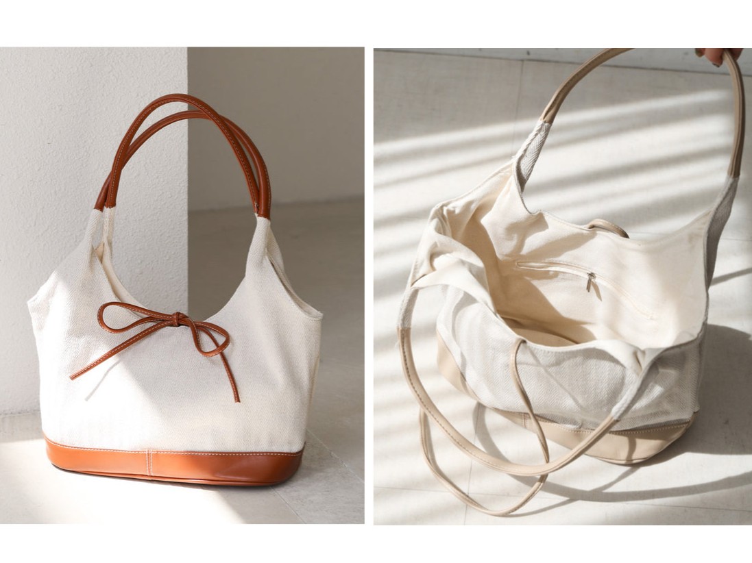 異素材の組み合わせと、上品なリボン紐が目を惹くトートバッグ。