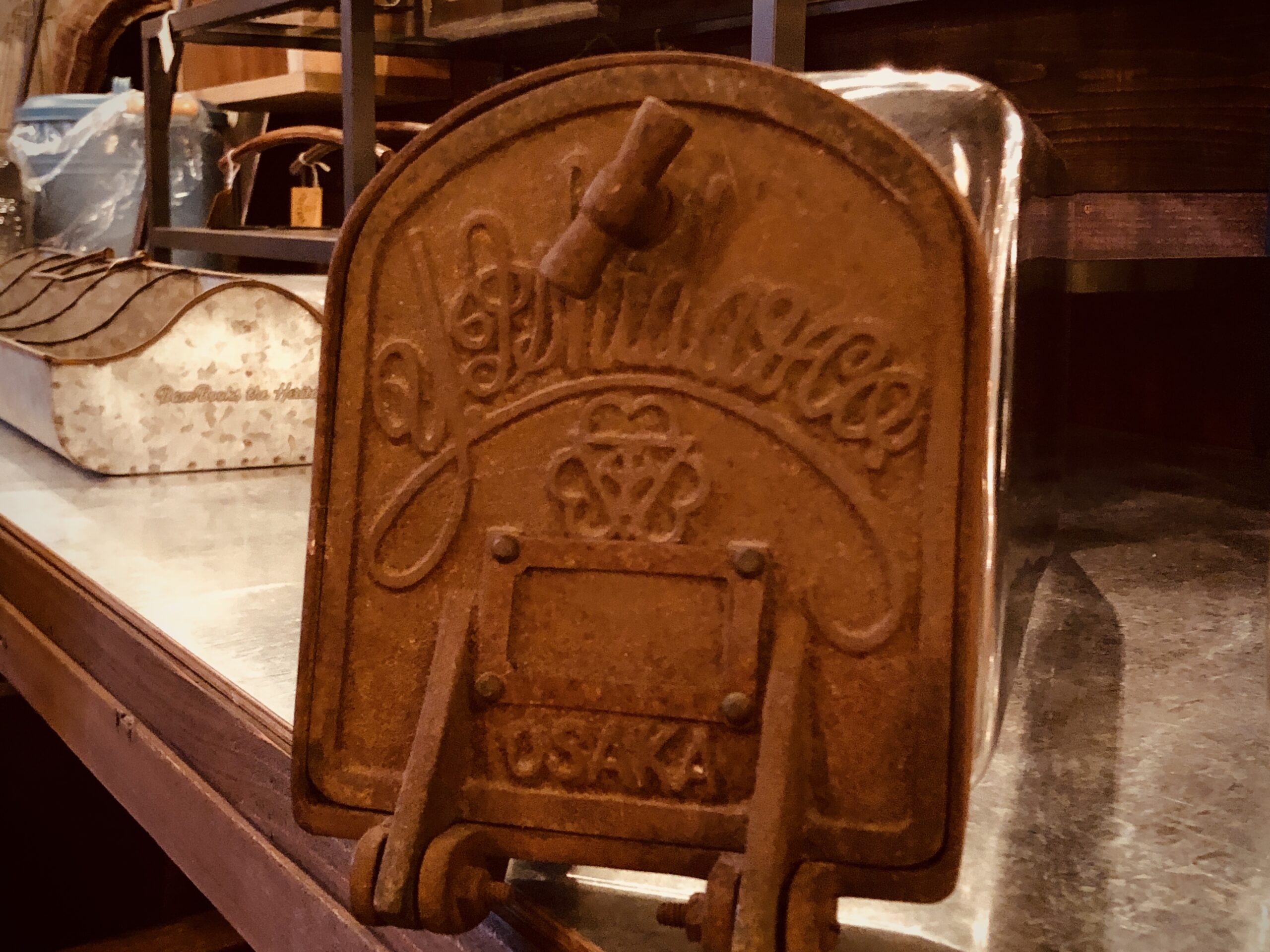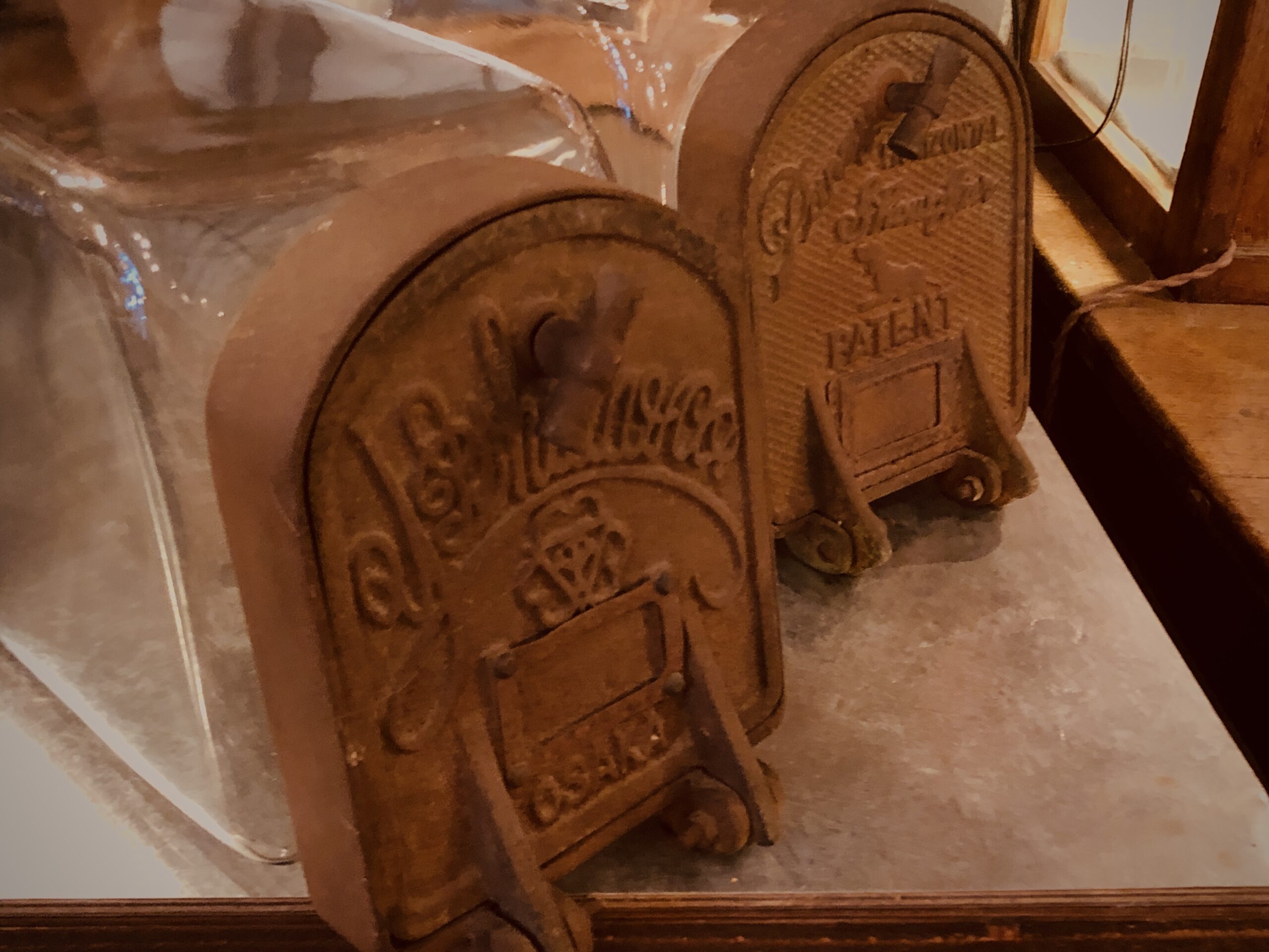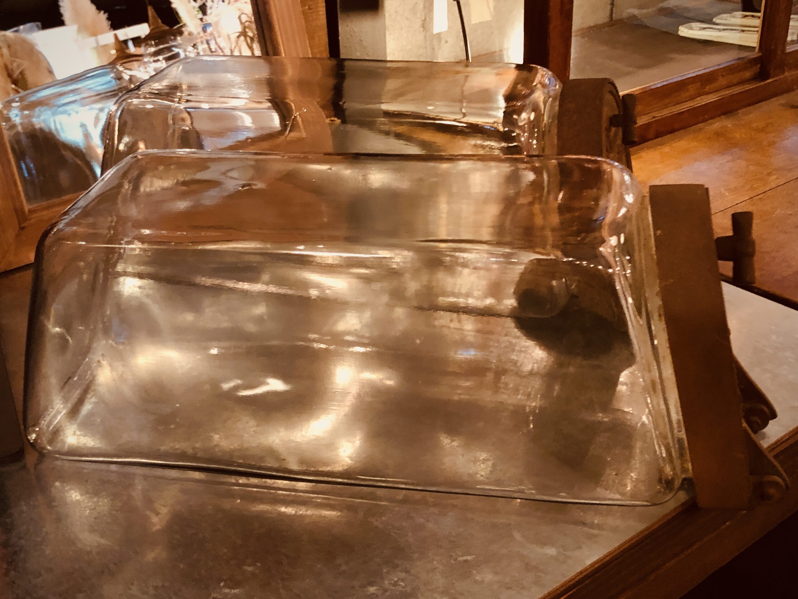 鉄製の蓋が付いた横置きタイプの駄菓子ビンです。