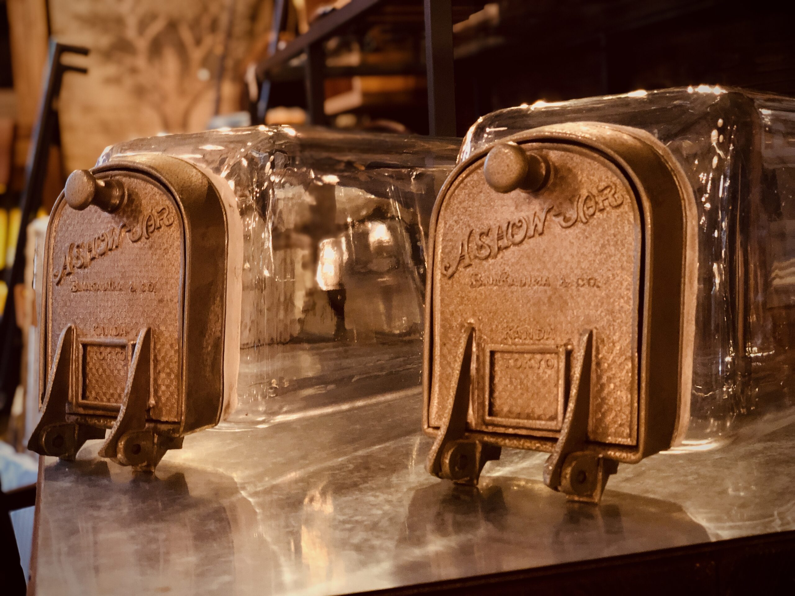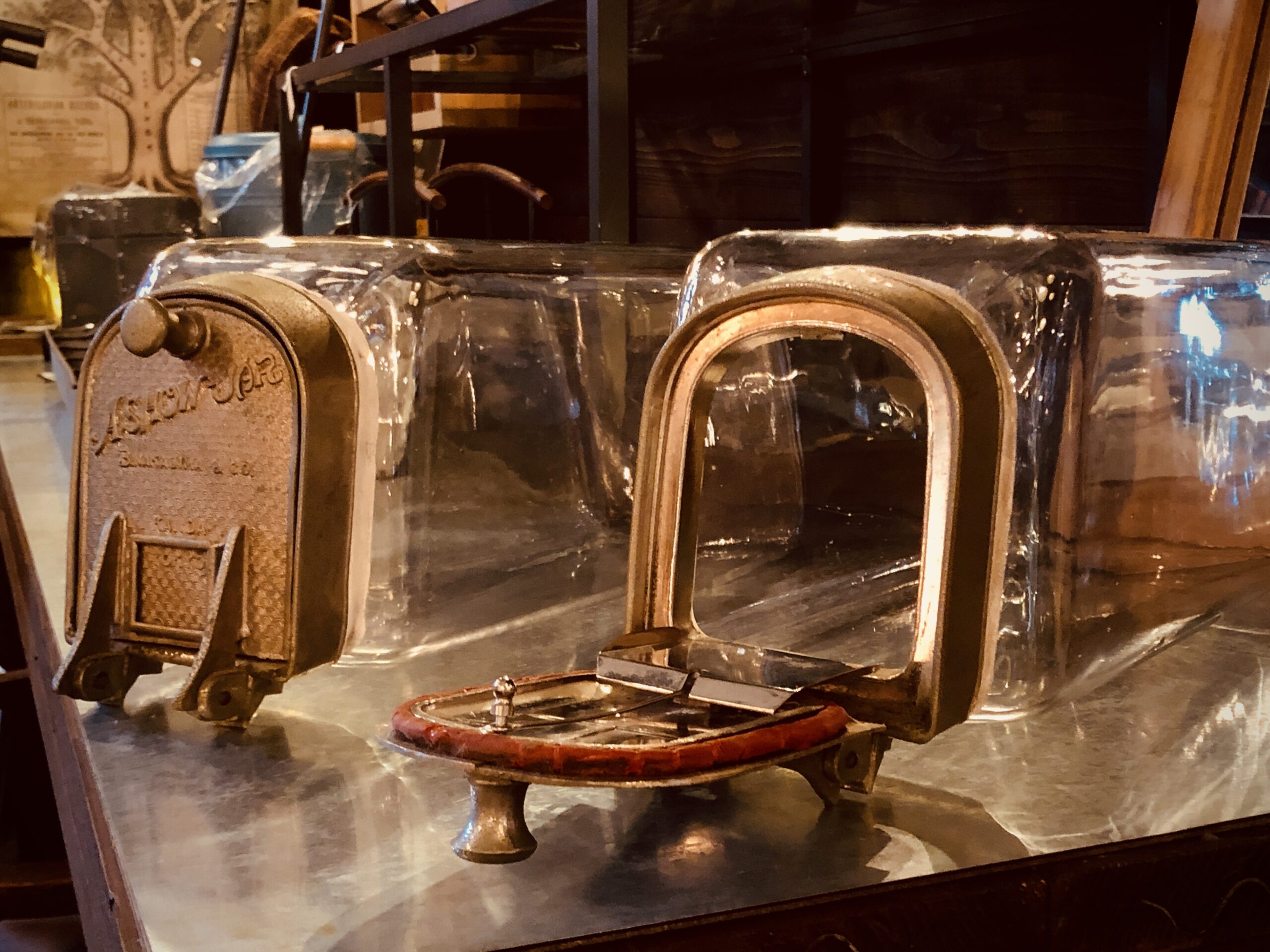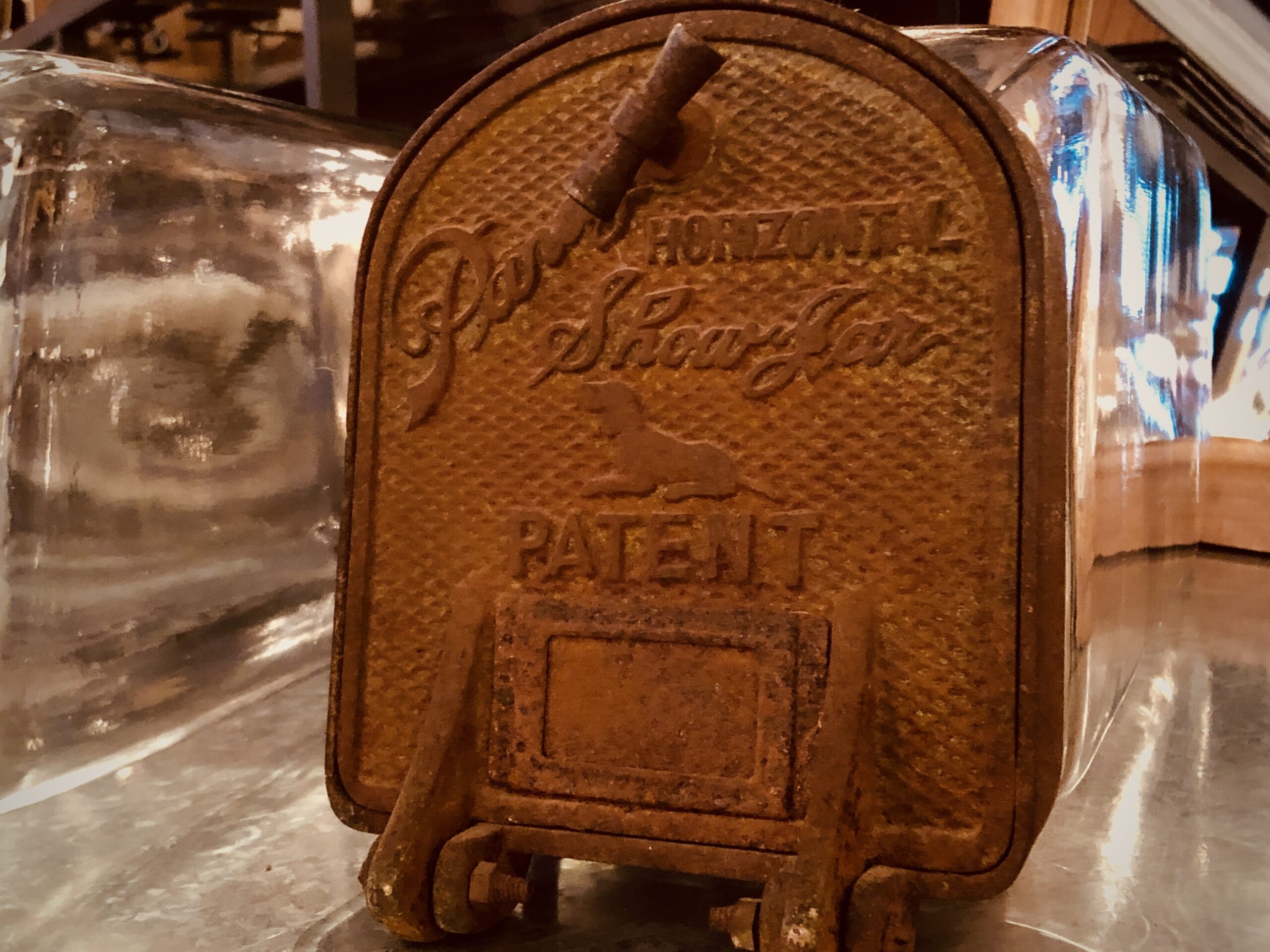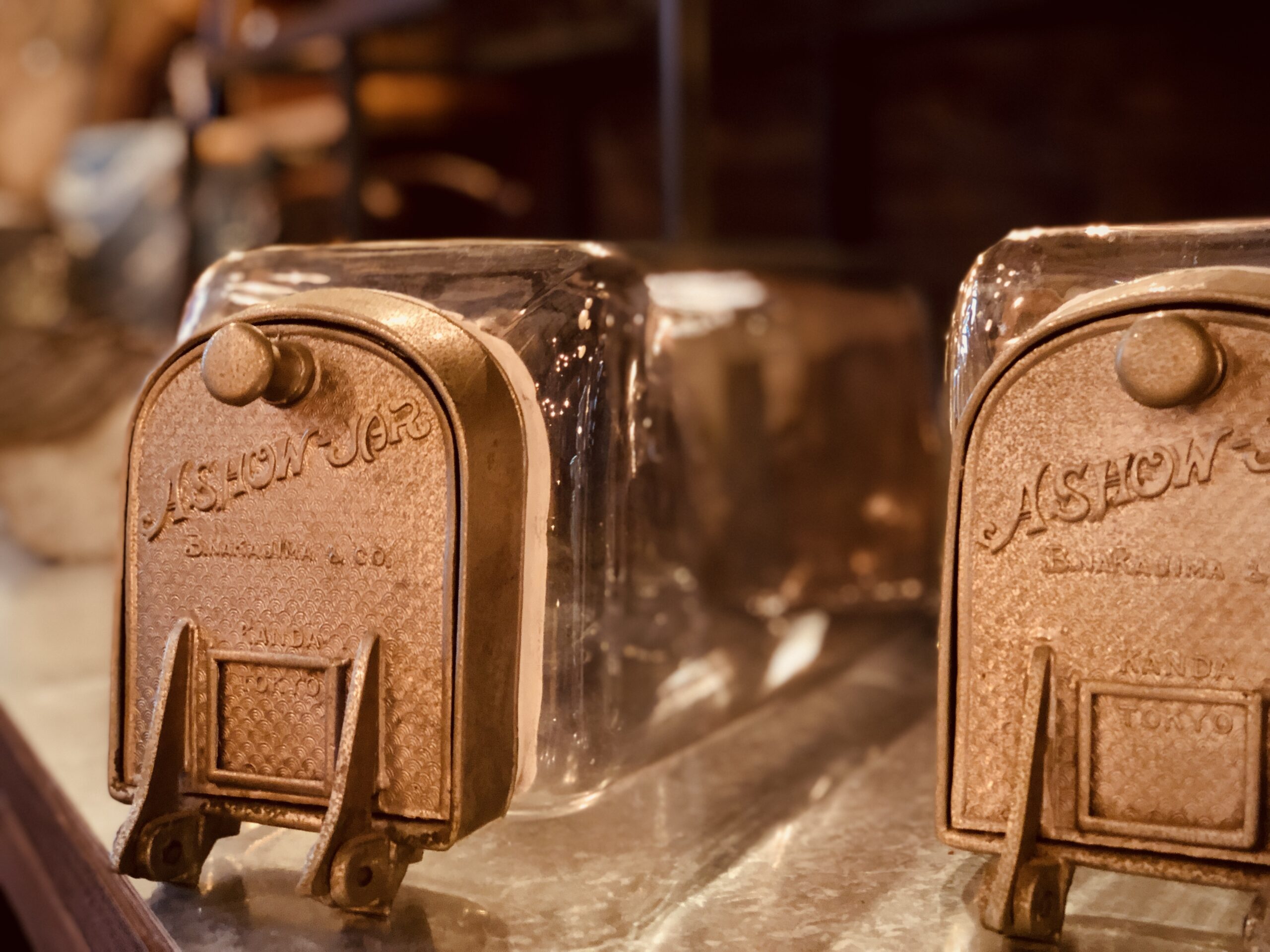 鉄製の蓋が付いた横置きタイプの駄菓子ビンです。